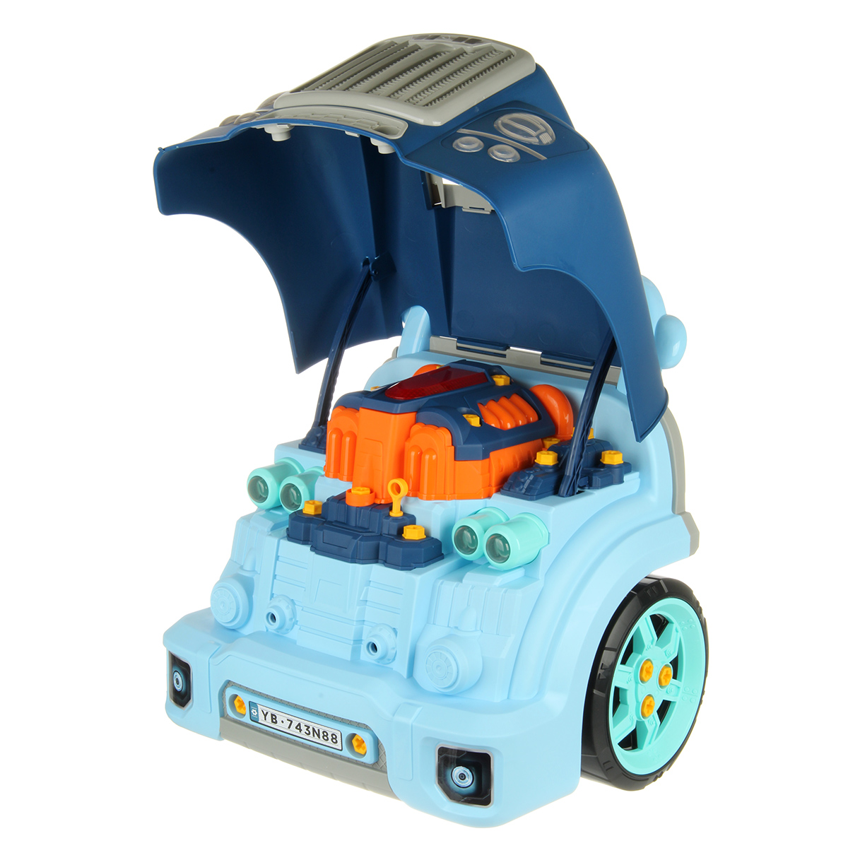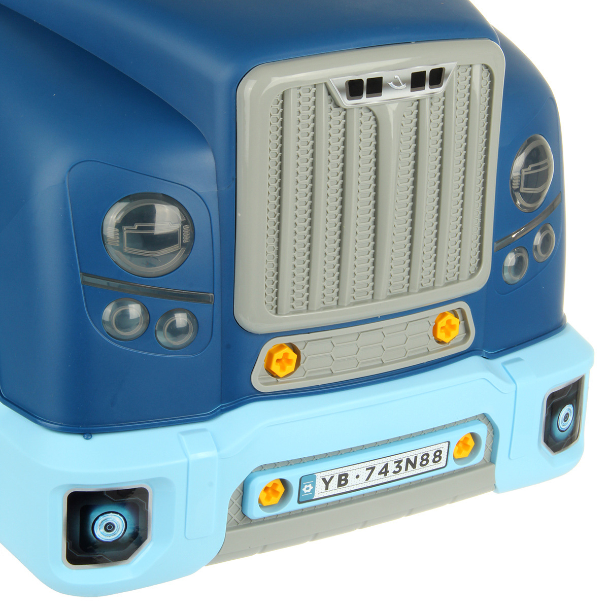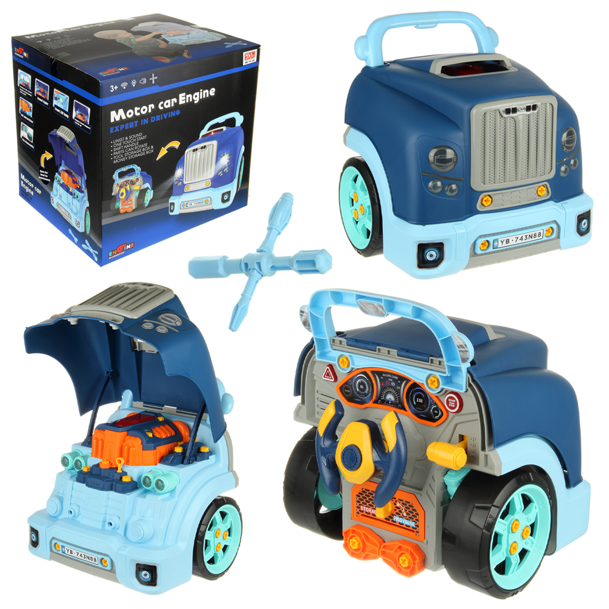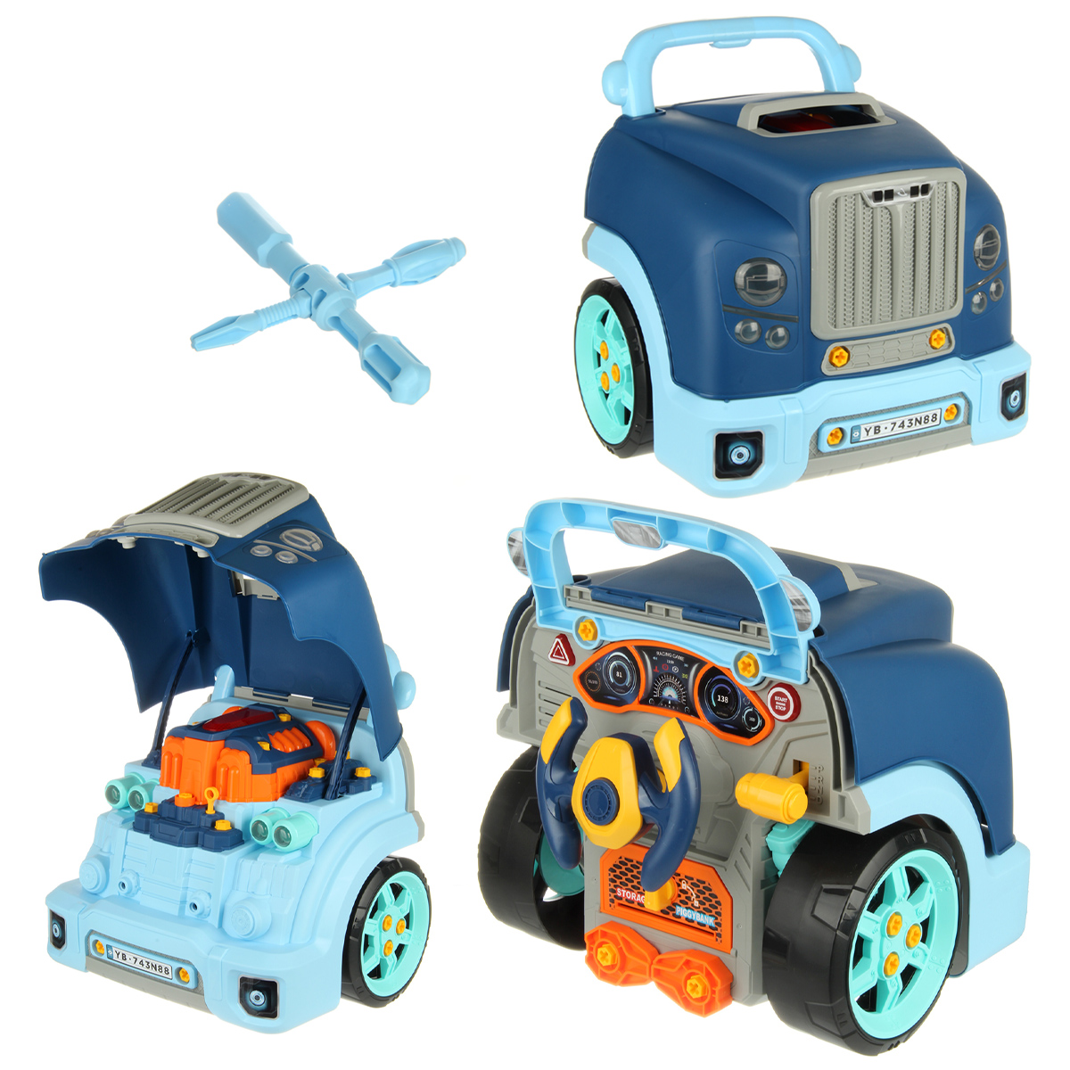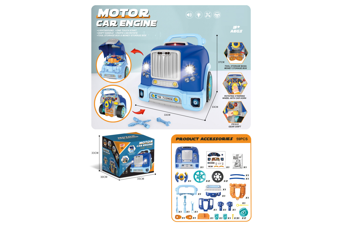 Конструктор для мальчика, выполненный в виде передней части грузового автомобиля, это роскошная игрушка для каждого ребенка. Отсек для мелочей, клаксон на крутящемся руле, складные подставки для подъема автомобиля, открывающийся капот, щуп для имитации проверки уровня масла.