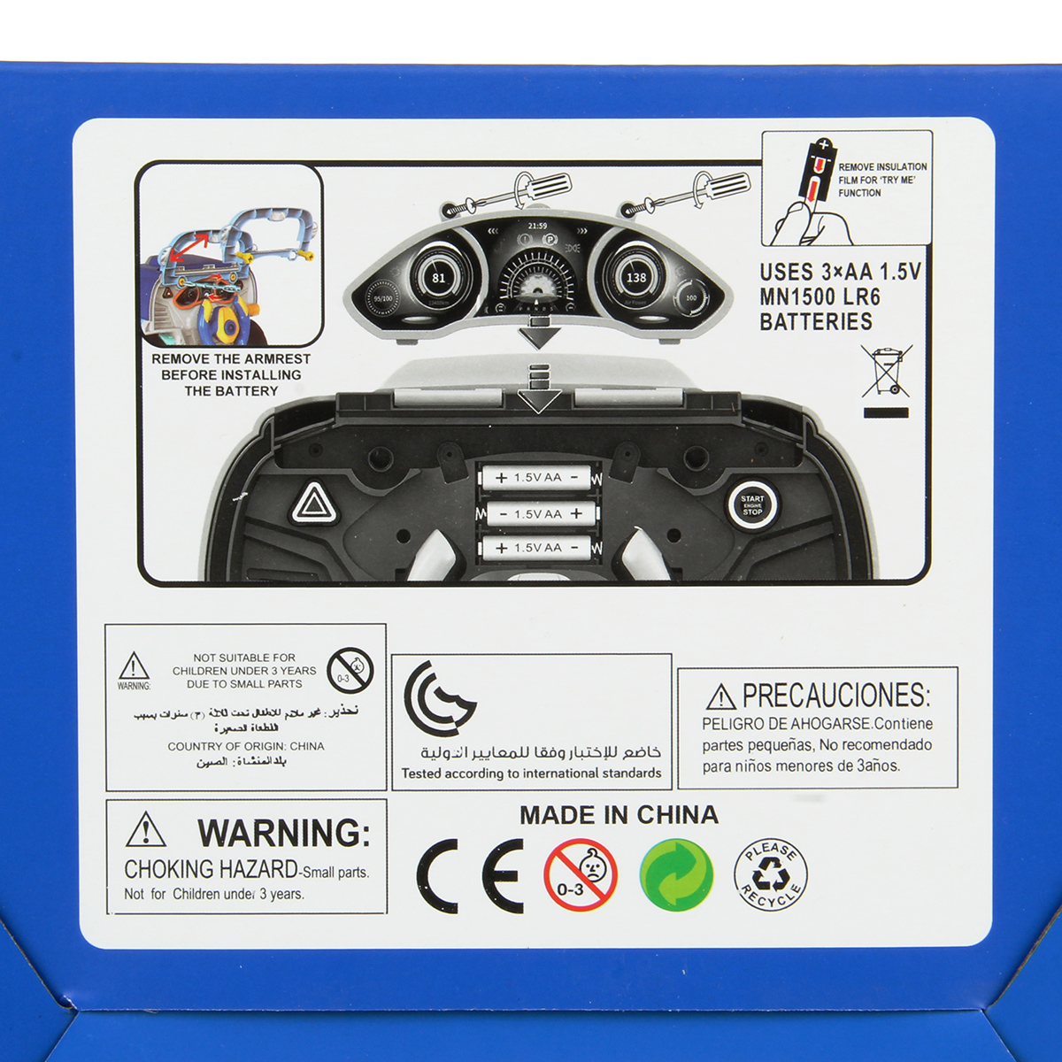 Игрушка работает от 3 батареек АА, не входят в комплект. Чтобы вставить батарейки, снимите крышку приборной доски, отвинтив 2 винта, под доской отсек для батареек.