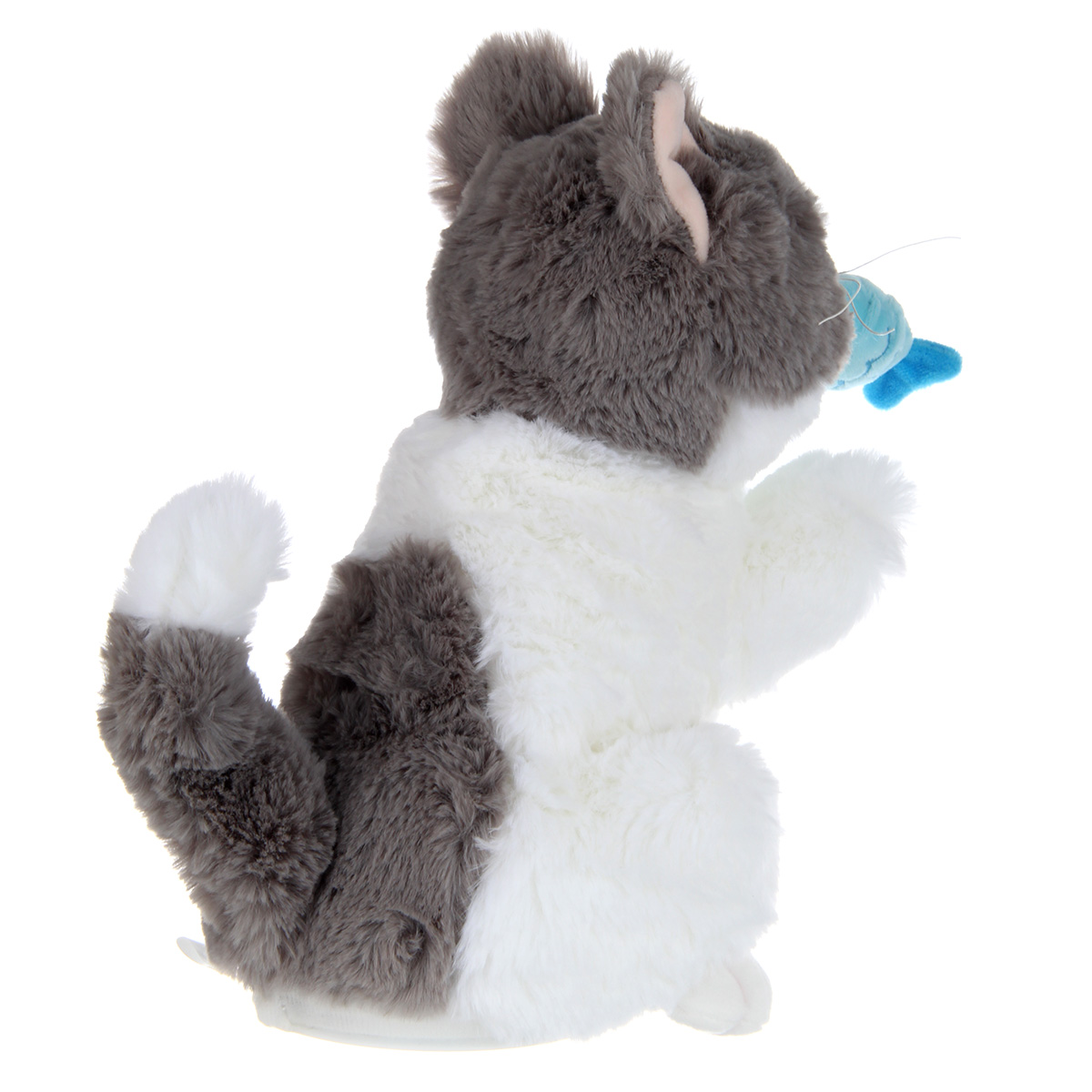 2. При оттягивании рыбки, рыбка на веревочке, издает звуки кормления, мяукает, шевелит хвостиком.