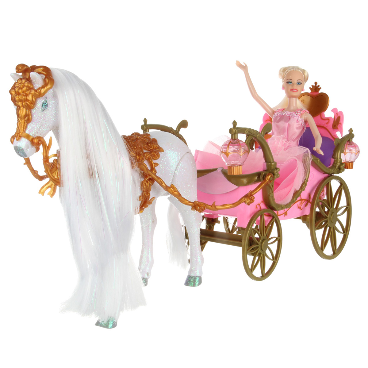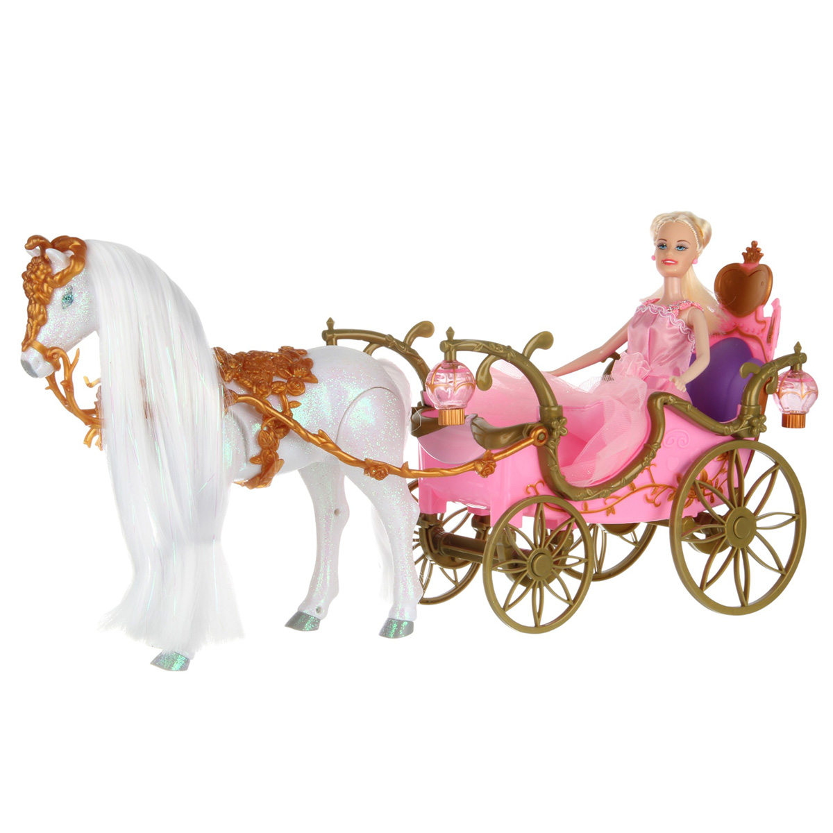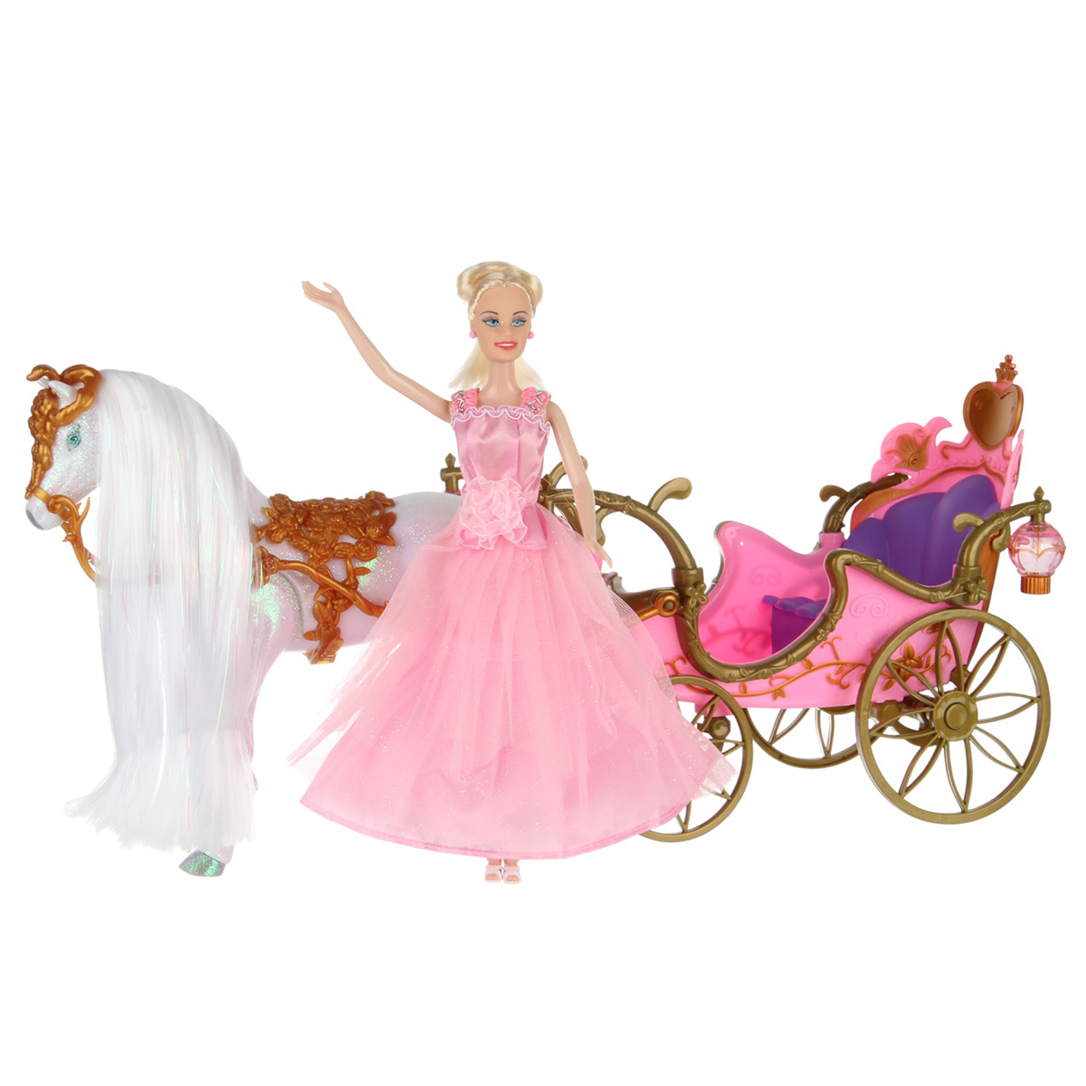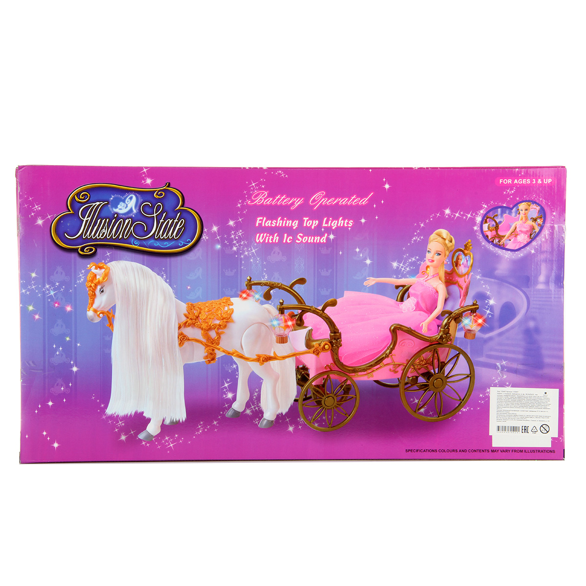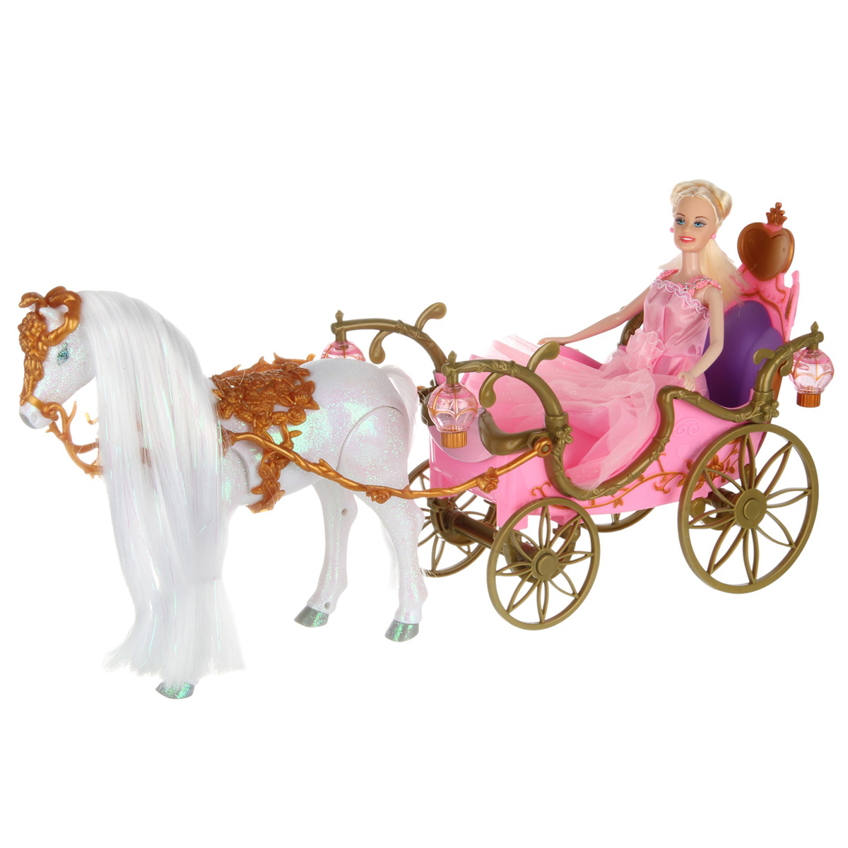 Игровой набор кукла принцесса в карете с лошадкой со световыми и звуковыми эффектами и аксессуарами. Фонарики на карете с меняющейся подсветкой, лошадка идёт вперёд, передвигая ноги и опуская голову, издает ржание, фыркает, звук стука копыт, у куклы подвижные руки и ноги, голова, элегантное платье. Съёмные аксессуары, волосы куклы длинные и красивые, можно делать различные прически, у лошадки расчесывать гриву. Прочные и долговечные материалы, качественное исполнение, стильный дизайн, приятная расцветка.