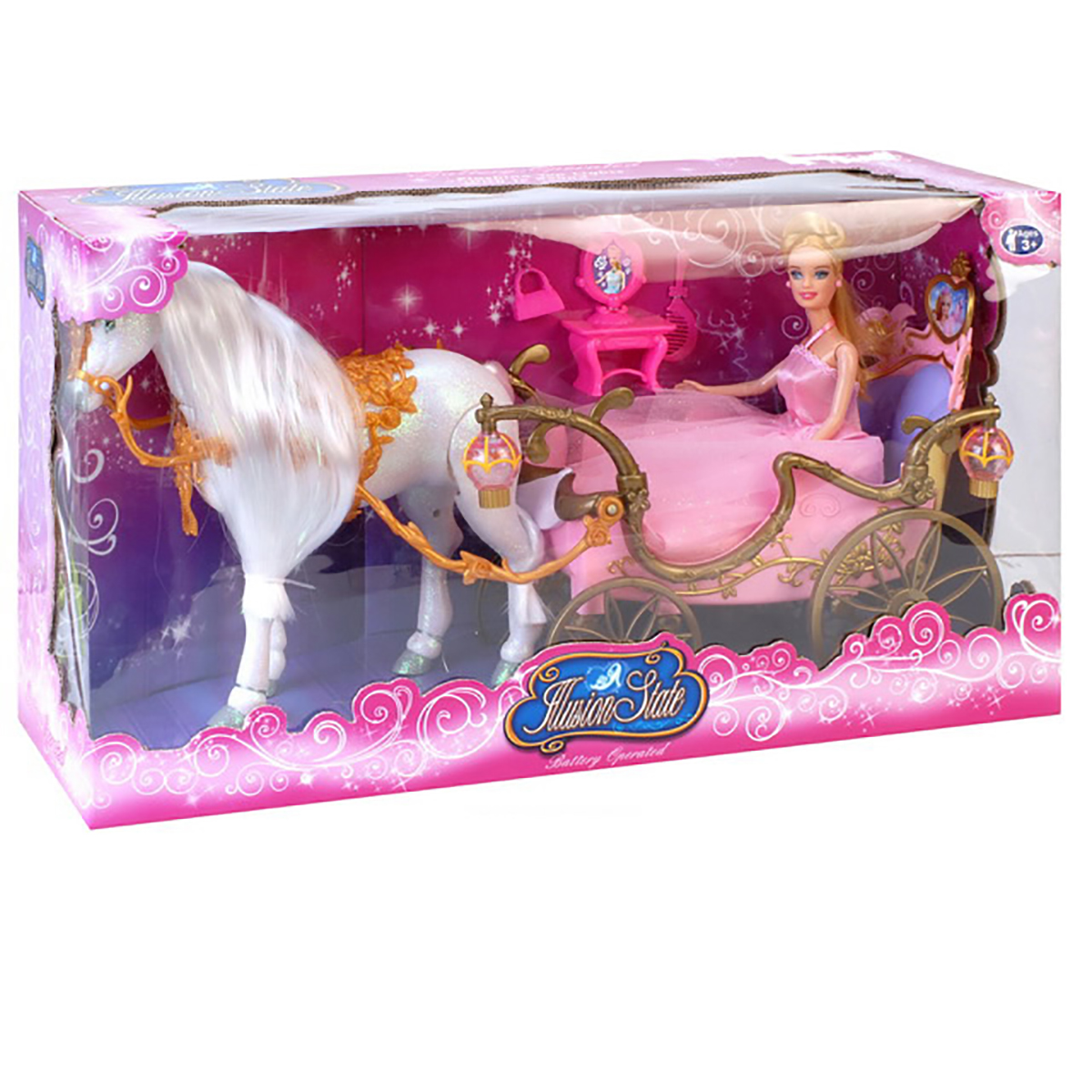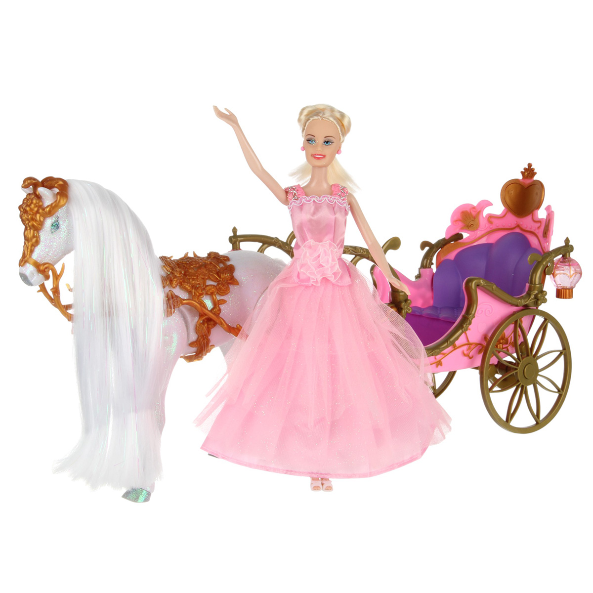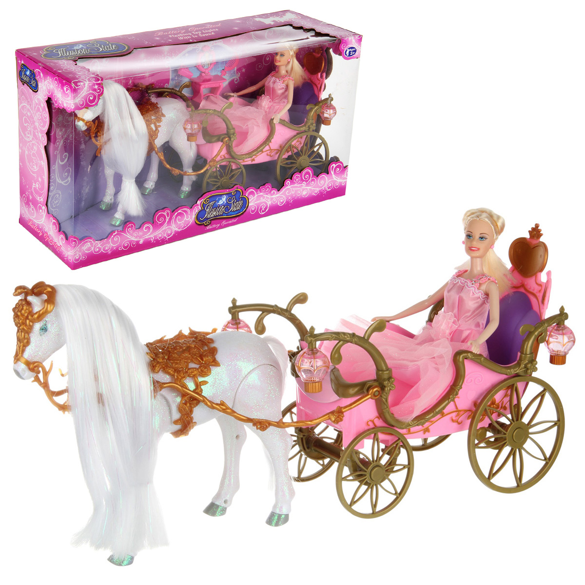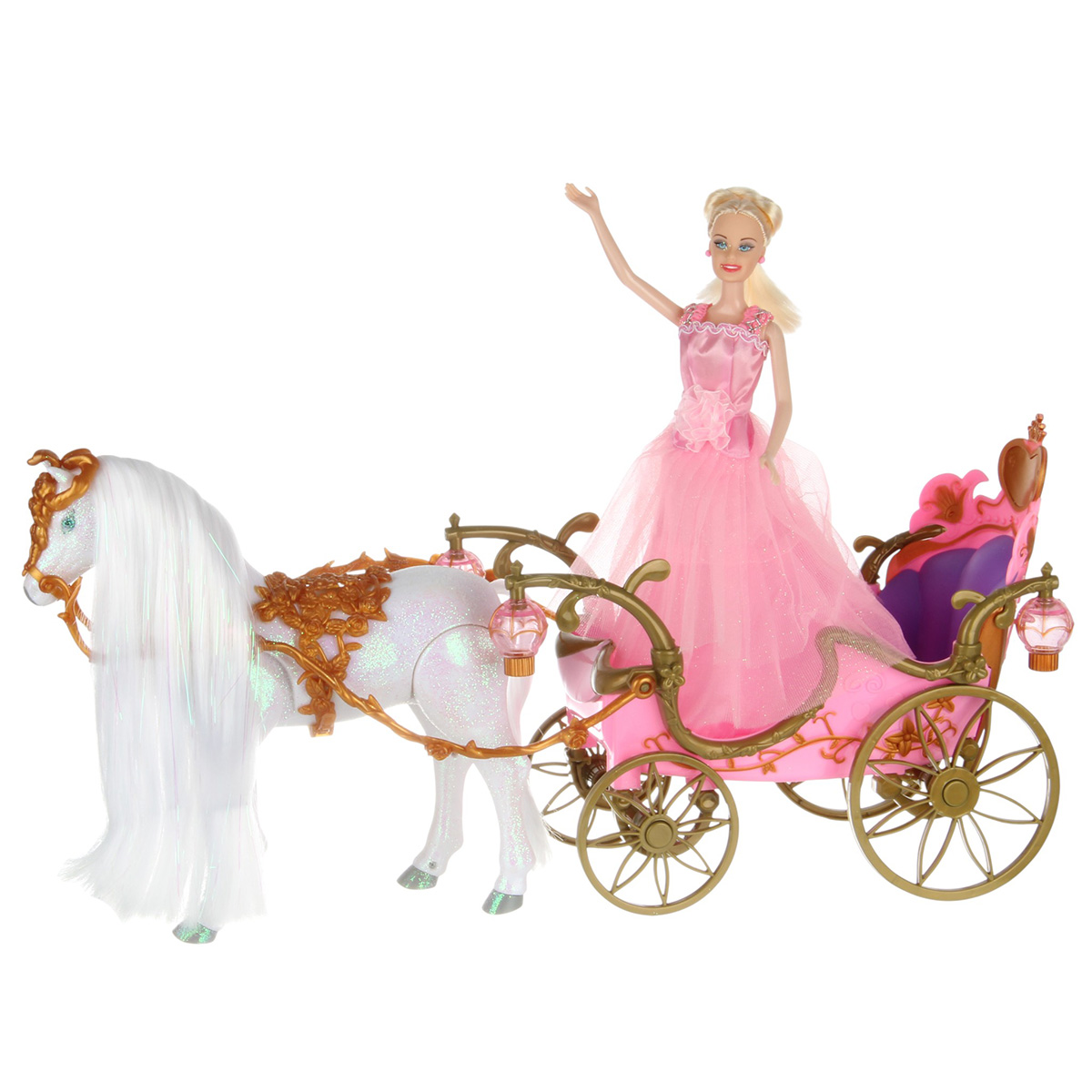 Игровой набор кукла принцесса в карете с лошадкой со световыми и звуковыми эффектами и аксессуарами. Фонарики на карете с меняющейся подсветкой, лошадка идёт вперёд, передвигая ноги и опуская голову, издает ржание, фыркает, звук стука копыт, у куклы подвижные руки и ноги, голова, элегантное платье. Съёмные аксессуары, волосы куклы длинные и красивые, можно делать различные прически, у лошадки расчесывать гриву. Прочные и долговечные материалы, качественное исполнение, стильный дизайн, приятная расцветка.