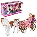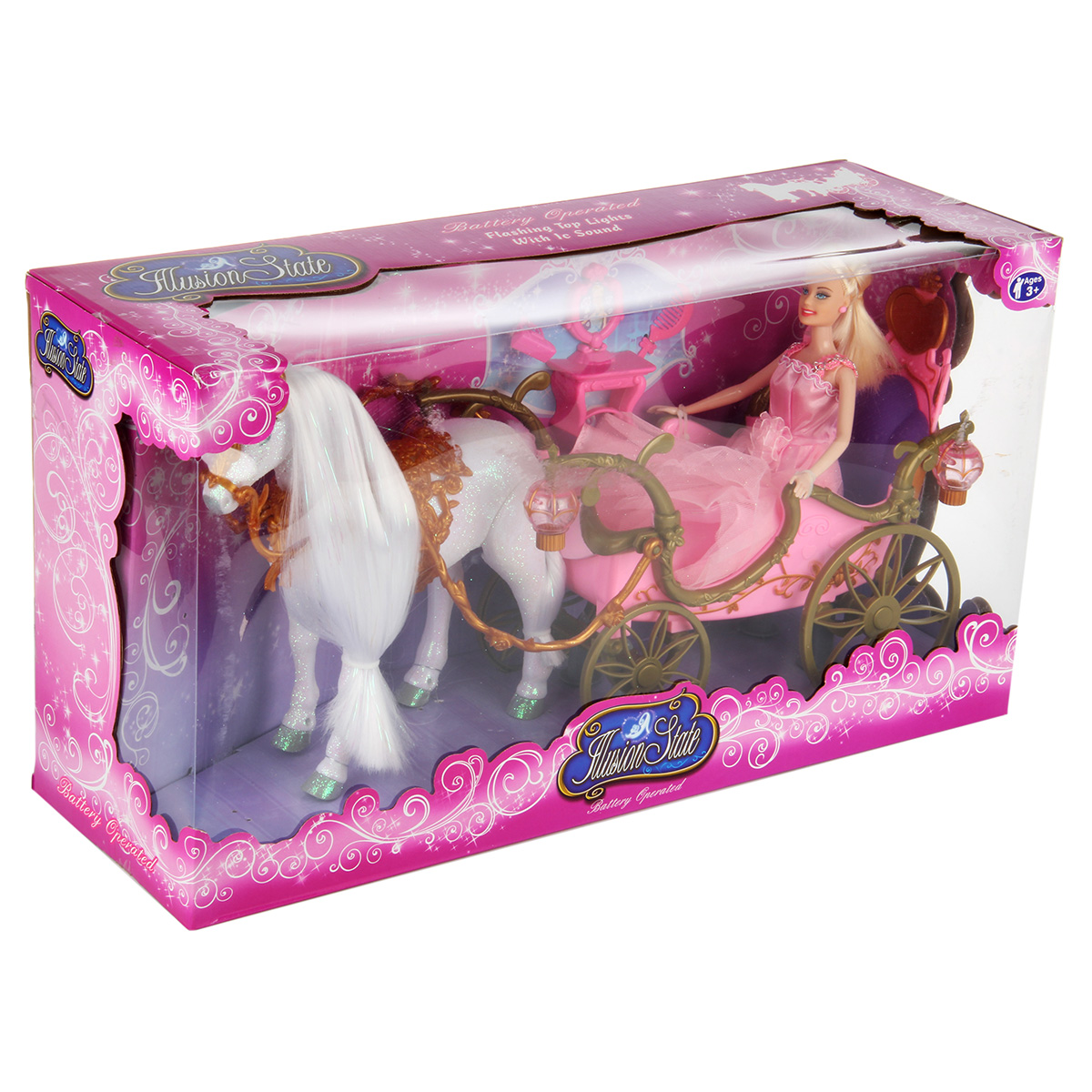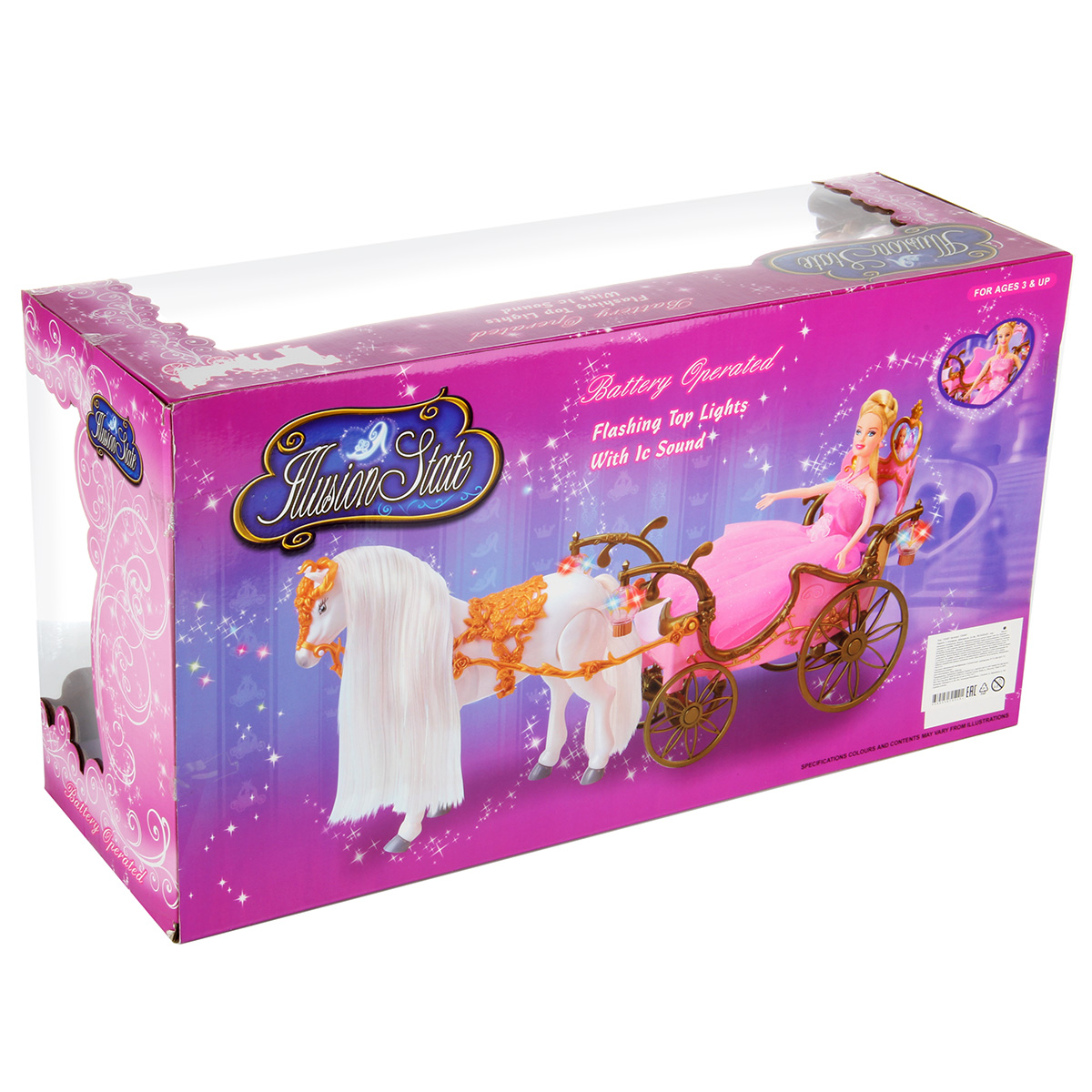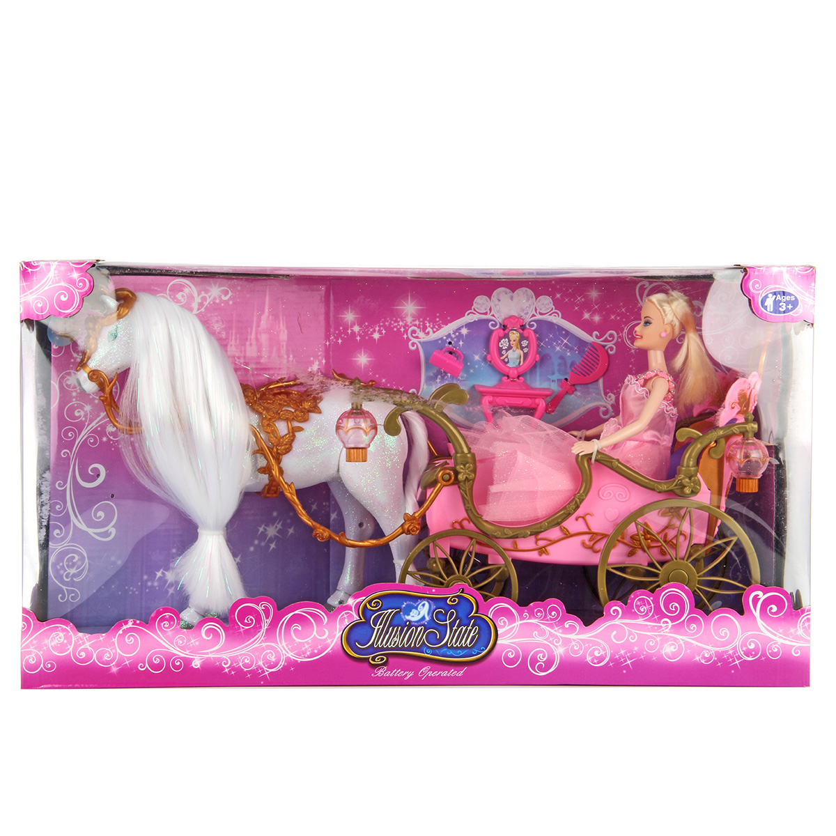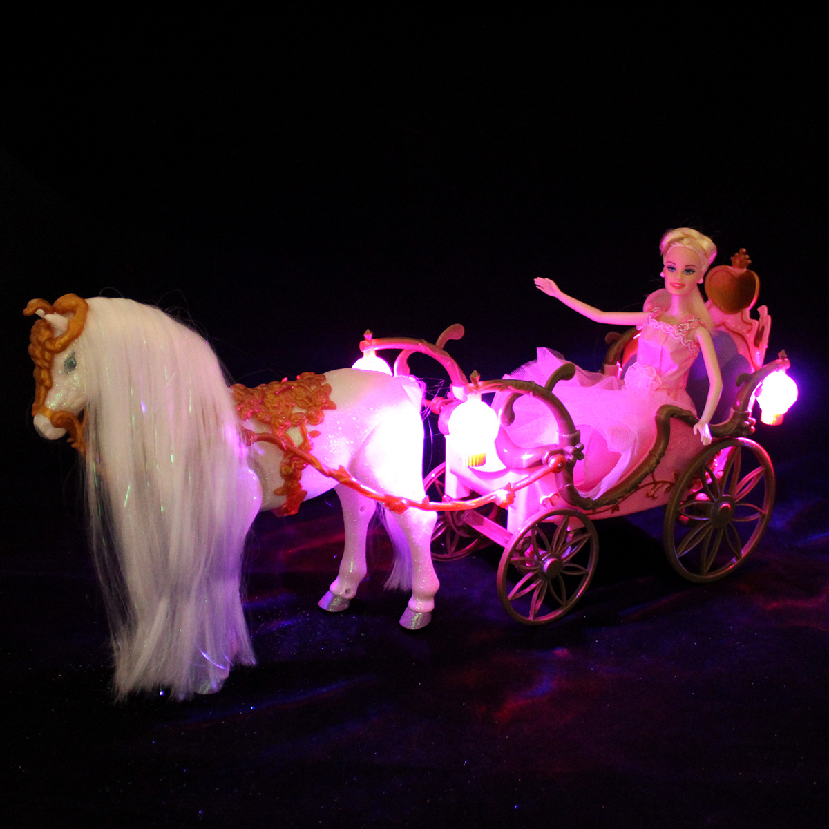 Игровой набор кукла принцесса в карете с лошадкой со световыми и звуковыми эффектами и аксессуарами. Фонарики на карете с меняющейся подсветкой, лошадка идёт вперёд, передвигая ноги и опуская голову, издает ржание, фыркает, звук стука копыт, у куклы подвижные руки и ноги, голова, элегантное платье. Съёмные аксессуары, волосы куклы длинные и красивые, можно делать различные прически, у лошадки расчесывать гриву. Прочные и долговечные материалы, качественное исполнение, стильный дизайн, приятная расцветка.