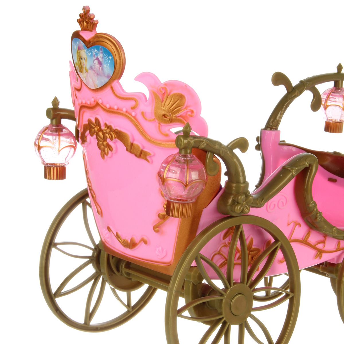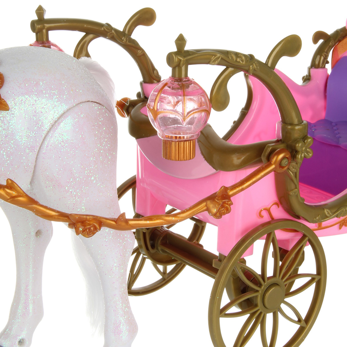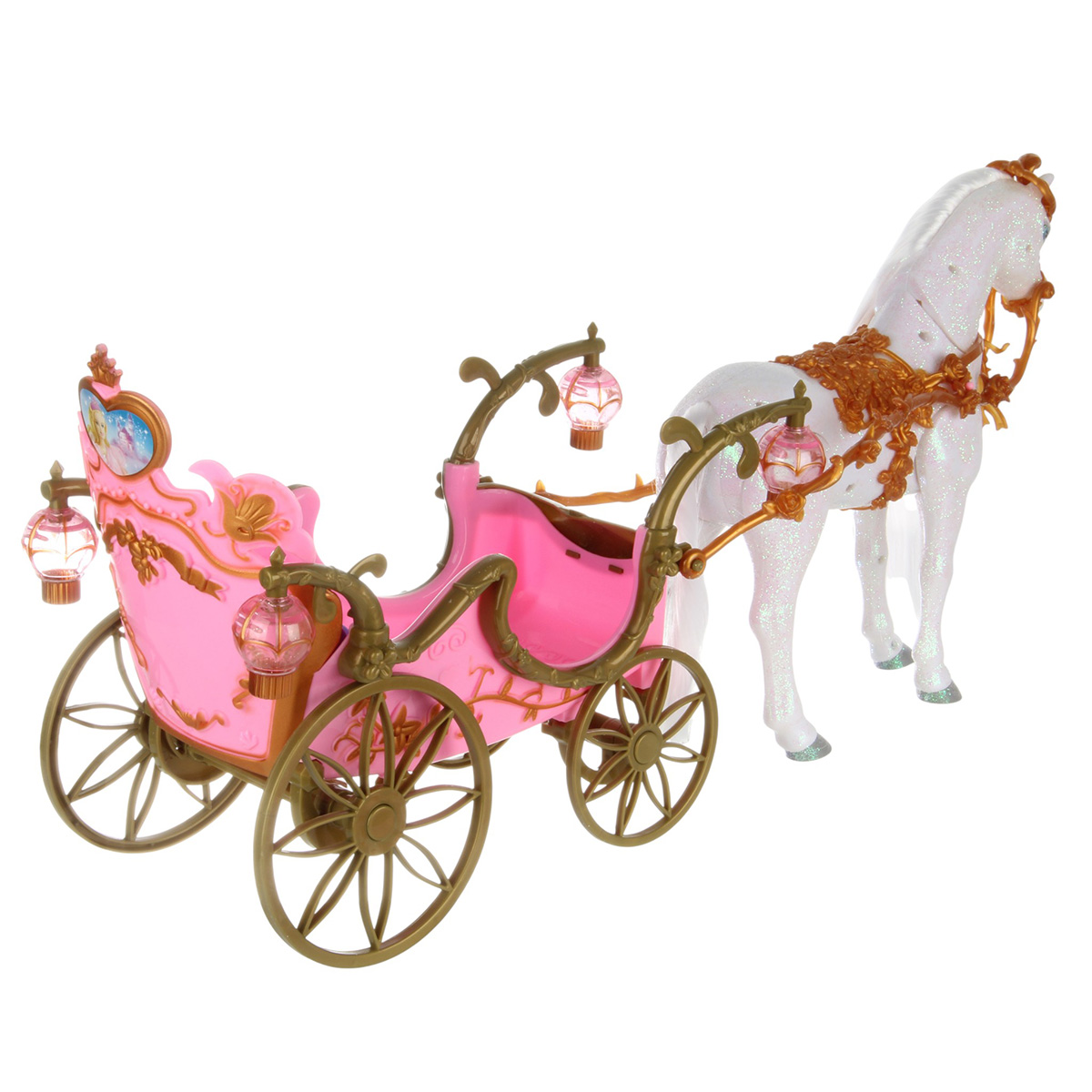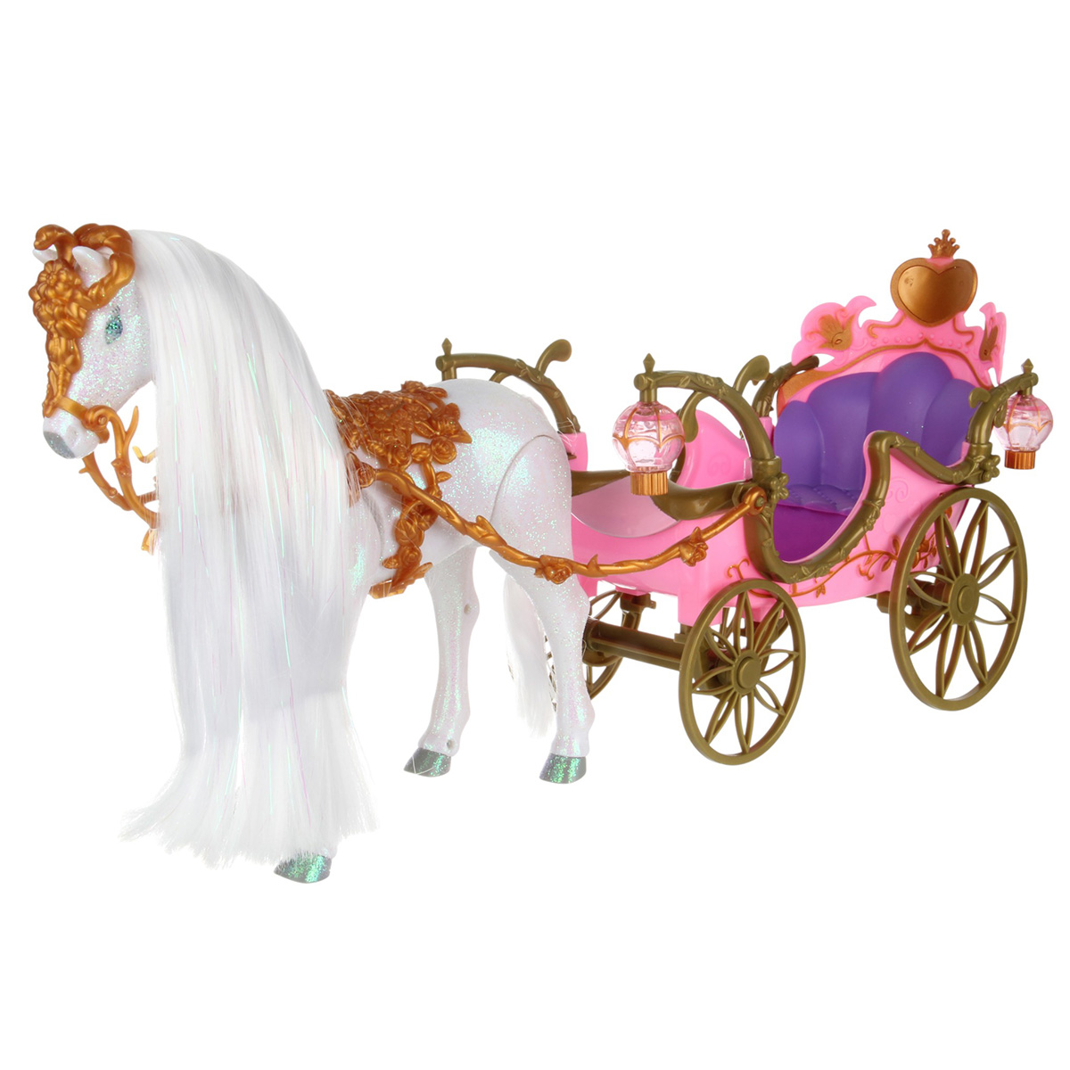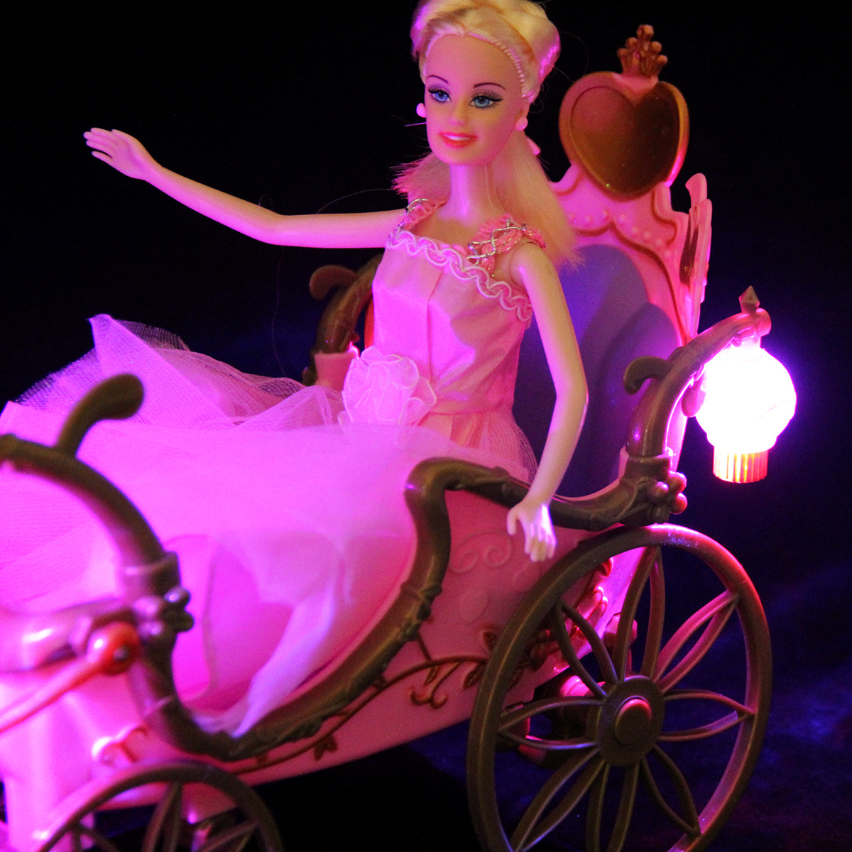 Игровой набор кукла принцесса в карете с лошадкой со световыми и звуковыми эффектами и аксессуарами. Фонарики на карете с меняющейся подсветкой, лошадка идёт вперёд, передвигая ноги и опуская голову, издает ржание, фыркает, звук стука копыт, у куклы подвижные руки и ноги, голова, элегантное платье. Съёмные аксессуары, волосы куклы длинные и красивые, можно делать различные прически, у лошадки расчесывать гриву. Прочные и долговечные материалы, качественное исполнение, стильный дизайн, приятная расцветка.