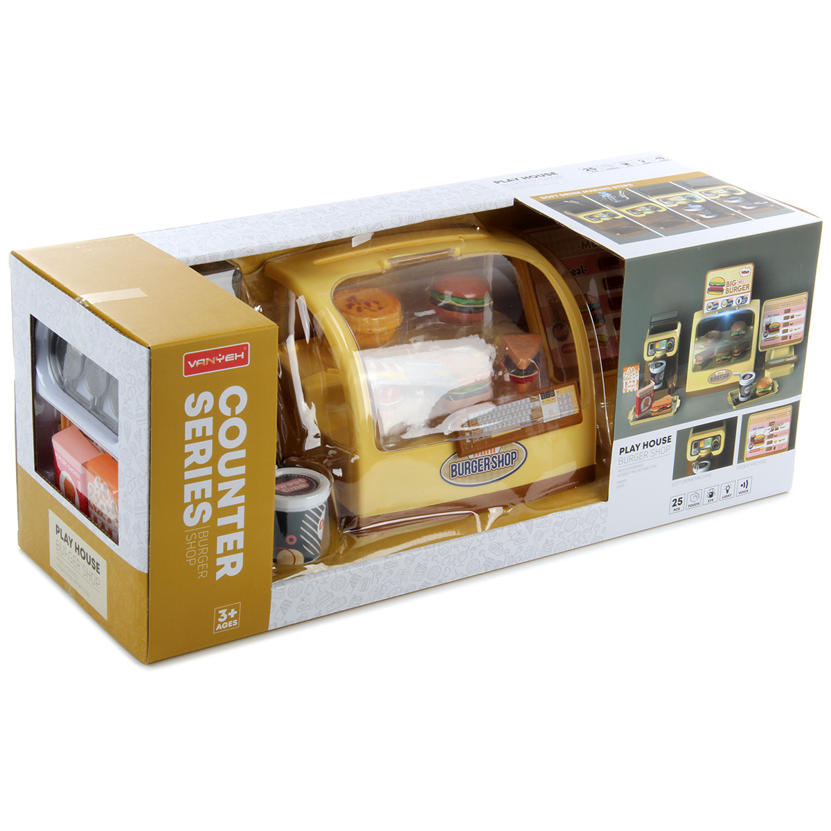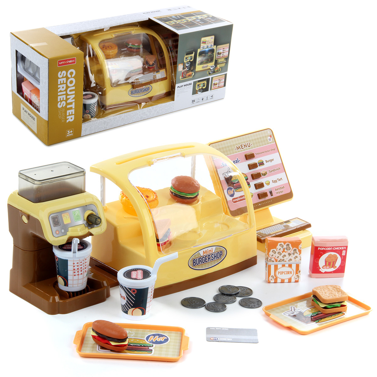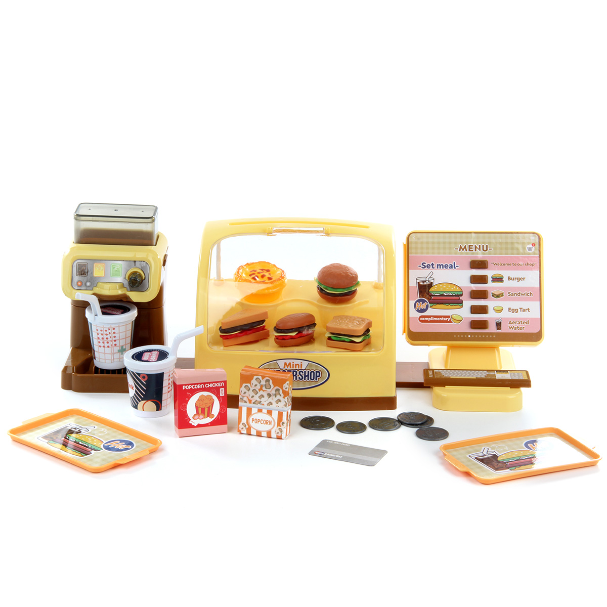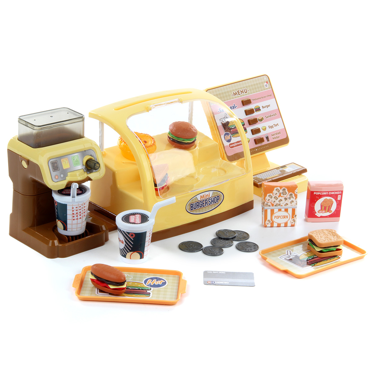 Открываем магазин, самый настоящий. Здесь можно купить продукты, расплатившись купюрами, монетами или кредитной картой. В комплект входит касса, автомат с напитками, шкаф для бургеров, 5 пластиковых бургеров, 2 подноса, 2 стакана, 2 коробки попкорна, кредитная карта, 6 пластиковых монет. Функционал игрушки: -шкаф подсвечивается, крышка шкафа открывается; -крышка автомата открывается и имеет ёмкость для воды, после поворота колеса вода начинает поступать в стакан; -крышки стаканов открываются; -касса реагирует на нажатие кнопок звуковым сигналом.