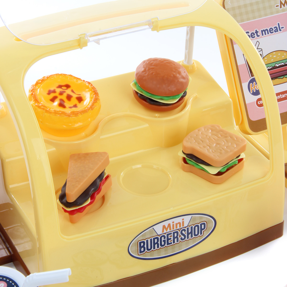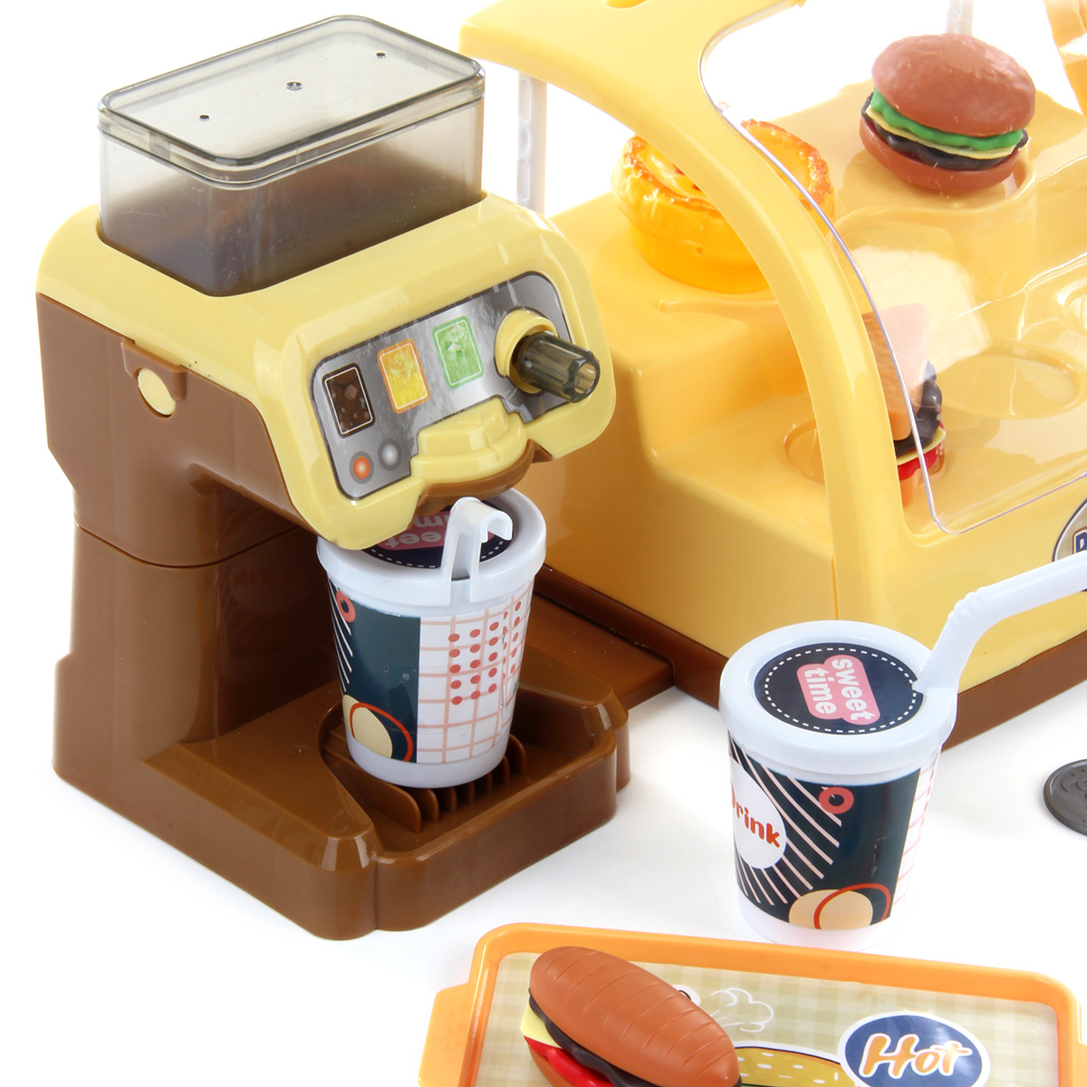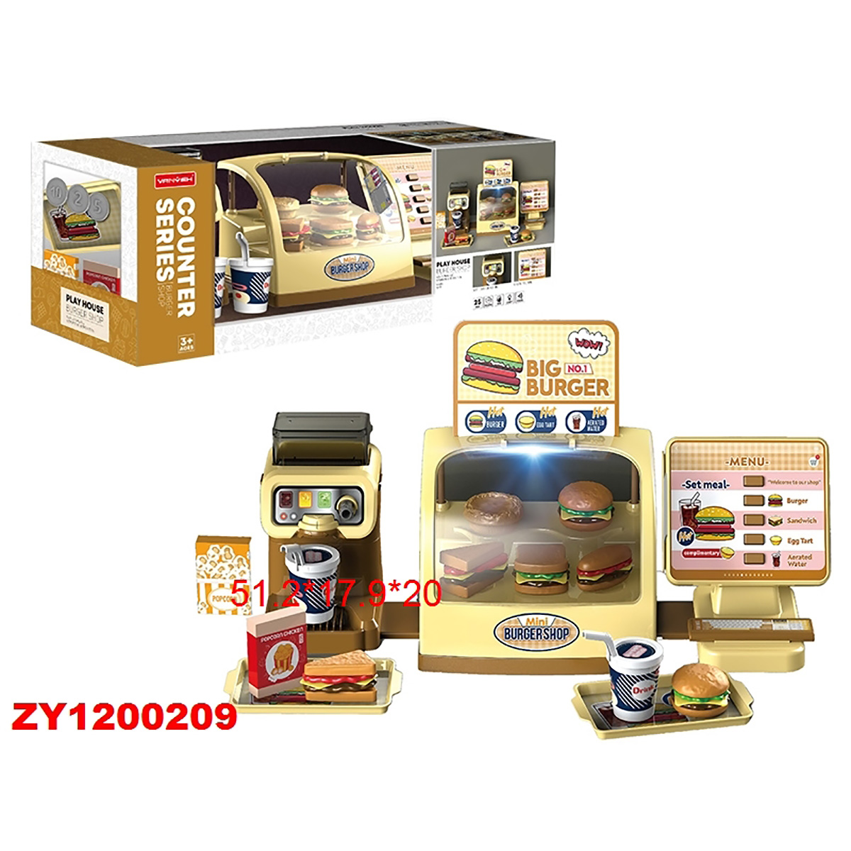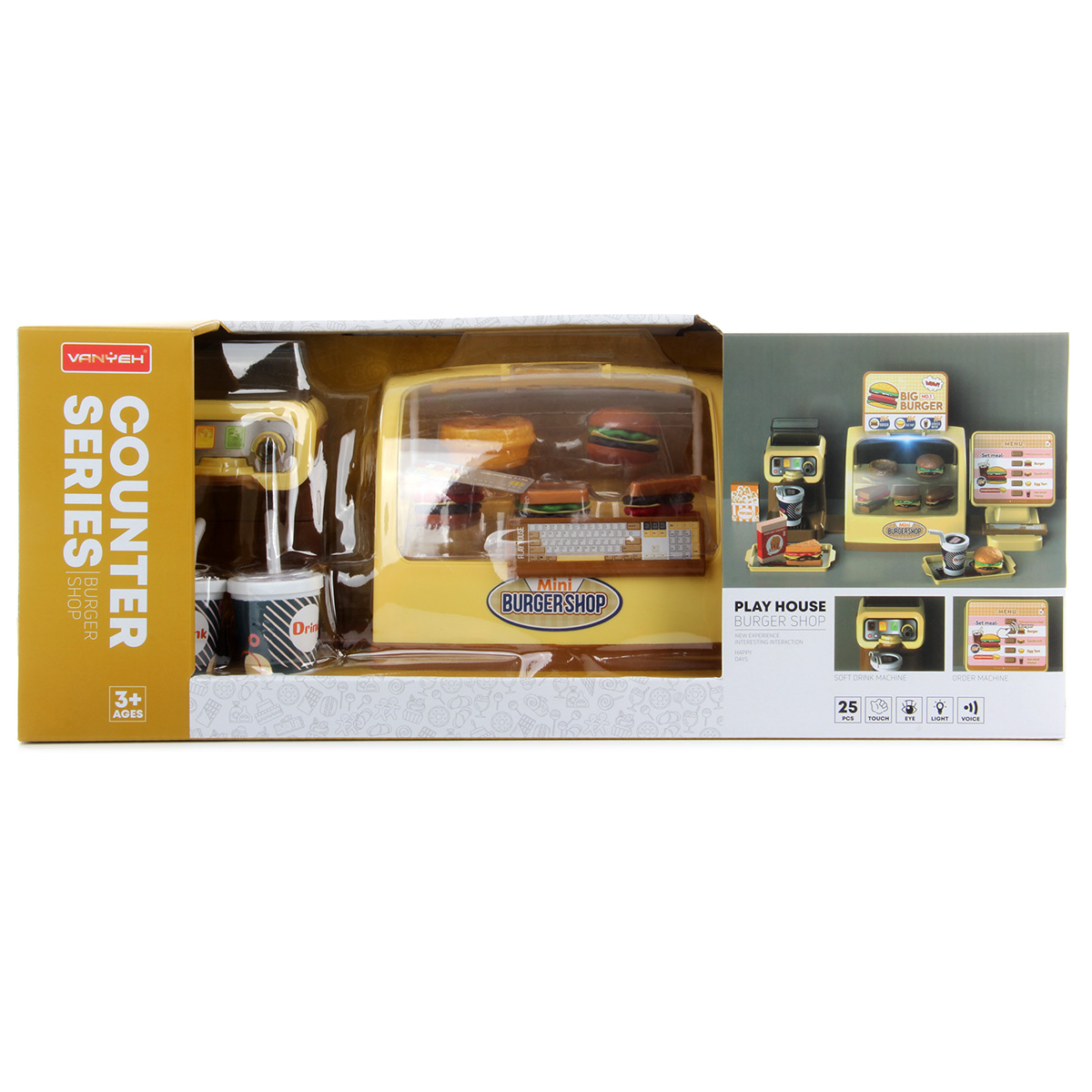 Открываем магазин, самый настоящий. Здесь можно купить продукты, расплатившись купюрами, монетами или кредитной картой. В комплект входит касса, автомат с напитками, шкаф для бургеров, 5 пластиковых бургеров, 2 подноса, 2 стакана, 2 коробки попкорна, кредитная карта, 6 пластиковых монет. Функционал игрушки: -шкаф подсвечивается, крышка шкафа открывается; -крышка автомата открывается и имеет ёмкость для воды, после поворота колеса вода начинает поступать в стакан; -крышки стаканов открываются; -касса реагирует на нажатие кнопок звуковым сигналом.
