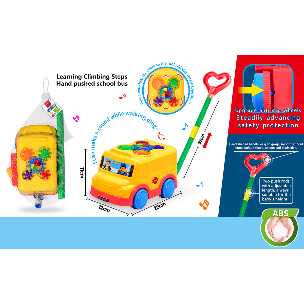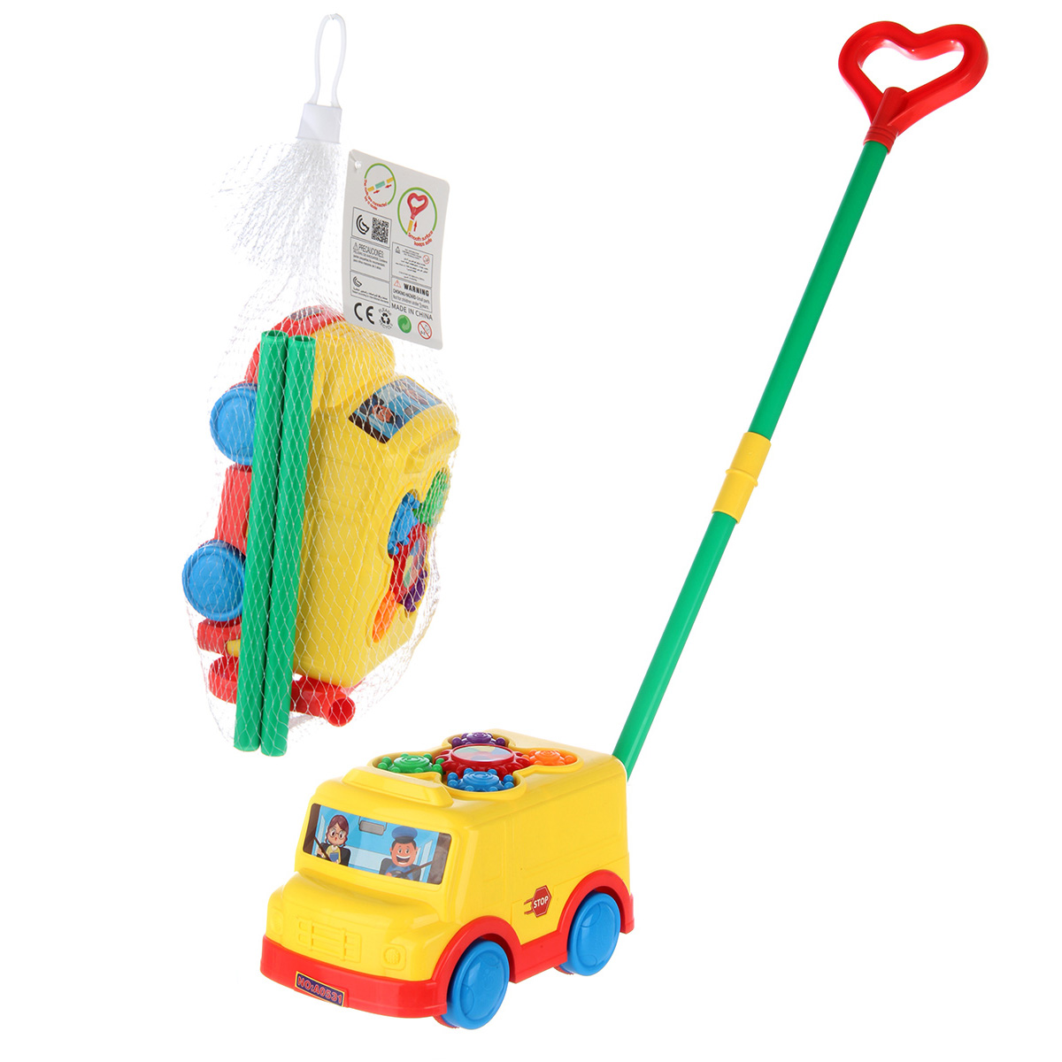 Детская каталка автобус на палке для развития мелкой моторики и сенсорных навыков малыша. Изготовлена из прочного и долговечного материала. Игрушка каталка оформлена в оригинальном дизайне и классической расцветке. Катается вперёд и назад. При движении у автобуса крутятся элементы на крыше, издают гремящий звук. Такая детская каталка с ручкой станет замечательным подарком детям, мальчику, девочке, на новый год, день рождения и на любой другой повод. С такой игрушкой малыш в игровой форме будет обучаться первым шагам. Подойдёт для улицы и дома, можно взять с собой в садик или на прогулку. 5 предметов. Детская игрушка изготовлена из качественного полимера. 5 предметов. Размер всей конструкции с палкой и ручкой 44х11х47 см. Размер автобуса 21х11х12 см. Длина палки 54 см. Размер ручки 9х1х8 см. Размер упаковки 33х16х12 см.