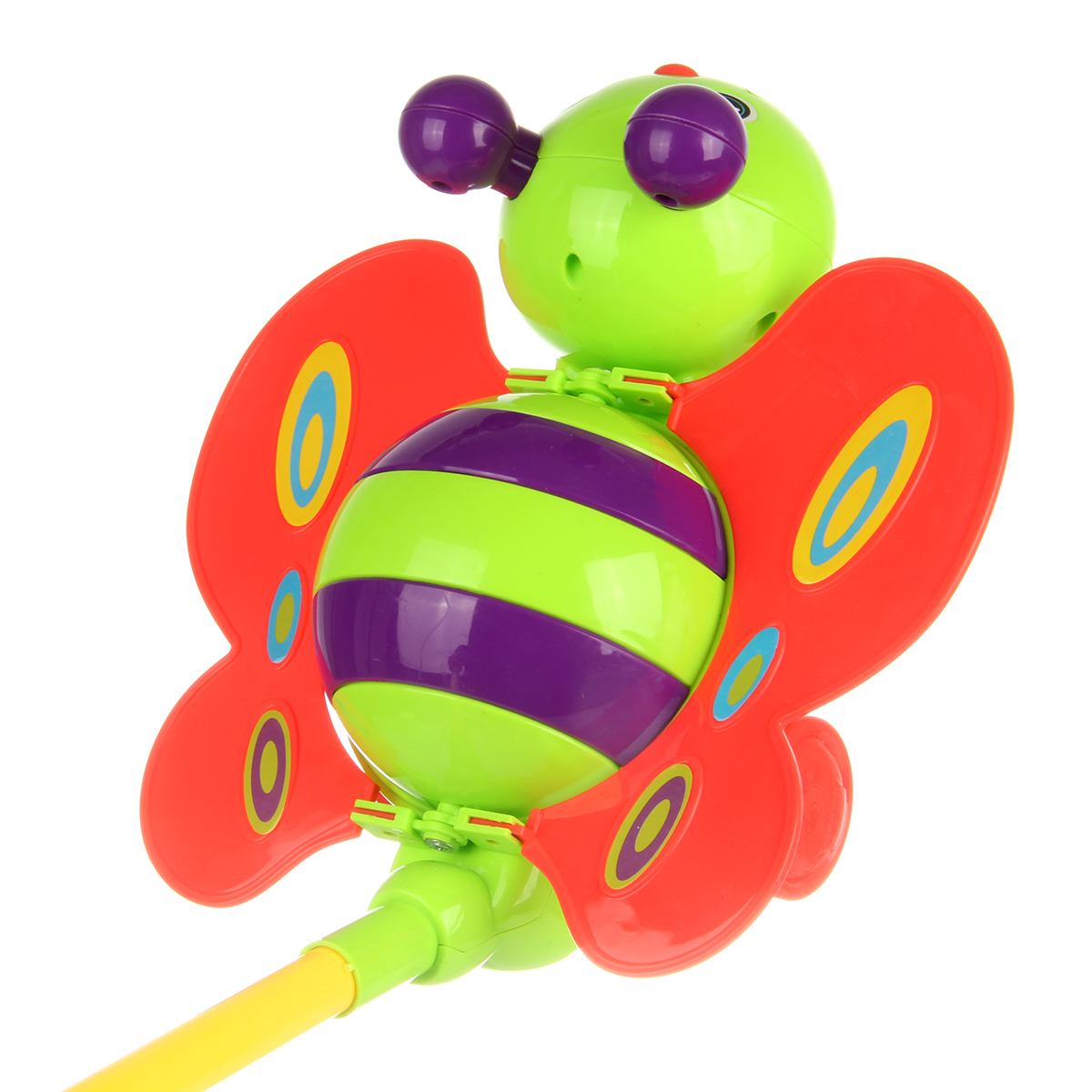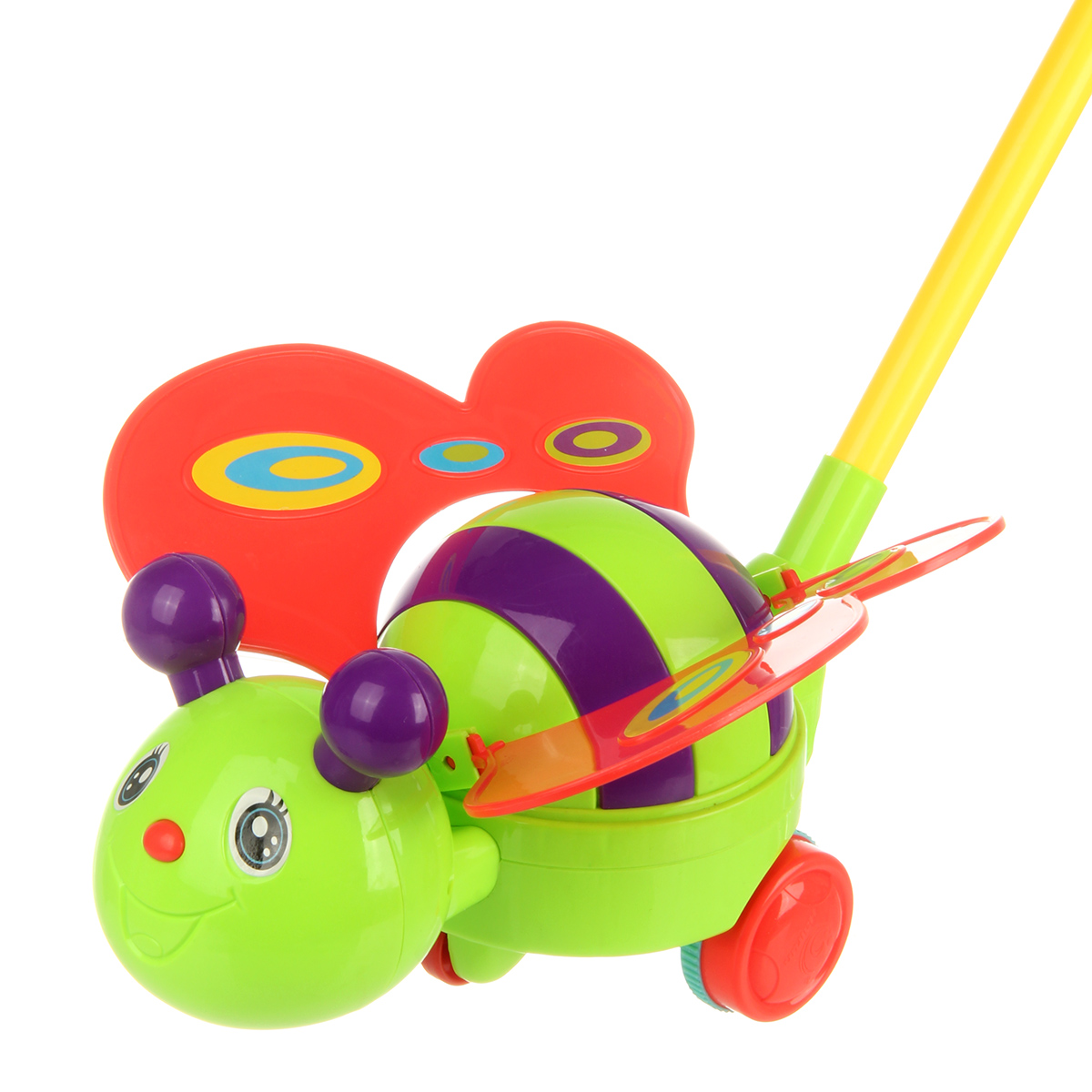 Каталка катается вперёд и назад со звенящим звуком, задние колеса частично прорезиненные. Когда игрушка катается, у неё двигаются крылышки.
