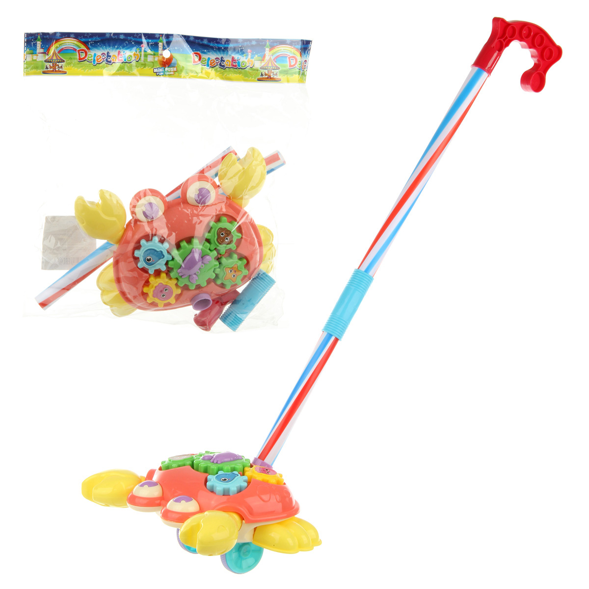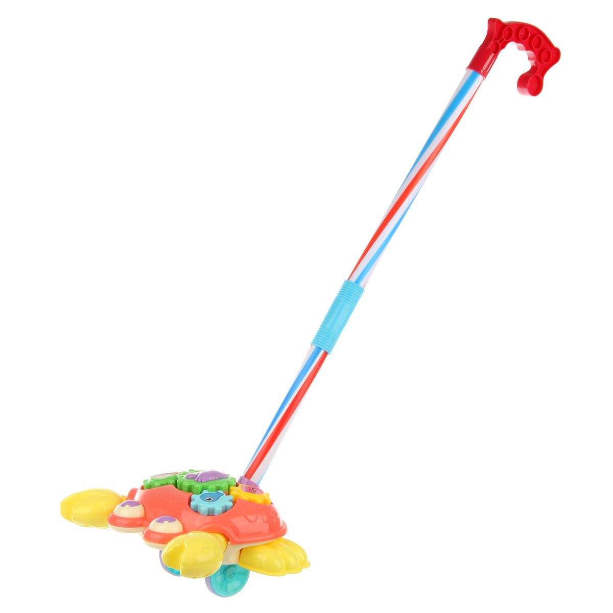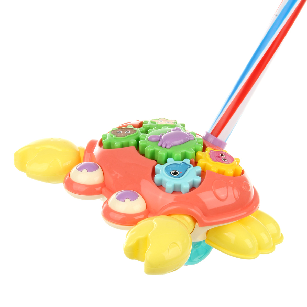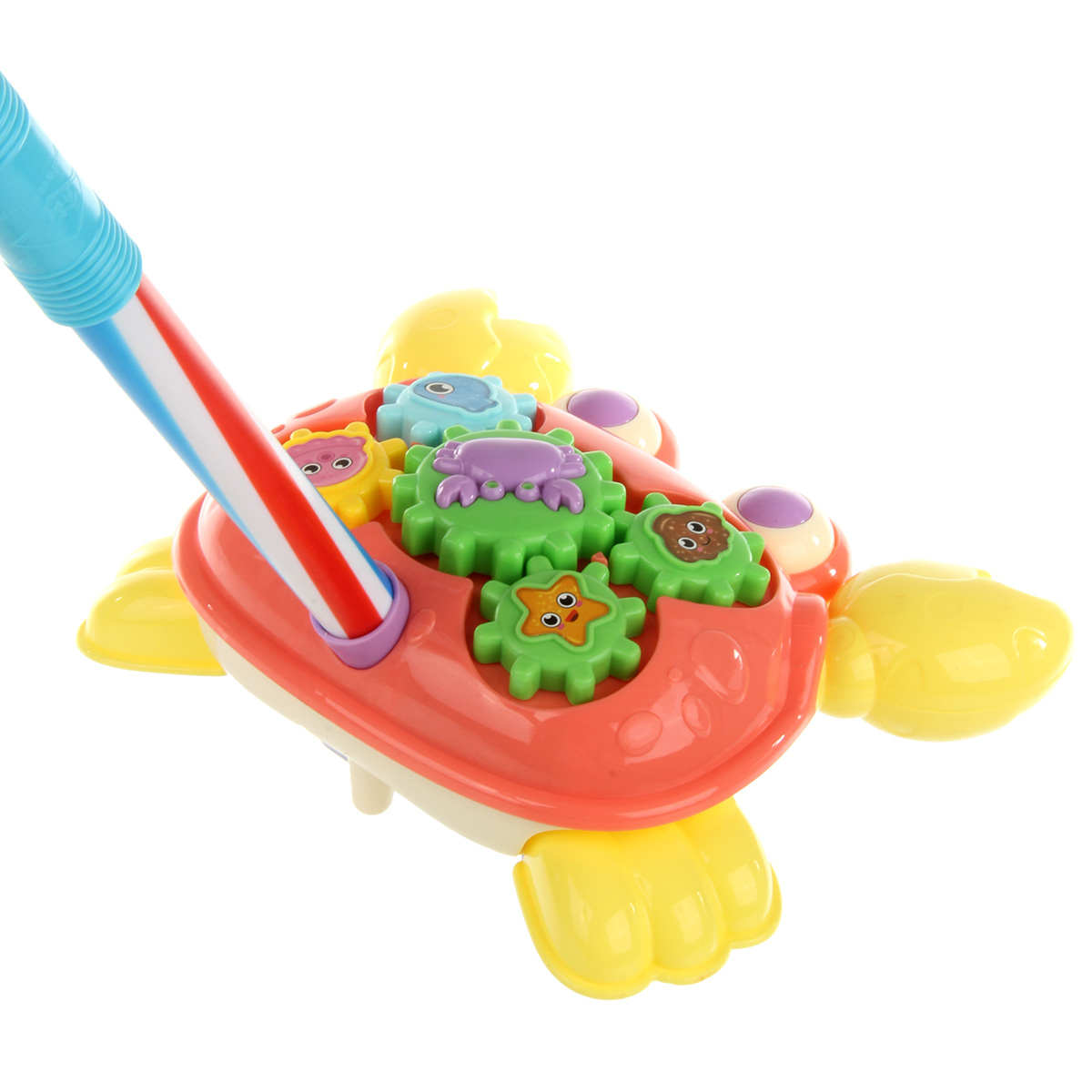 Детская игрушка каталка с вращающимися шестеренками и мелодичным перезвоном.
