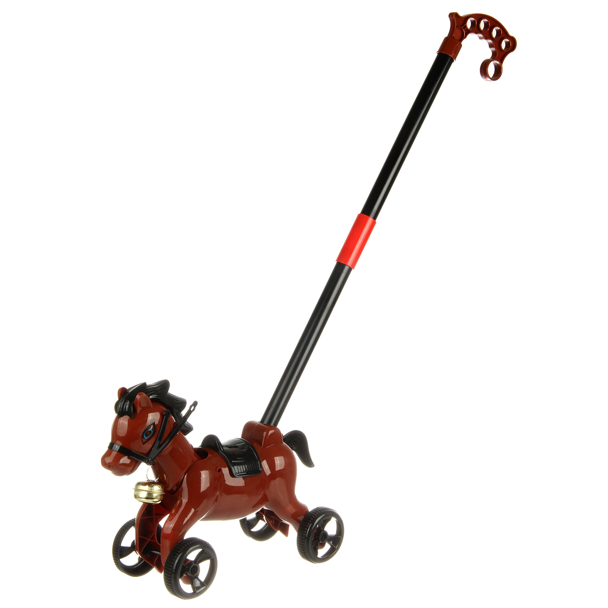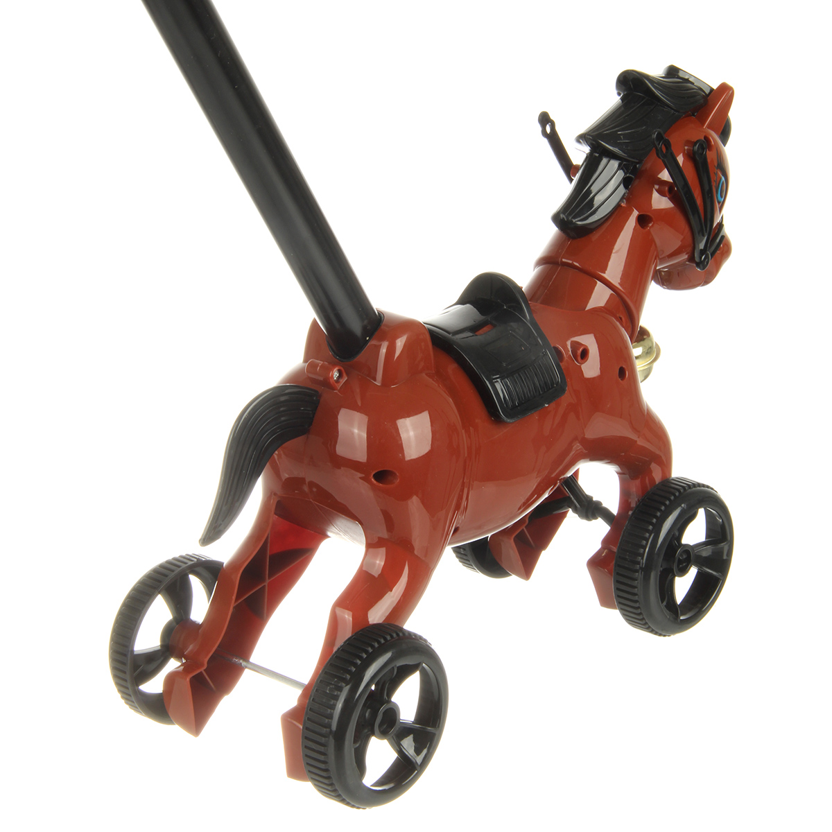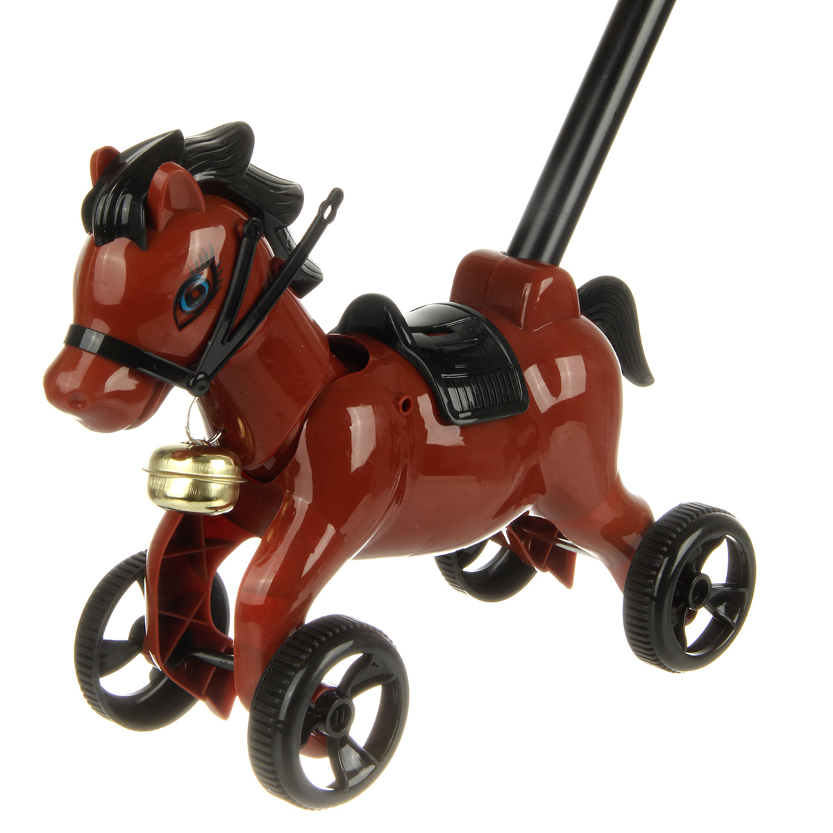 Каталка с бубенцом катается вперёд и назад со звенящим звуком. При передвижении лошадка наклоняет и поднимает голову.
