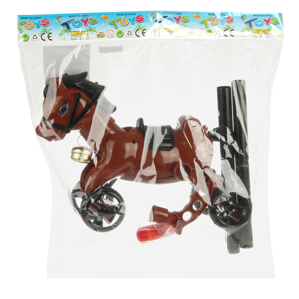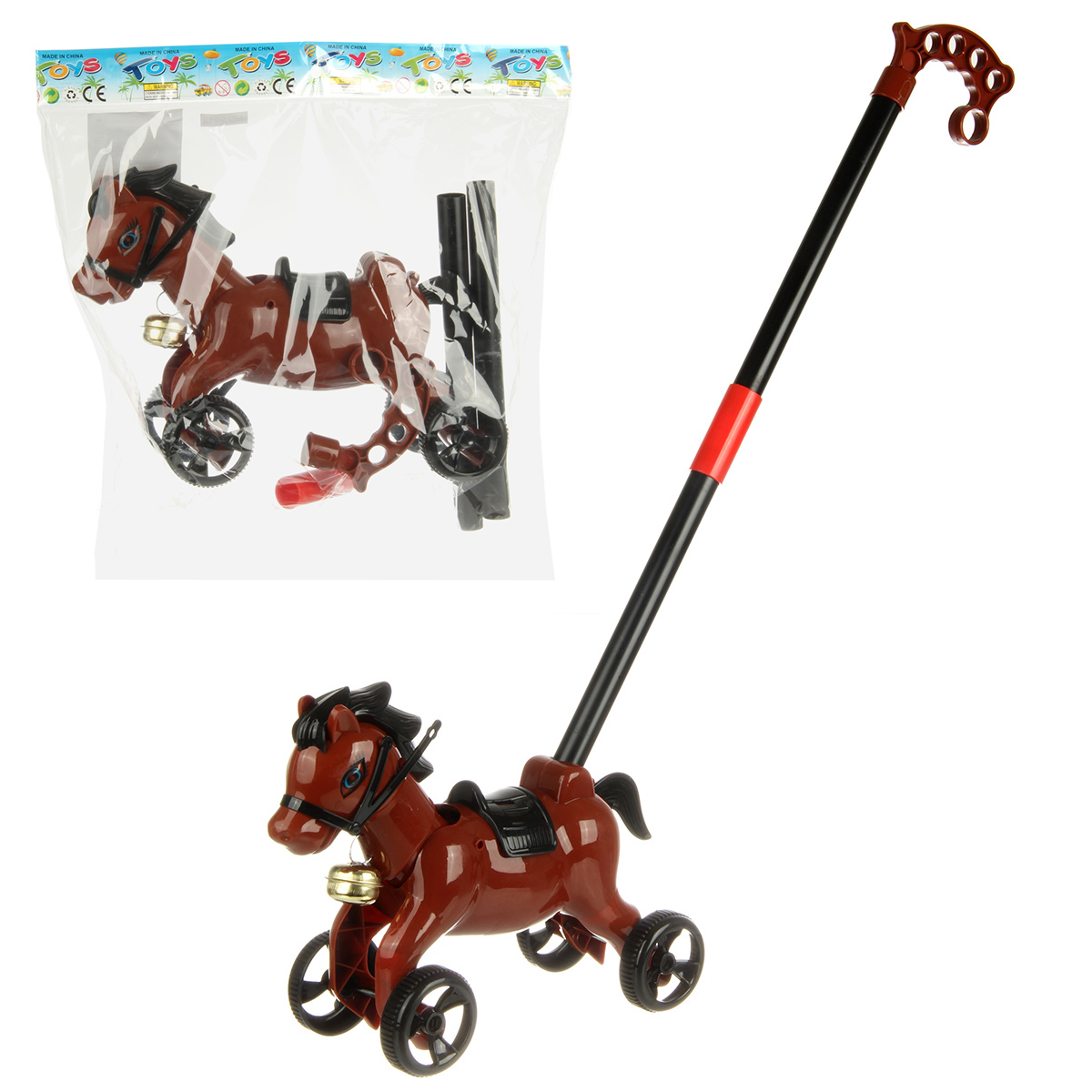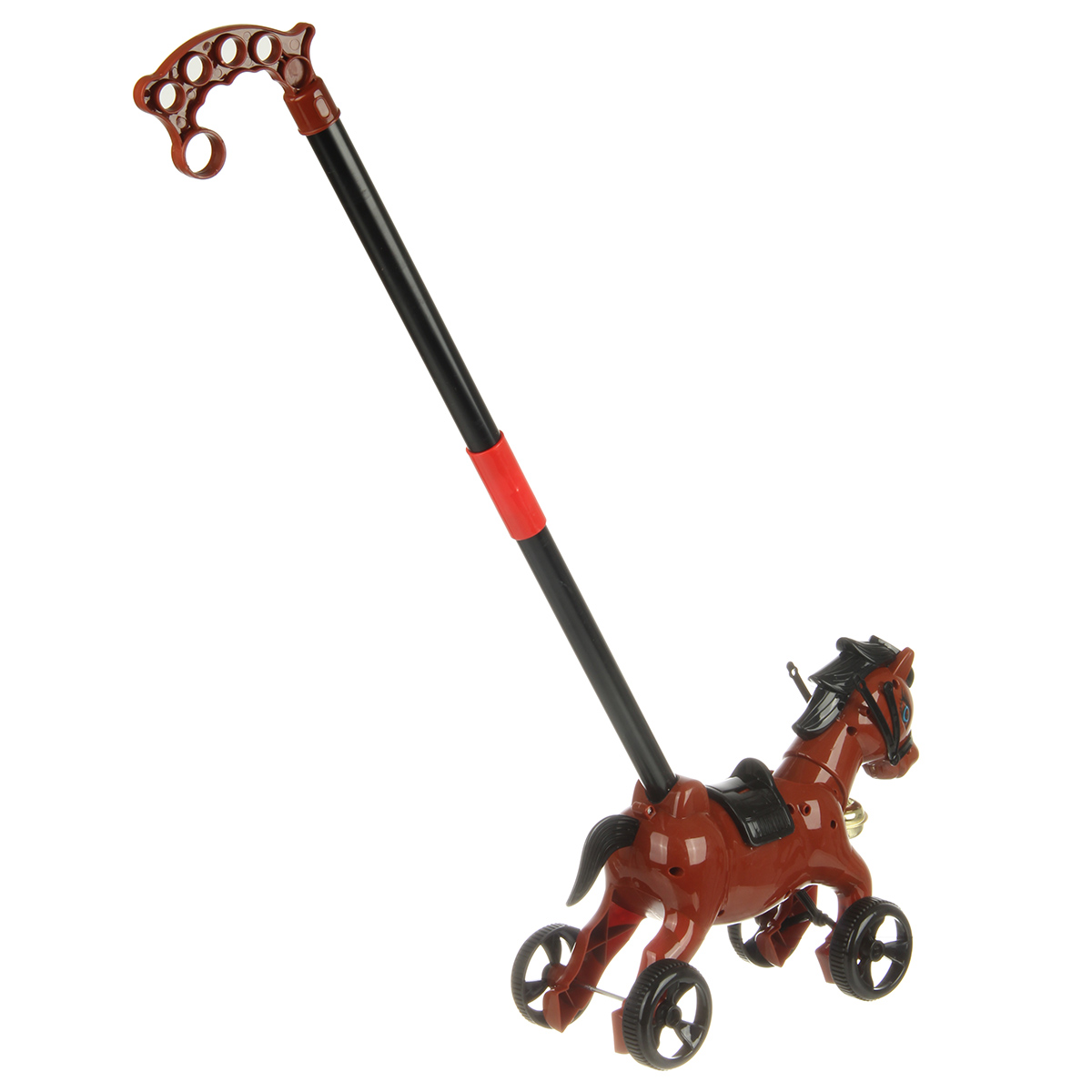Каталка с бубенцом катается вперёд и назад со звенящим звуком. При передвижении лошадка наклоняет и поднимает голову.