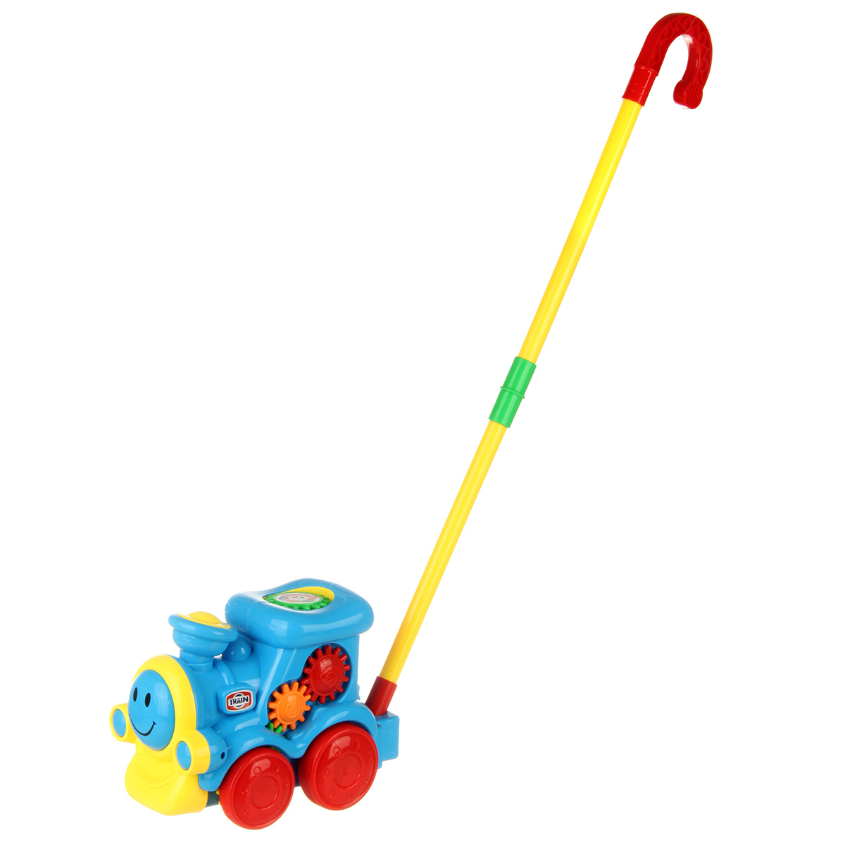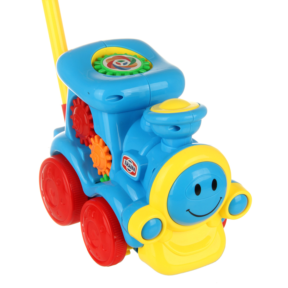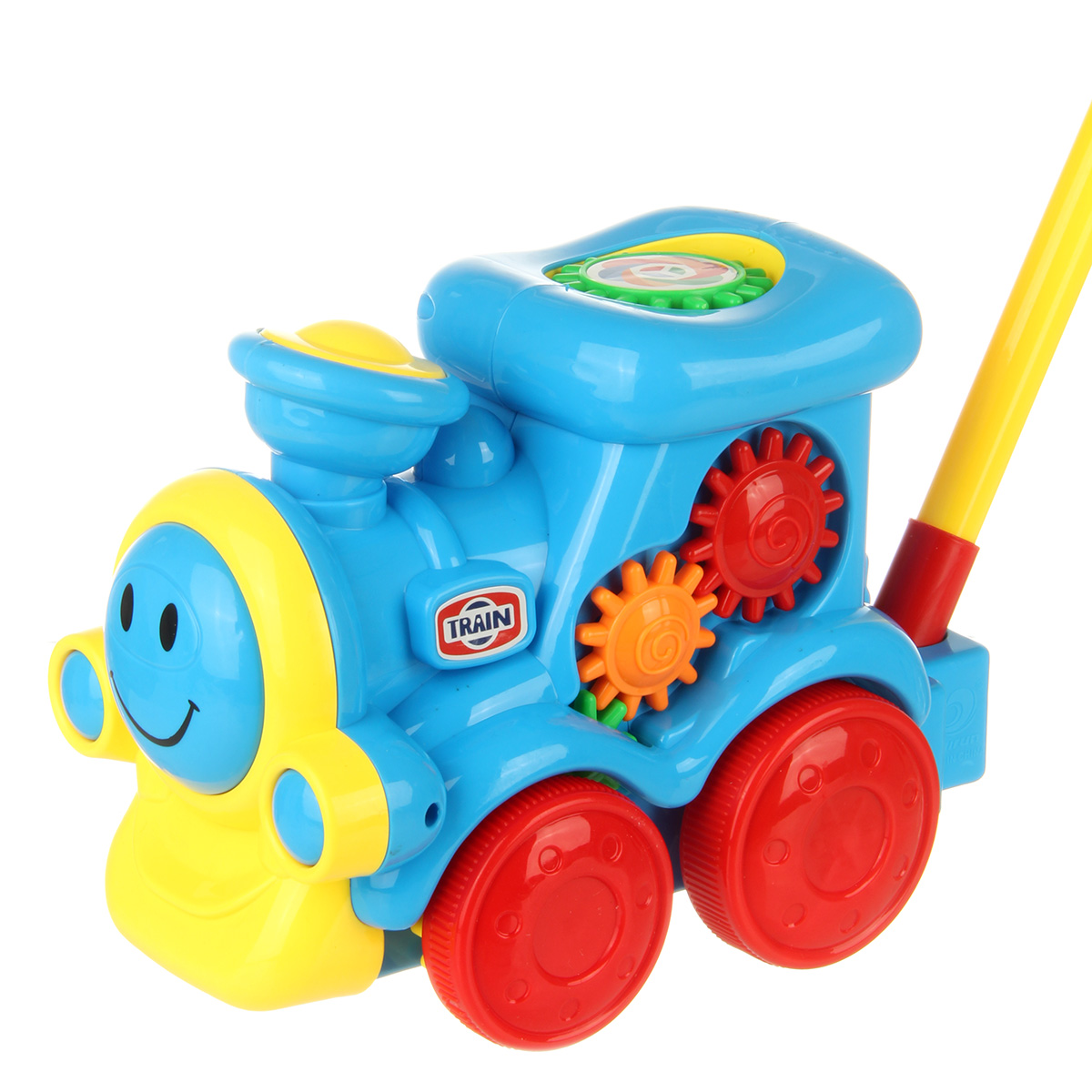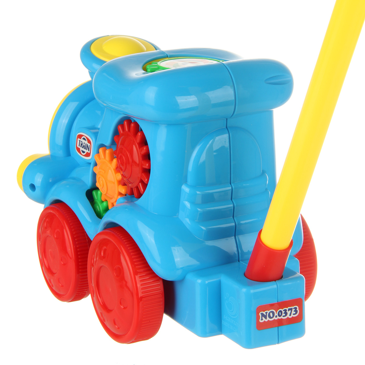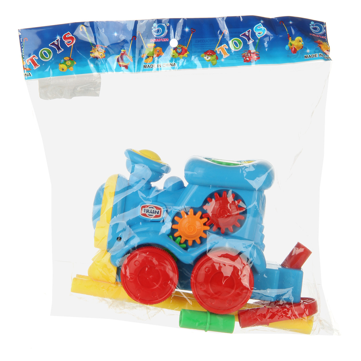 Детская игрушка катается вперед и назад, при движении у паровоза двигаются шестеренки, издает пищащий звук.