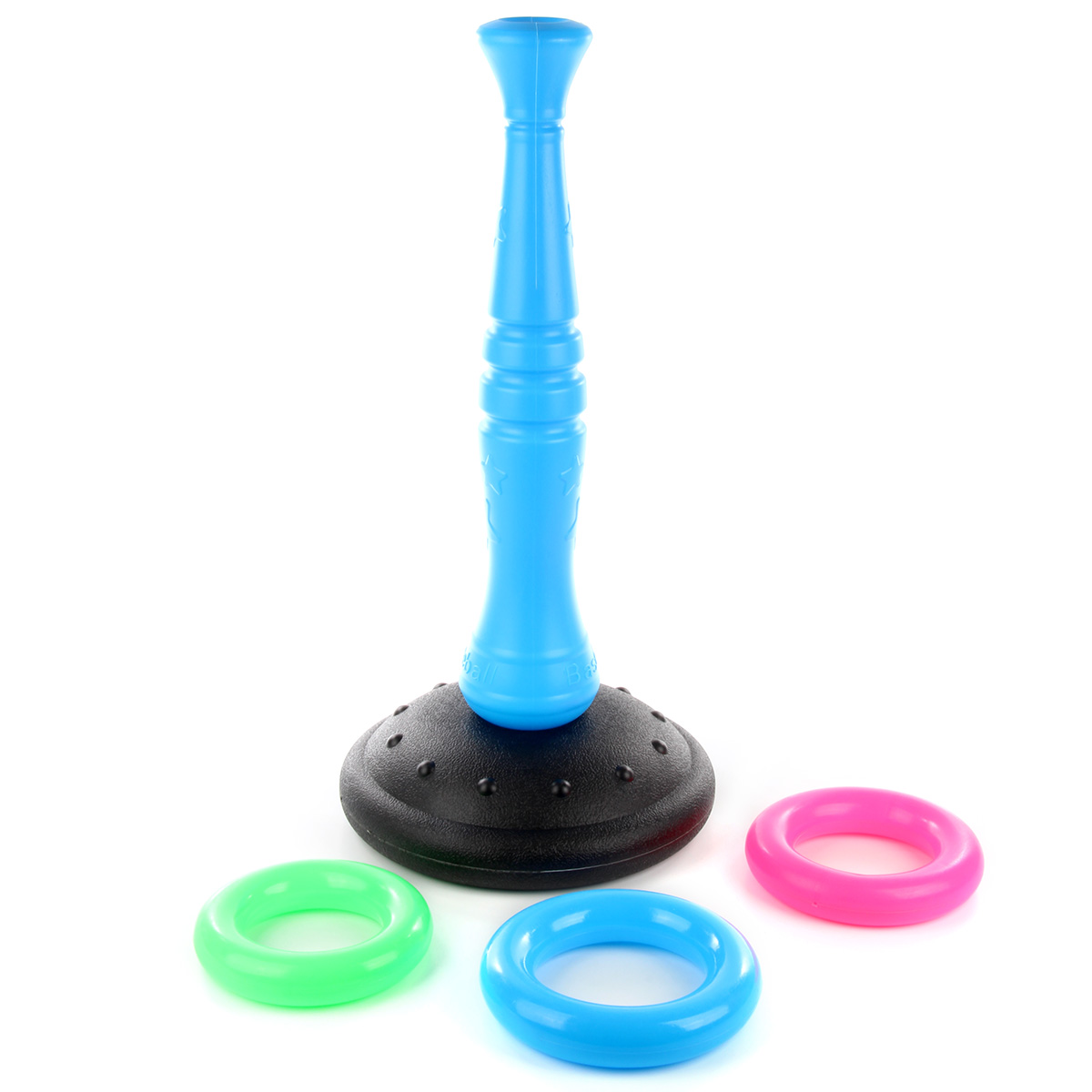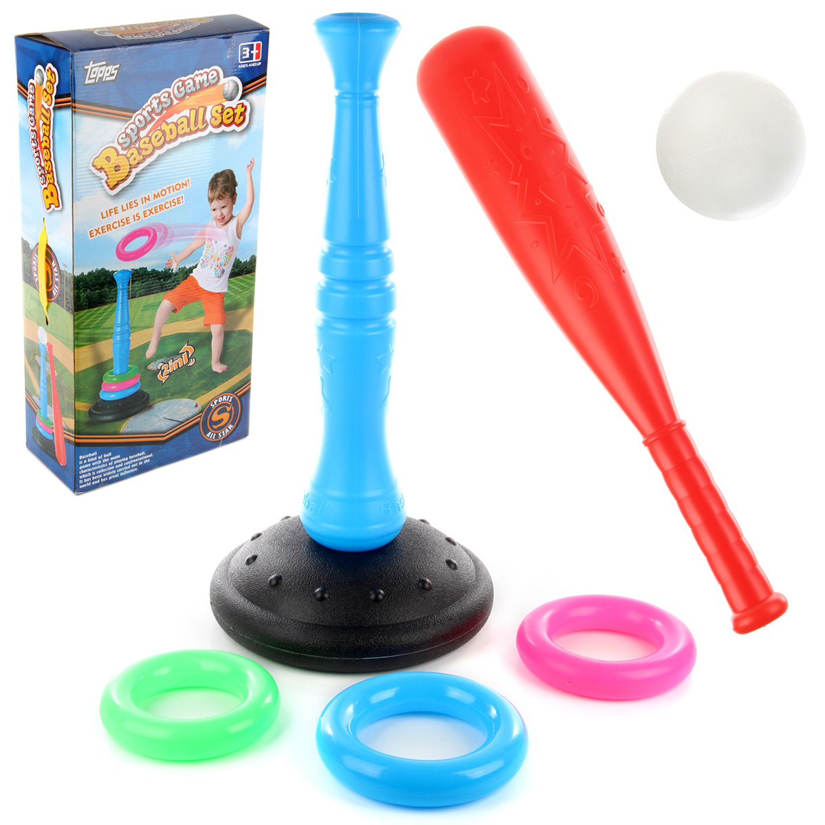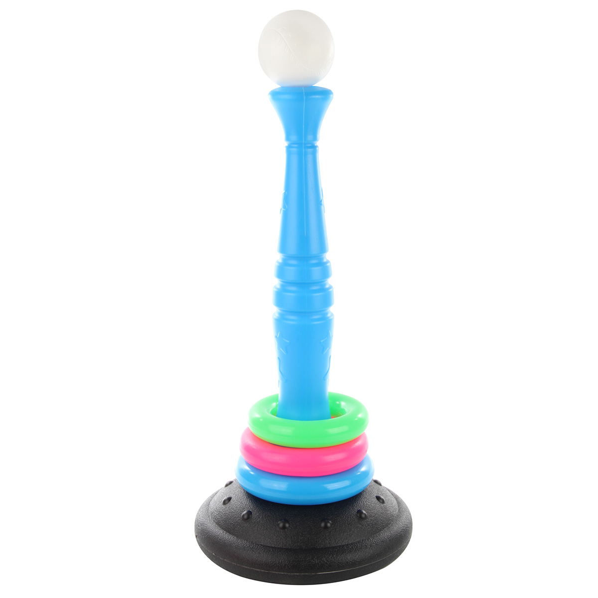 Очень полезная игрушка для тренировки ловкости, меткости и координации движений. В комплект входят стойка, кольца, бита и мяч. Стойка легко собирается и разбирается. Варианты игры: - кольцеброс. Устанавливаем на ровной поверхности стойку, отходим на расстояние и кидаем кольца, стараясь нанизать их на стойку; - упрощенная версия бейсбола. Благодаря такому набору ребенок будет развивать соревновательный дух, концентрацию внимания, глазомер. Можно играть одному или командой, во дворе или дома. Игрушка изготовлена из высококачественного и безопасного полимерного материала. Размеры собранной стойки: 26*26*55 см. Размеры зеленого кольца: 14*14*3 см. Размеры биты: 48*8*8 см. Диаметр мяча: 9 см. Размеры коробки: 27*13*53 см.