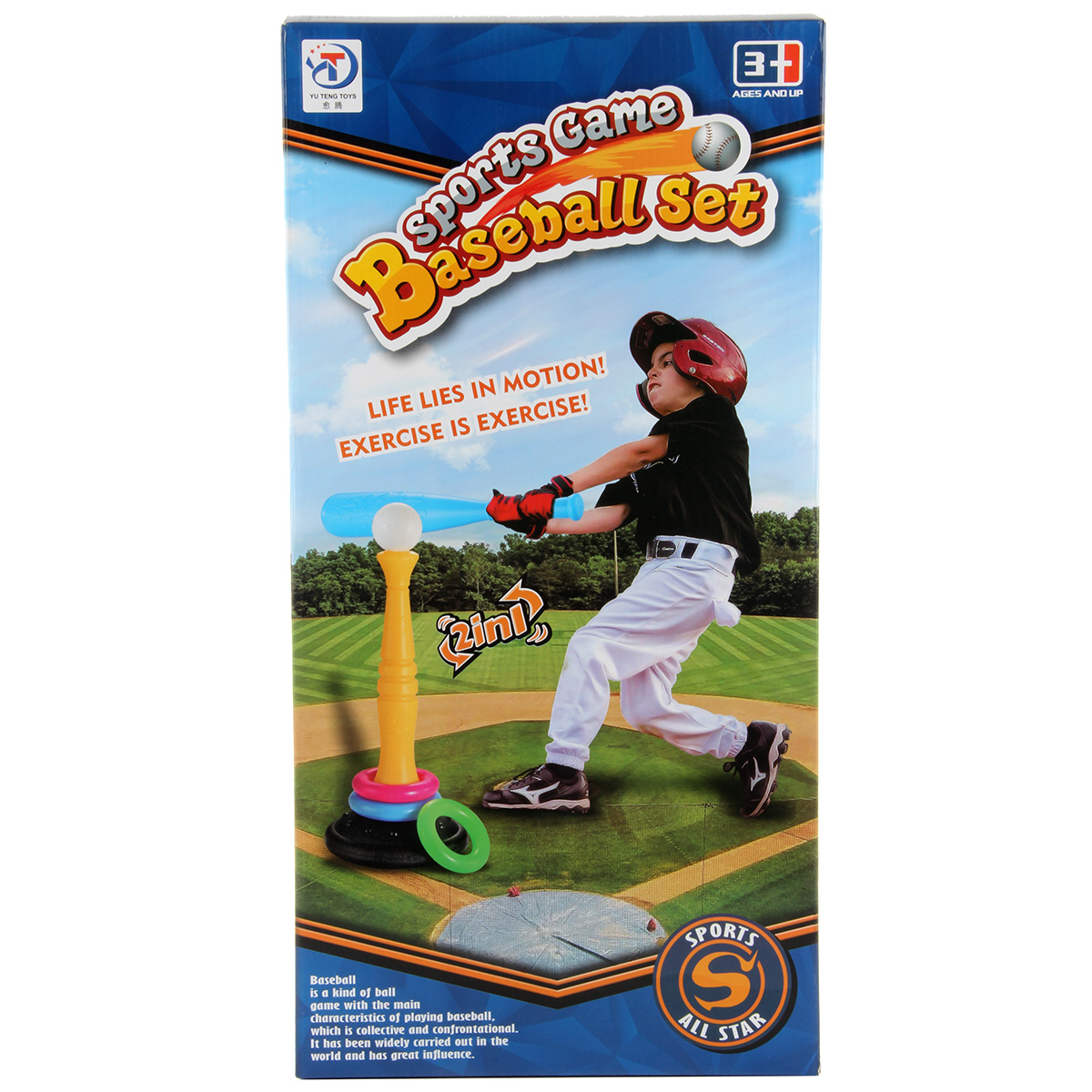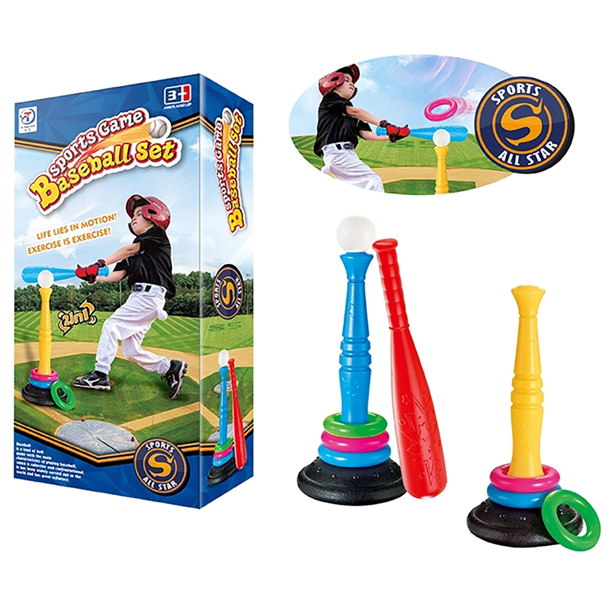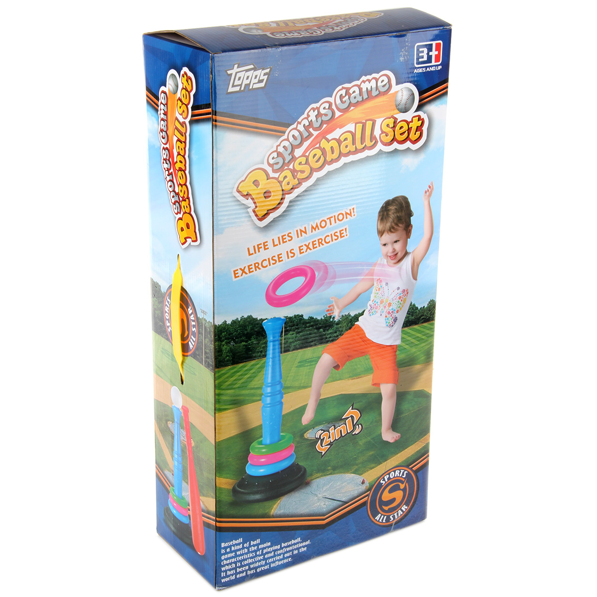 Очень полезная игрушка для тренировки ловкости, меткости и координации движений. В комплект входят стойка, кольца, бита и мяч. Стойка легко собирается и разбирается. Варианты игры: - кольцеброс. Устанавливаем на ровной поверхности стойку, отходим на расстояние и кидаем кольца, стараясь нанизать их на стойку; - упрощенная версия бейсбола. Благодаря такому набору ребенок будет развивать соревновательный дух, концентрацию внимания, глазомер. Можно играть одному или командой, во дворе или дома. Игрушка изготовлена из высококачественного и безопасного полимерного материала. Размеры собранной стойки: 26*26*55 см. Размеры зеленого кольца: 14*14*3 см. Размеры биты: 48*8*8 см. Диаметр мяча: 9 см. Размеры коробки: 27*13*53 см.