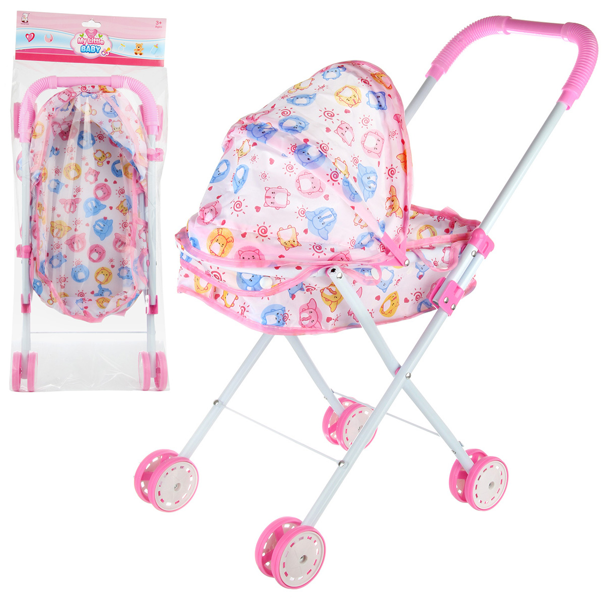 Металлический каркас, съемная люлька, подвижный козырек, удобство складывания и хранения, двойные колеса, если детская коляска для куклы, то только такая. Коляска детская игрушечная выполнена в красивой расцветке, изготовлена из прочных и долговечных материалов.