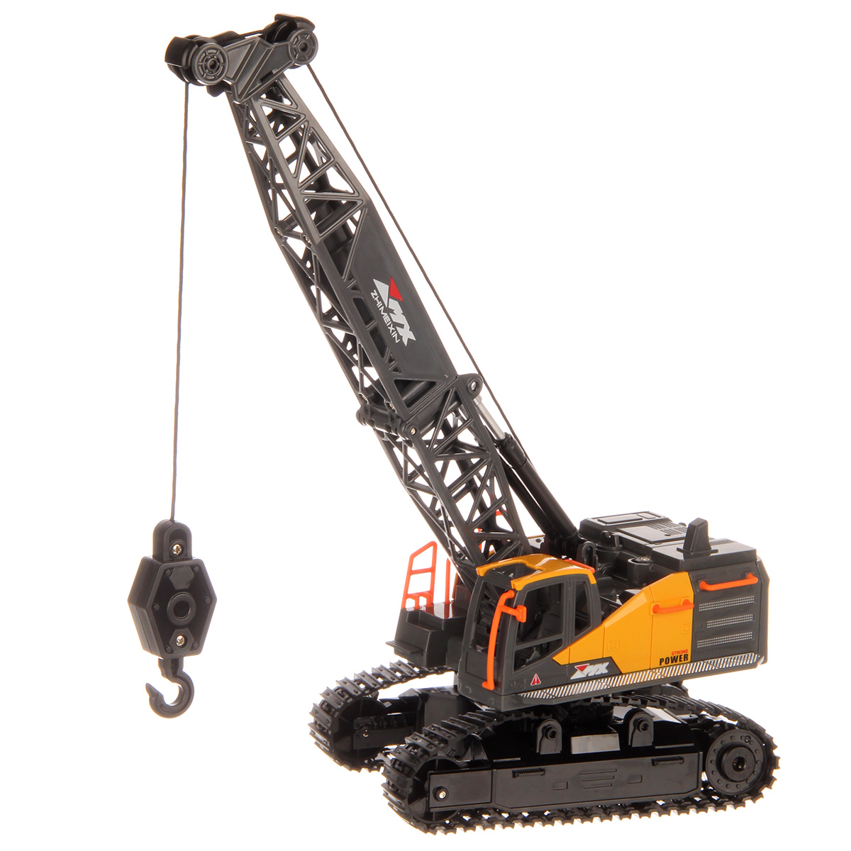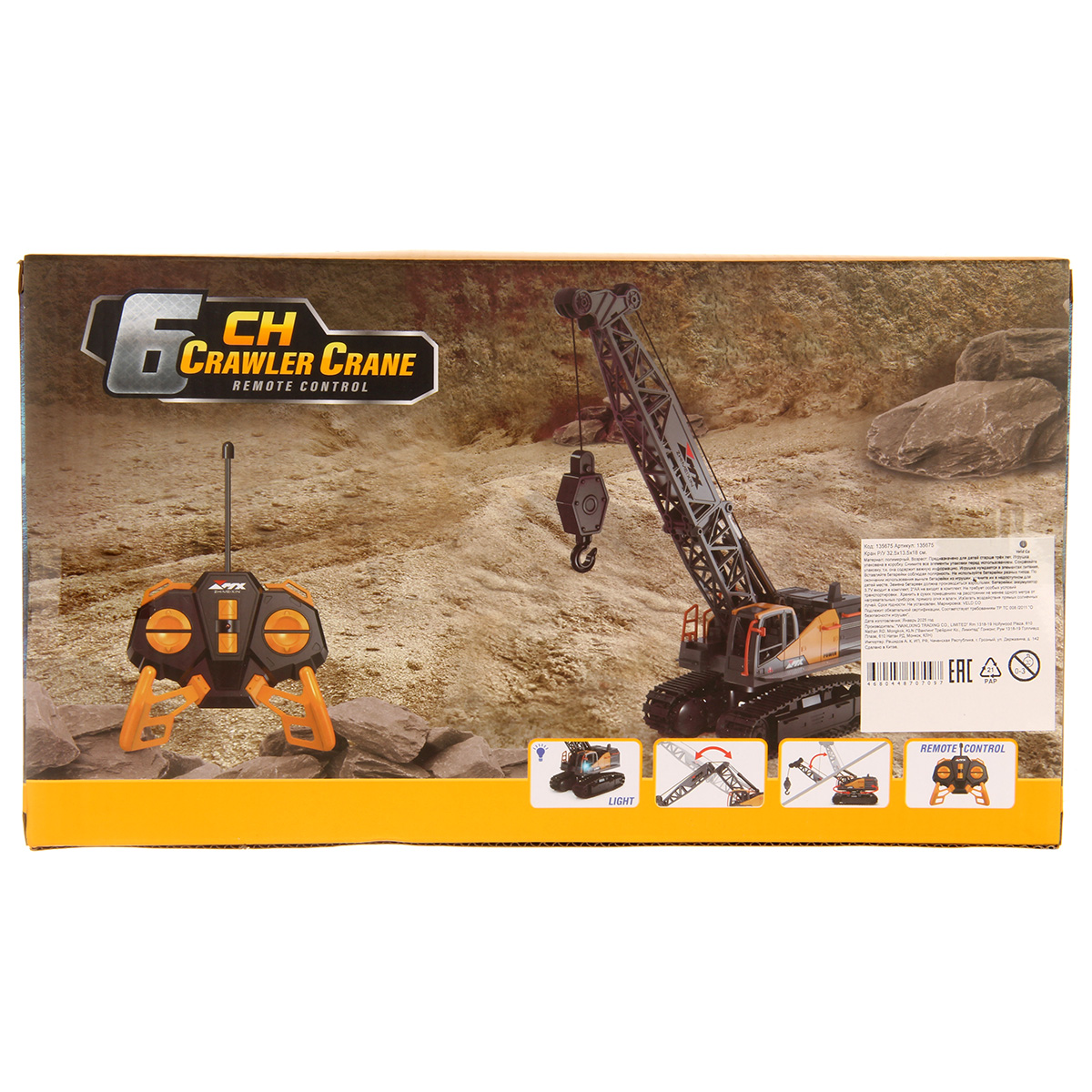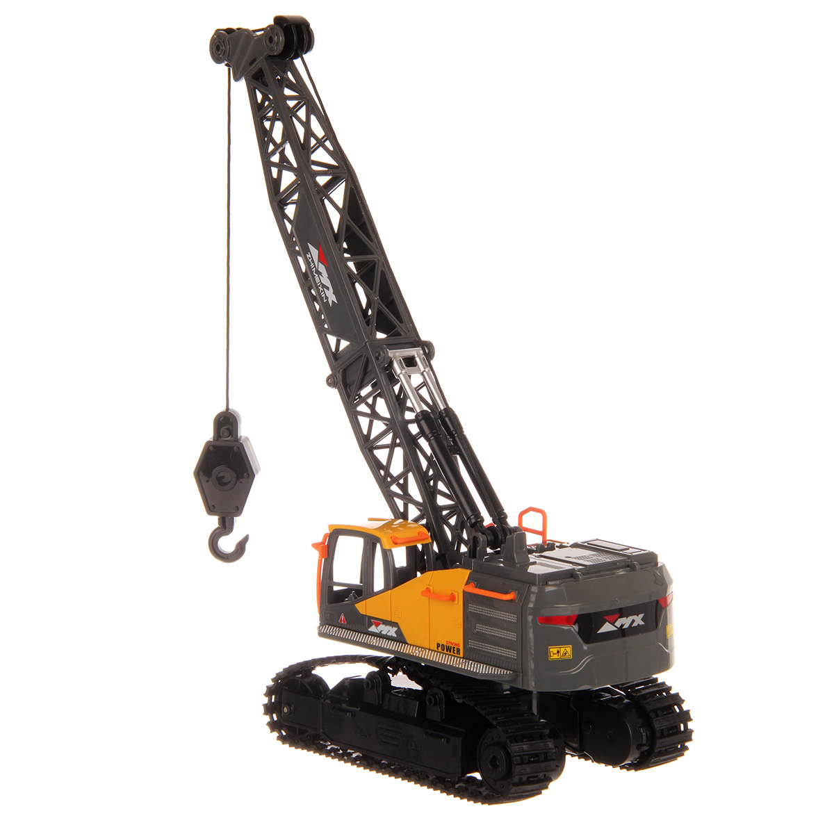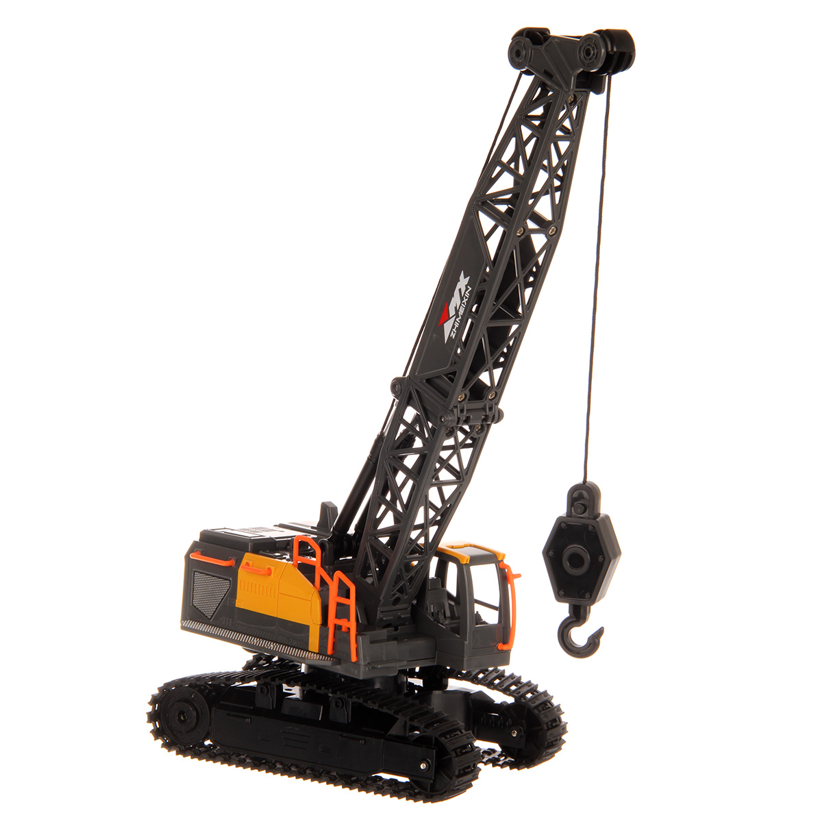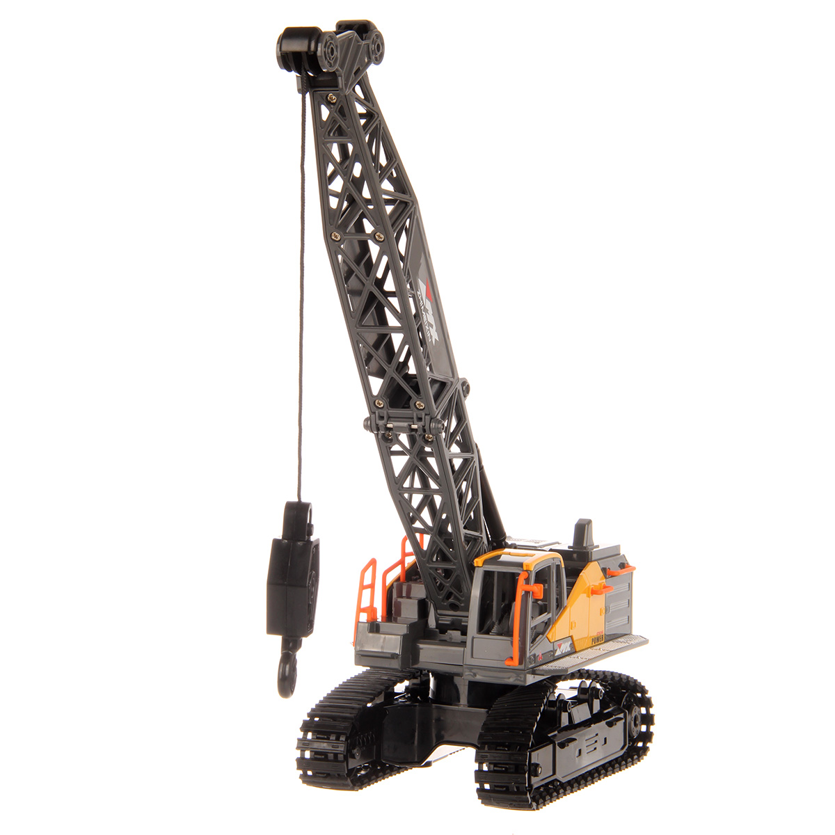 Кран на радиоуправлении в реалистичном дизайне и с широким функционалом. Радиоуправляемая игрушка катается во все стороны, имеет эффектную подсветку кабины и мягкие снимающиеся гусеницы. У игрушечной спецтехники есть подвижные детали, складывающаяся стрела, опускающаяся веревка с крюком, на крюк можно повесить мелкие грузы, вращающаяся кабина.