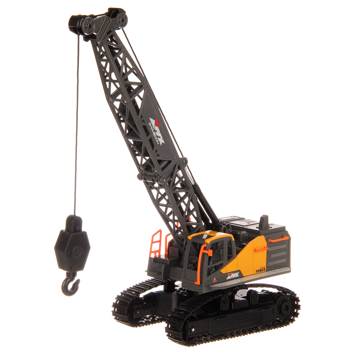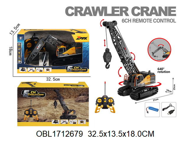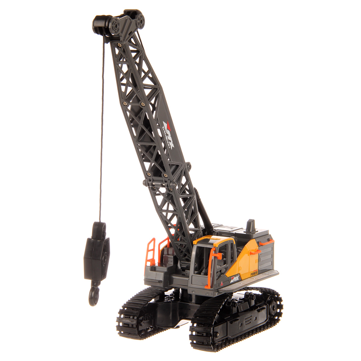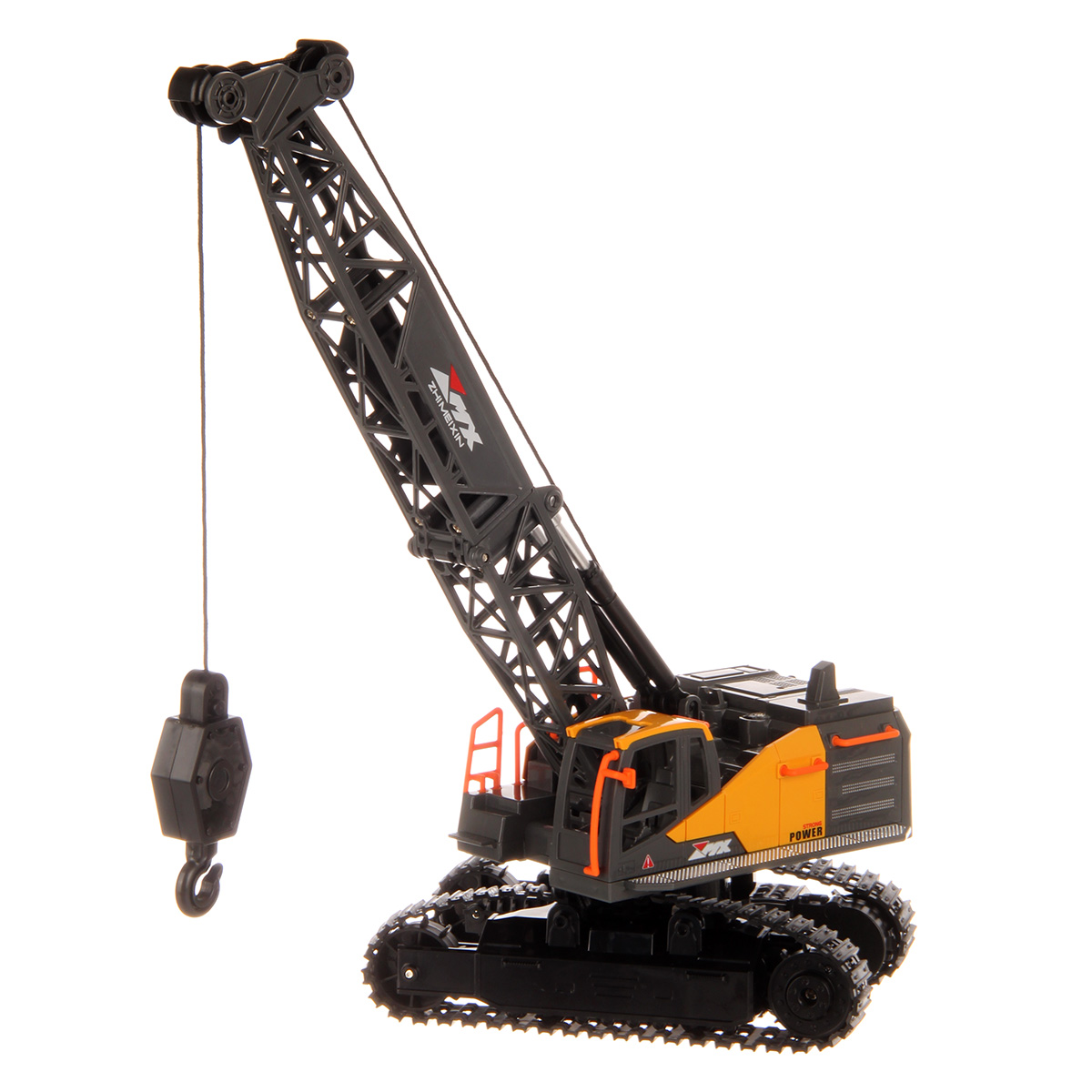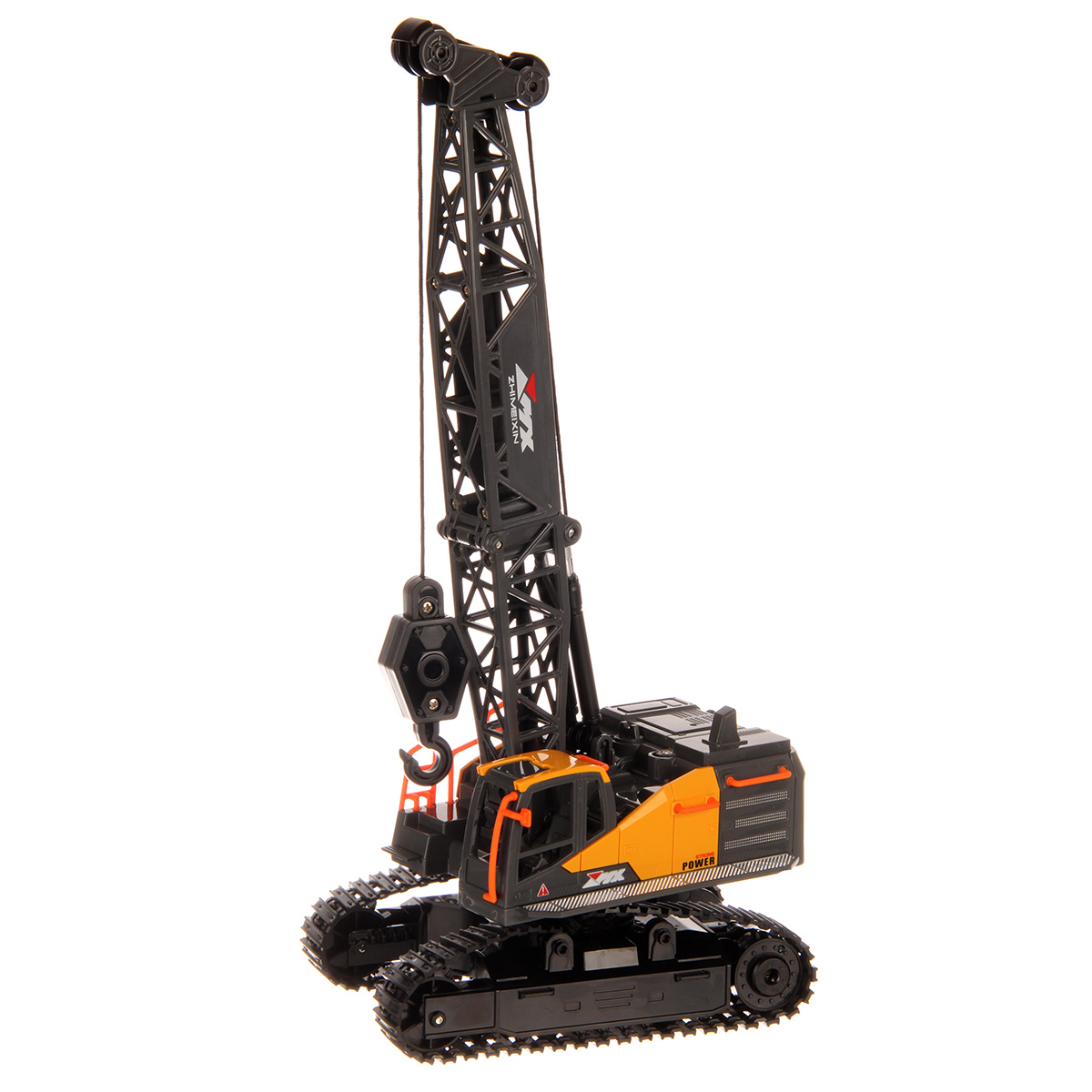 Кран на радиоуправлении в реалистичном дизайне и с широким функционалом. Радиоуправляемая игрушка катается во все стороны, имеет эффектную подсветку кабины и мягкие снимающиеся гусеницы. У игрушечной спецтехники есть подвижные детали, складывающаяся стрела, опускающаяся веревка с крюком, на крюк можно повесить мелкие грузы, вращающаяся кабина.