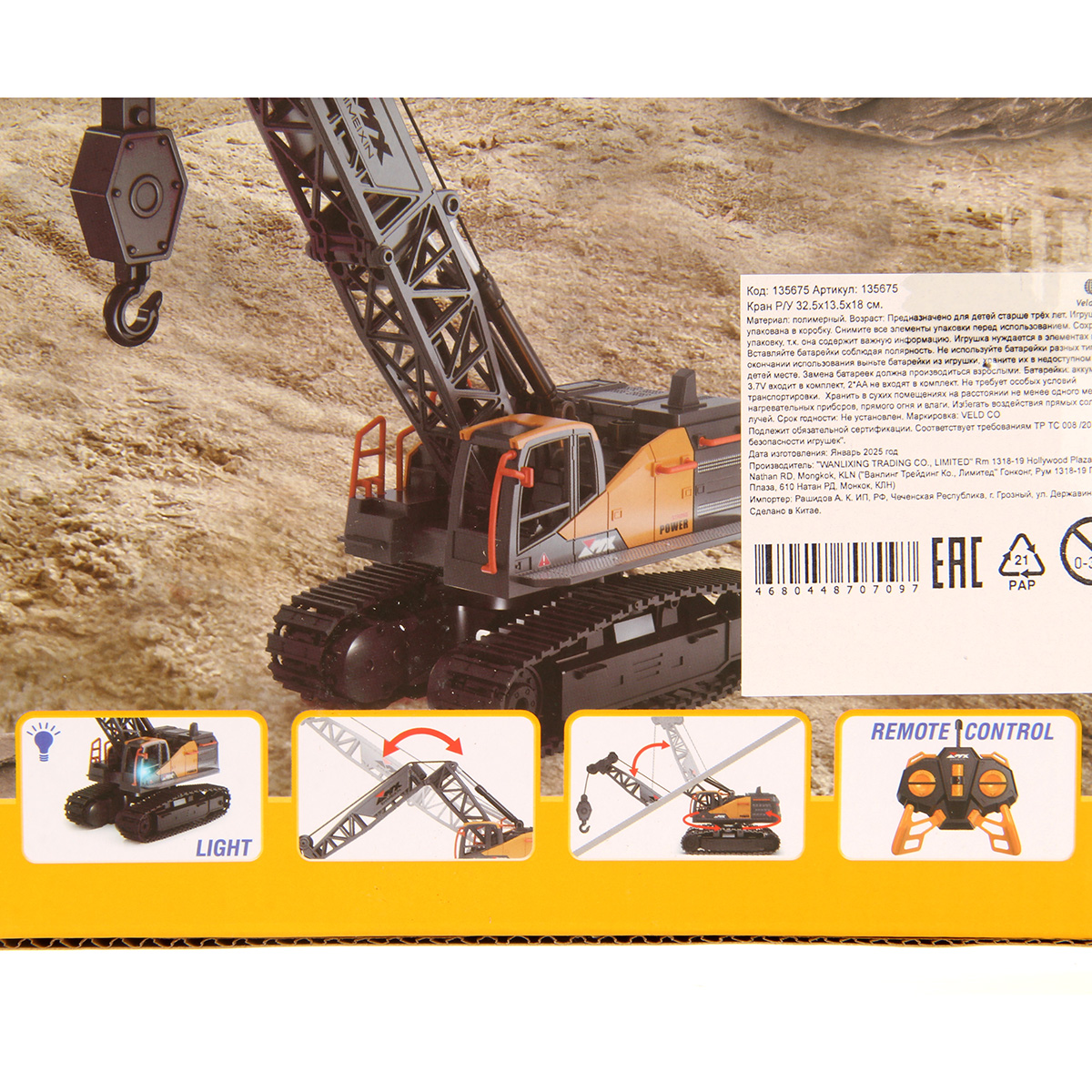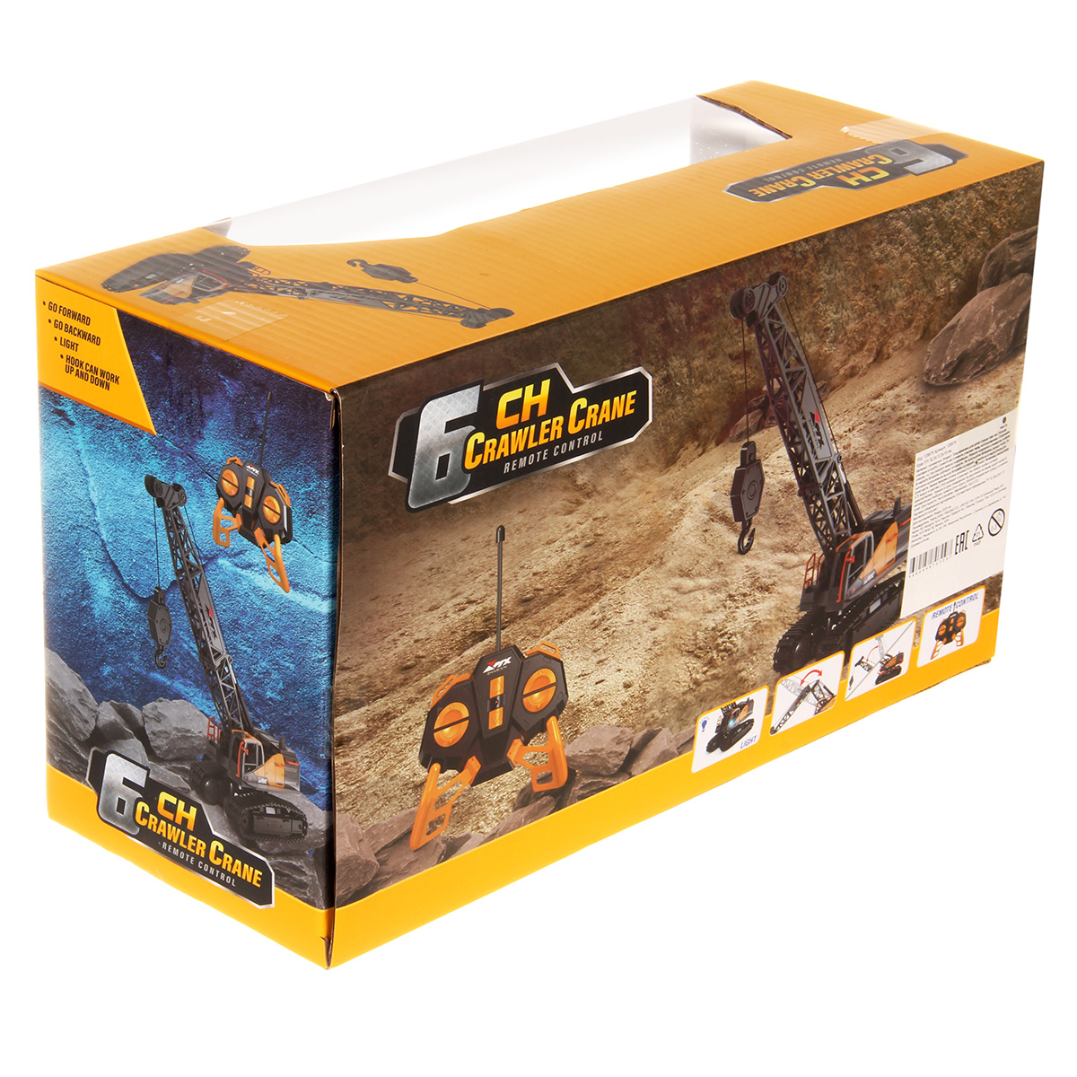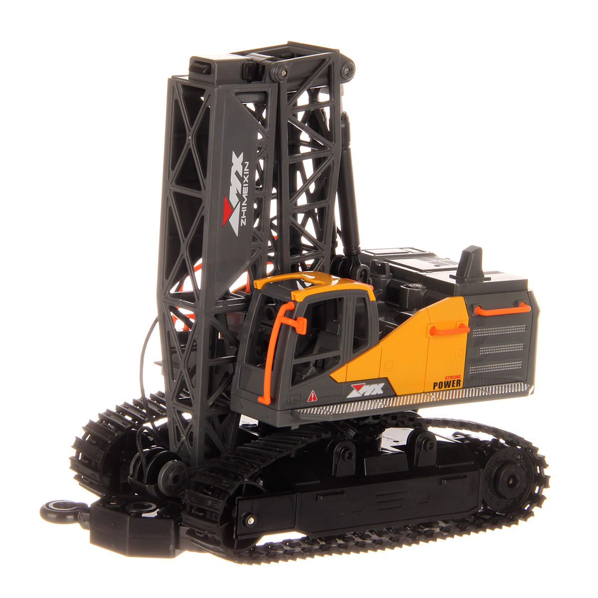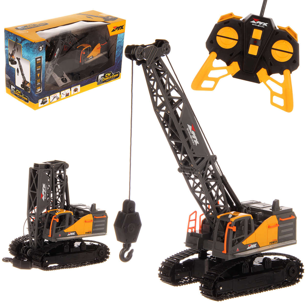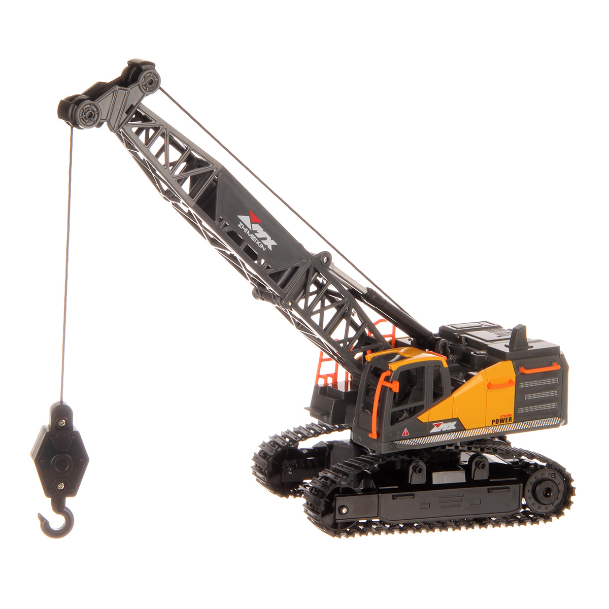 Кран на радиоуправлении в реалистичном дизайне и с широким функционалом. Радиоуправляемая игрушка катается во все стороны, имеет эффектную подсветку кабины и мягкие снимающиеся гусеницы. У игрушечной спецтехники есть подвижные детали, складывающаяся стрела, опускающаяся веревка с крюком, на крюк можно повесить мелкие грузы, вращающаяся кабина.