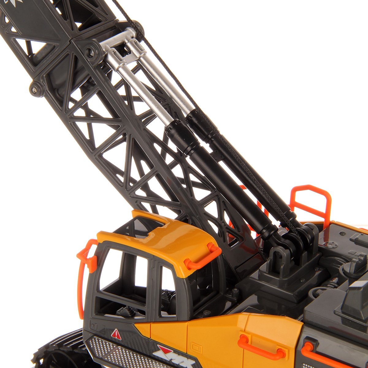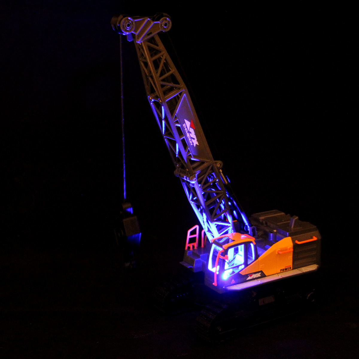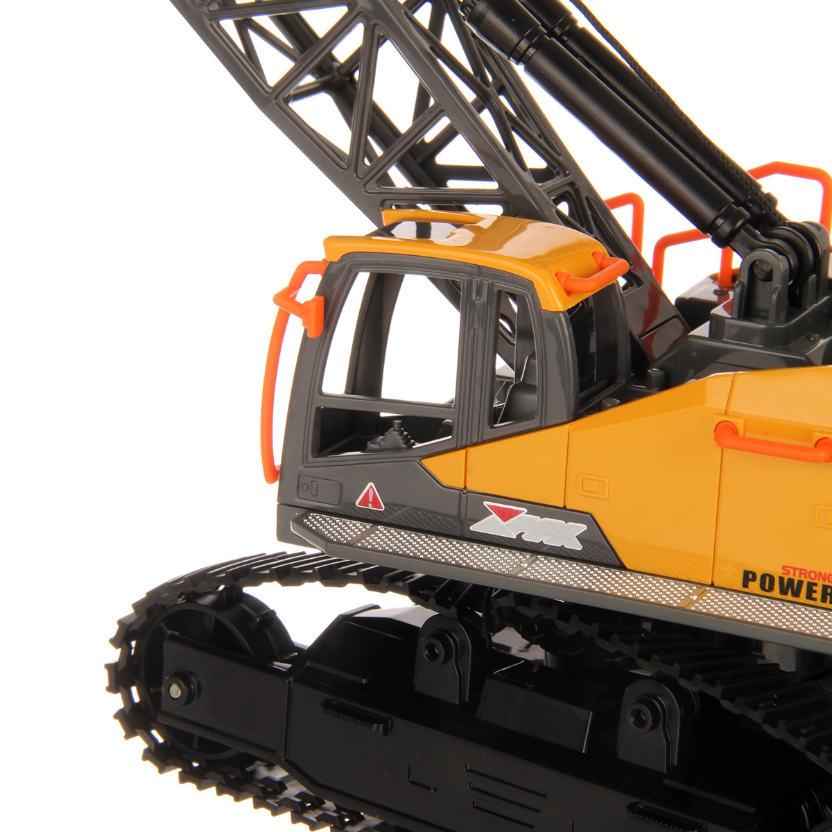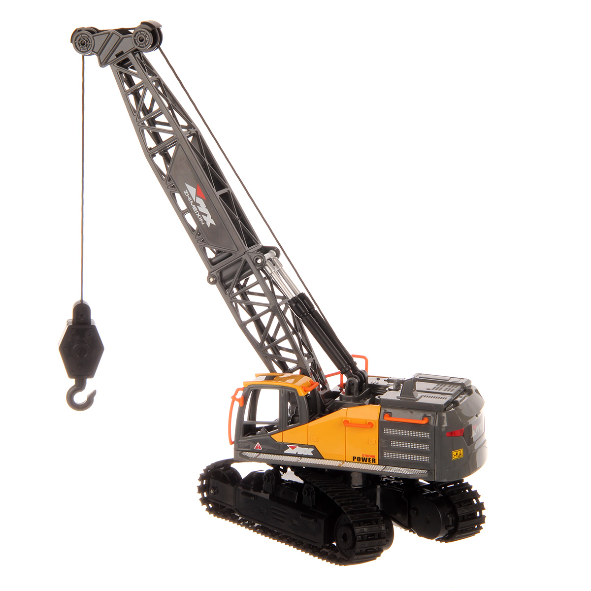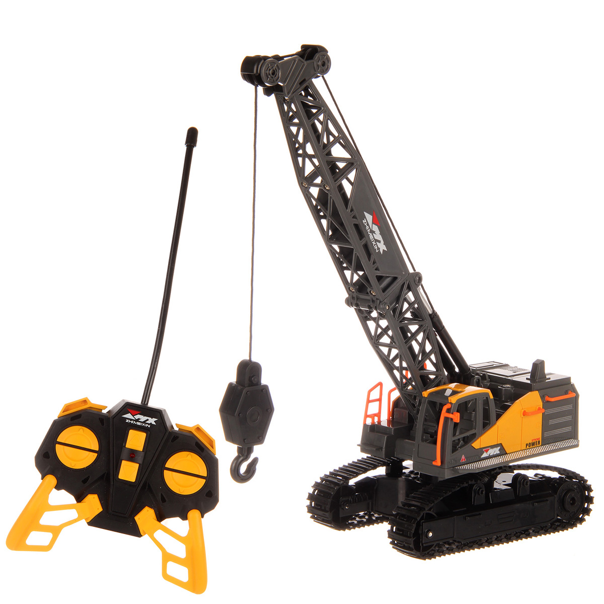 Кран на радиоуправлении в реалистичном дизайне и с широким функционалом. Радиоуправляемая игрушка катается во все стороны, имеет эффектную подсветку кабины и мягкие снимающиеся гусеницы. У игрушечной спецтехники есть подвижные детали, складывающаяся стрела, опускающаяся веревка с крюком, на крюк можно повесить мелкие грузы, вращающаяся кабина.