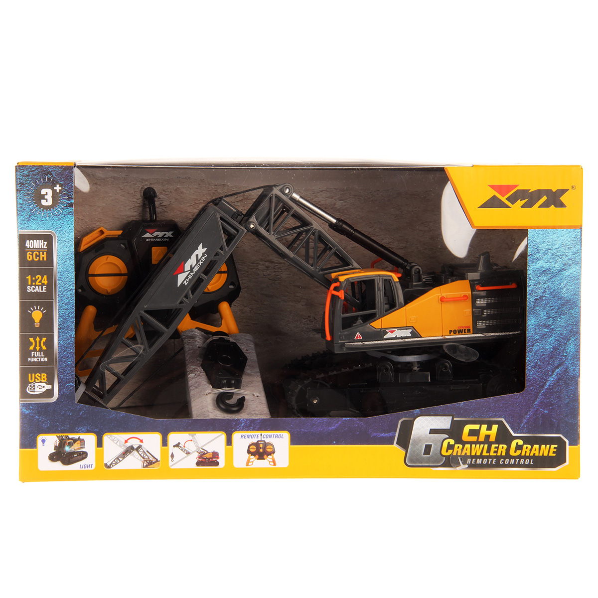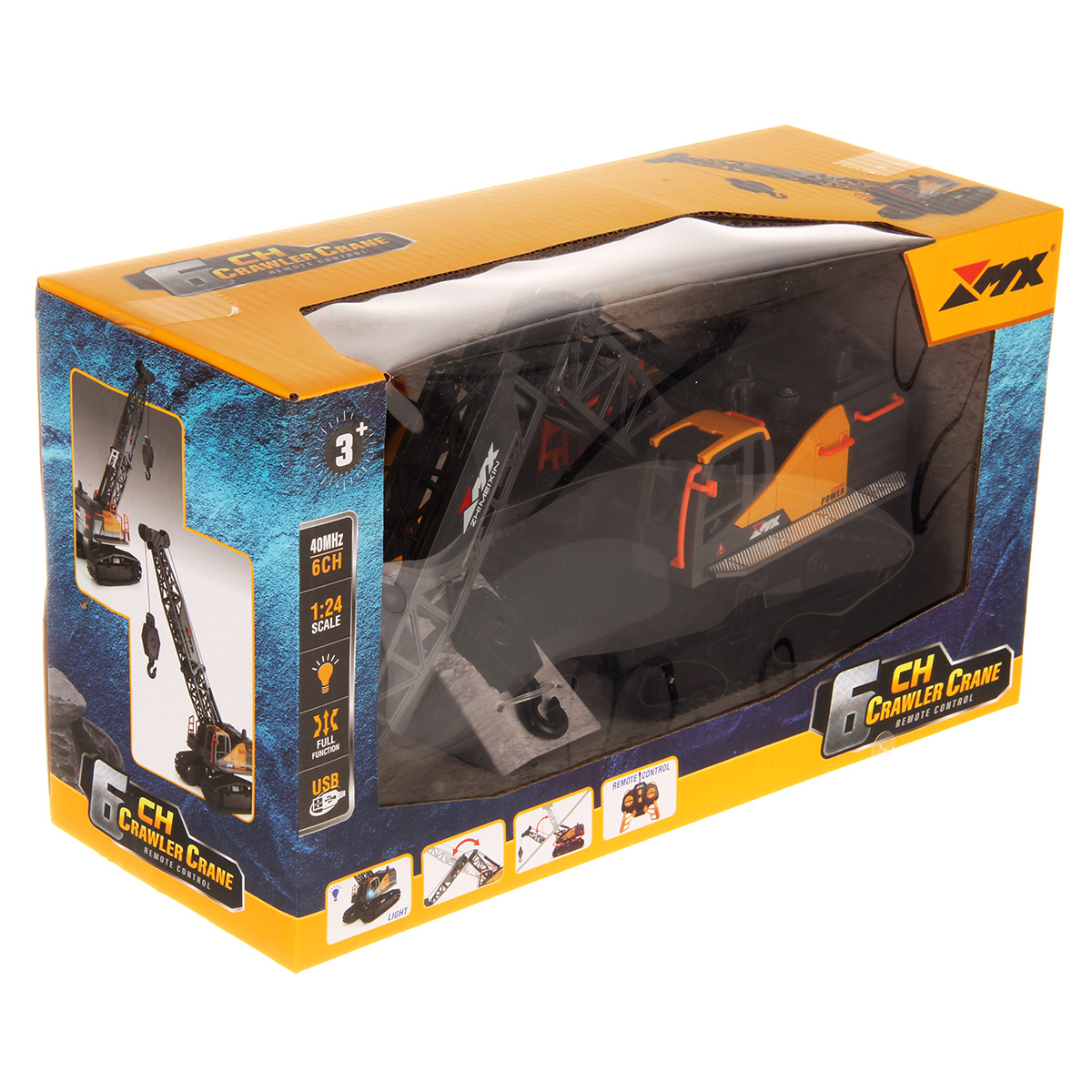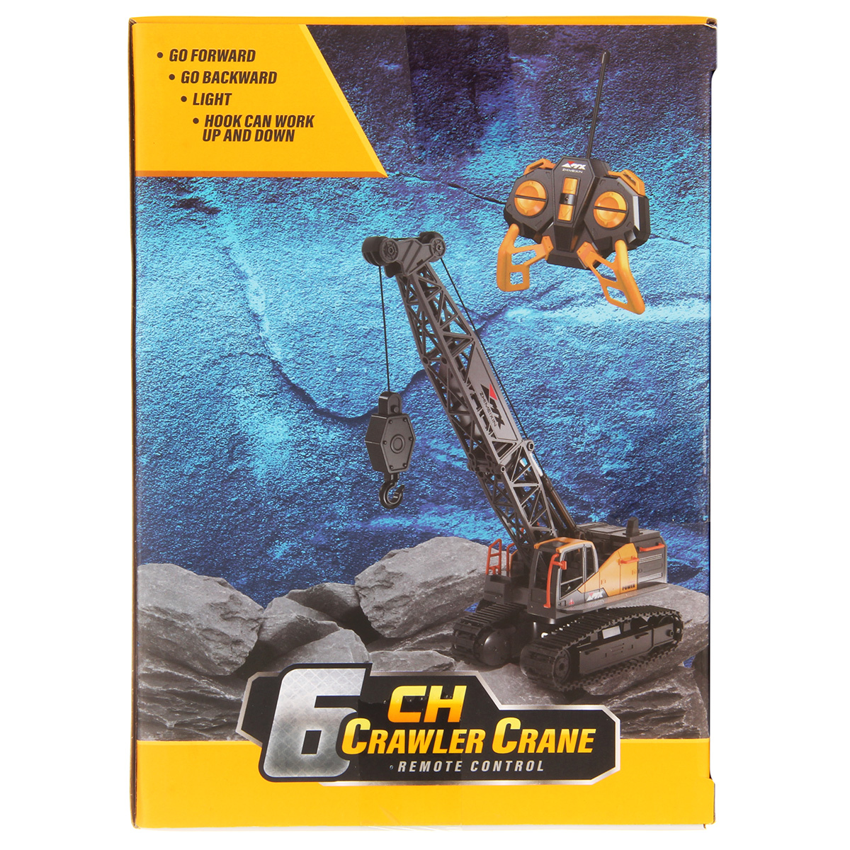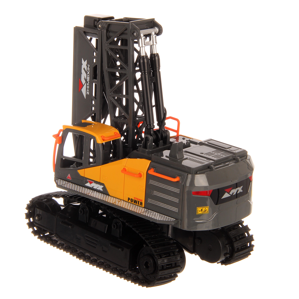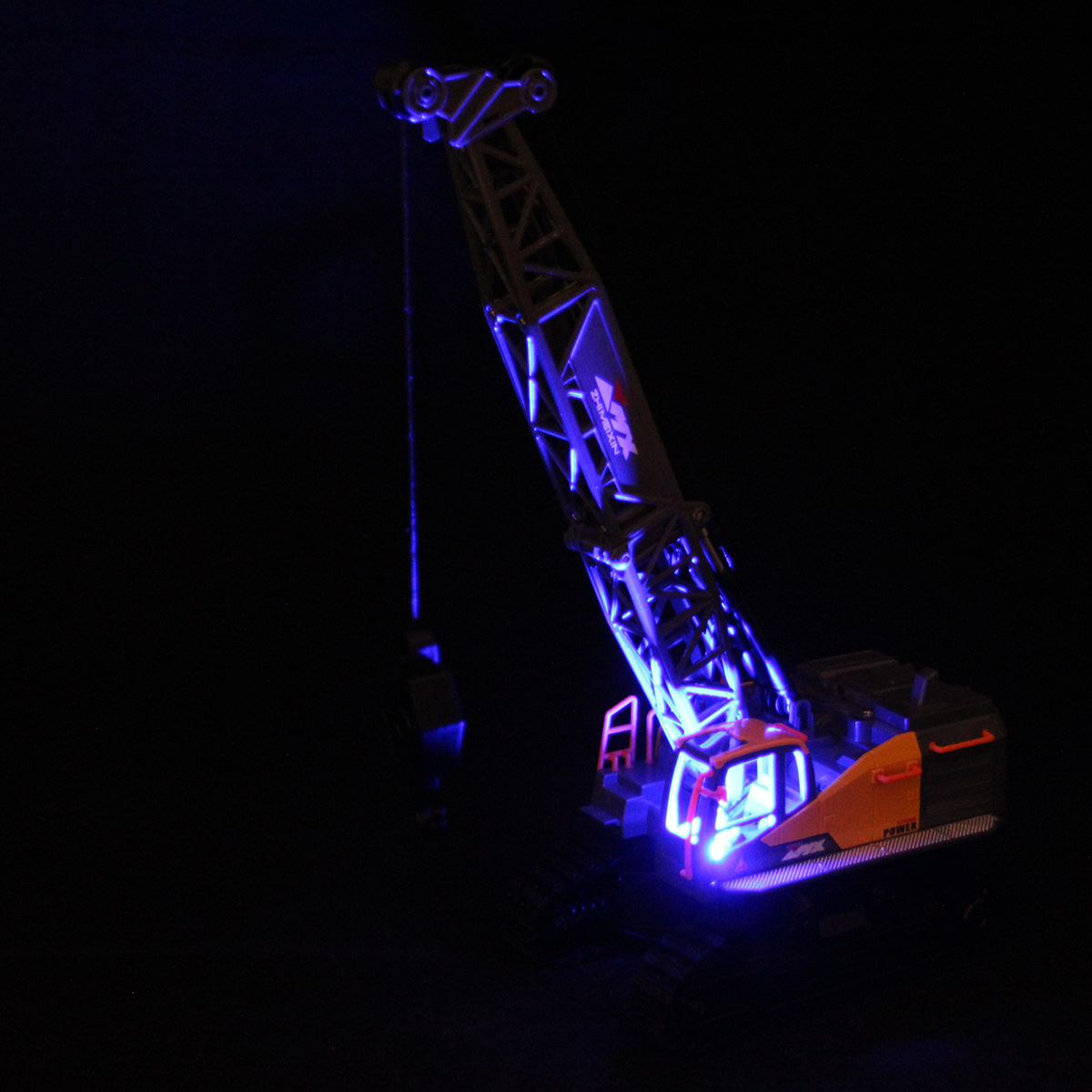 Кран на радиоуправлении в реалистичном дизайне и с широким функционалом. Радиоуправляемая игрушка катается во все стороны, имеет эффектную подсветку кабины и мягкие снимающиеся гусеницы. У игрушечной спецтехники есть подвижные детали, складывающаяся стрела, опускающаяся веревка с крюком, на крюк можно повесить мелкие грузы, вращающаяся кабина.