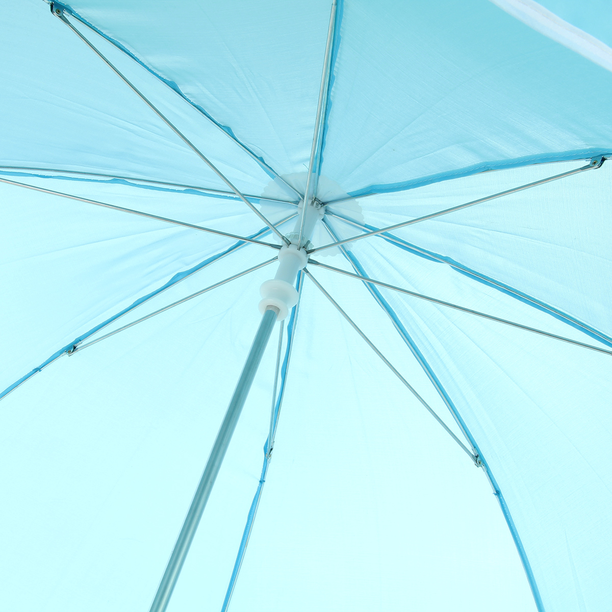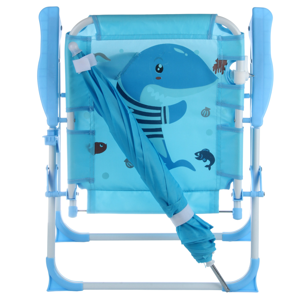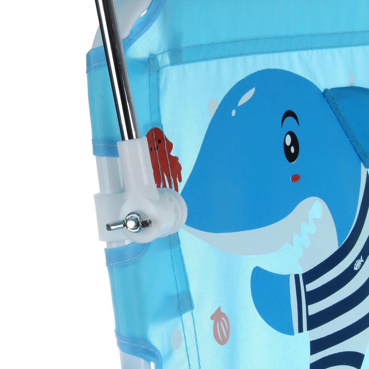 Складной стул имеет сиденье из полиэстера, хороший пошив, текстильная часть сиденья не снимается. В комплекте есть зонтик, устанавливающийся в подставке, положение зонта можно менять, на держателе для зонтика есть барашек, наклоняем зонтик в держателе под нужным углом, крутим барашек, он фиксирует зонтик в выбранном положении. Зонт механический, закрывается на лямку с липучкой. Зонтик детский защищает от солнечных лучей и непогоды. На задней стороне спинки сидения имеются 2 липучки, чтобы закрепить в них сложенный зонтик.
