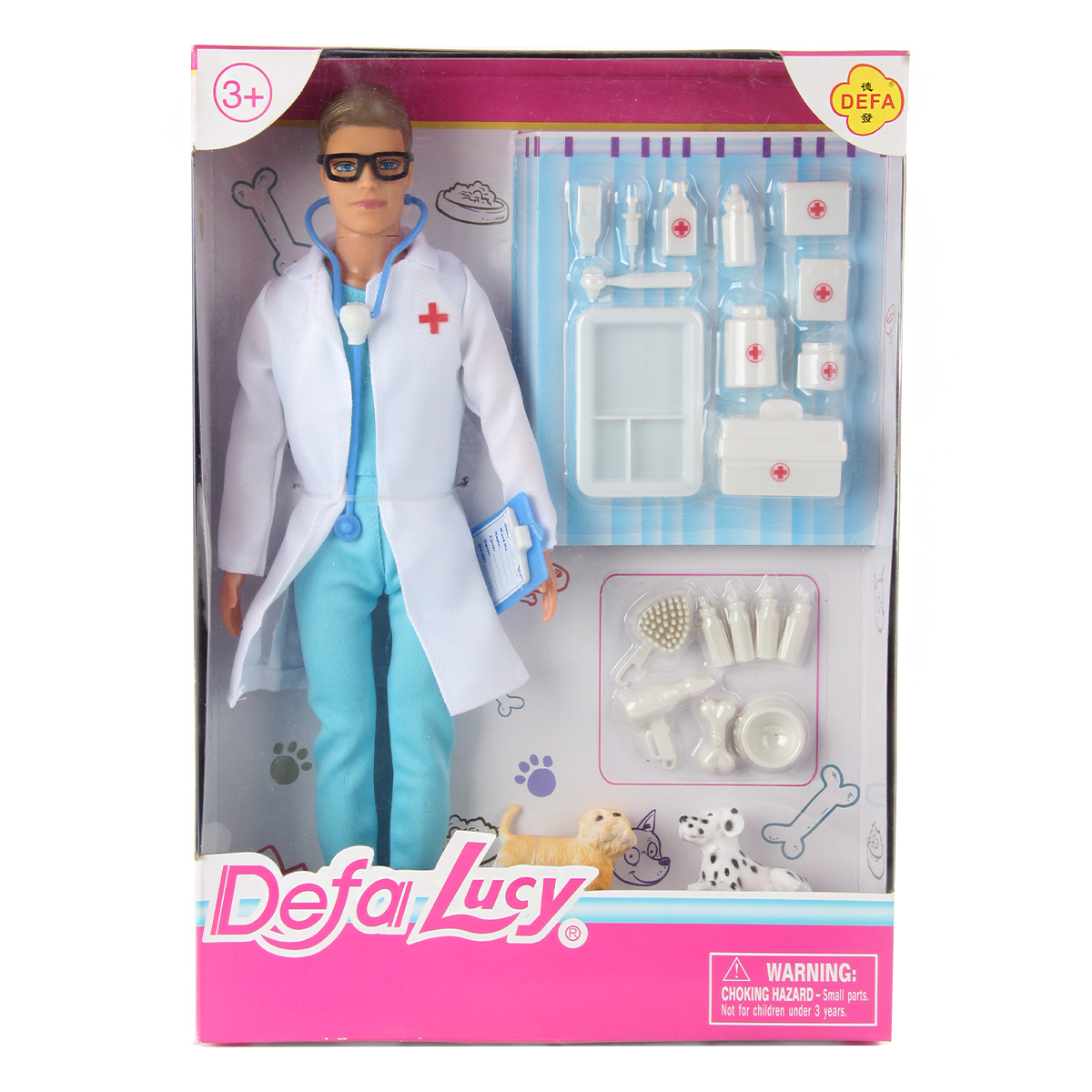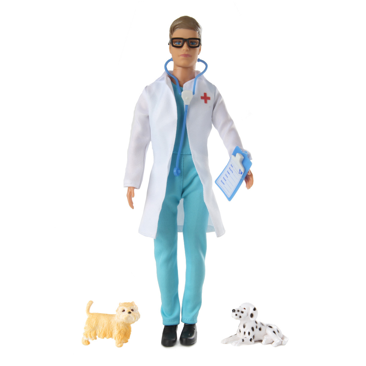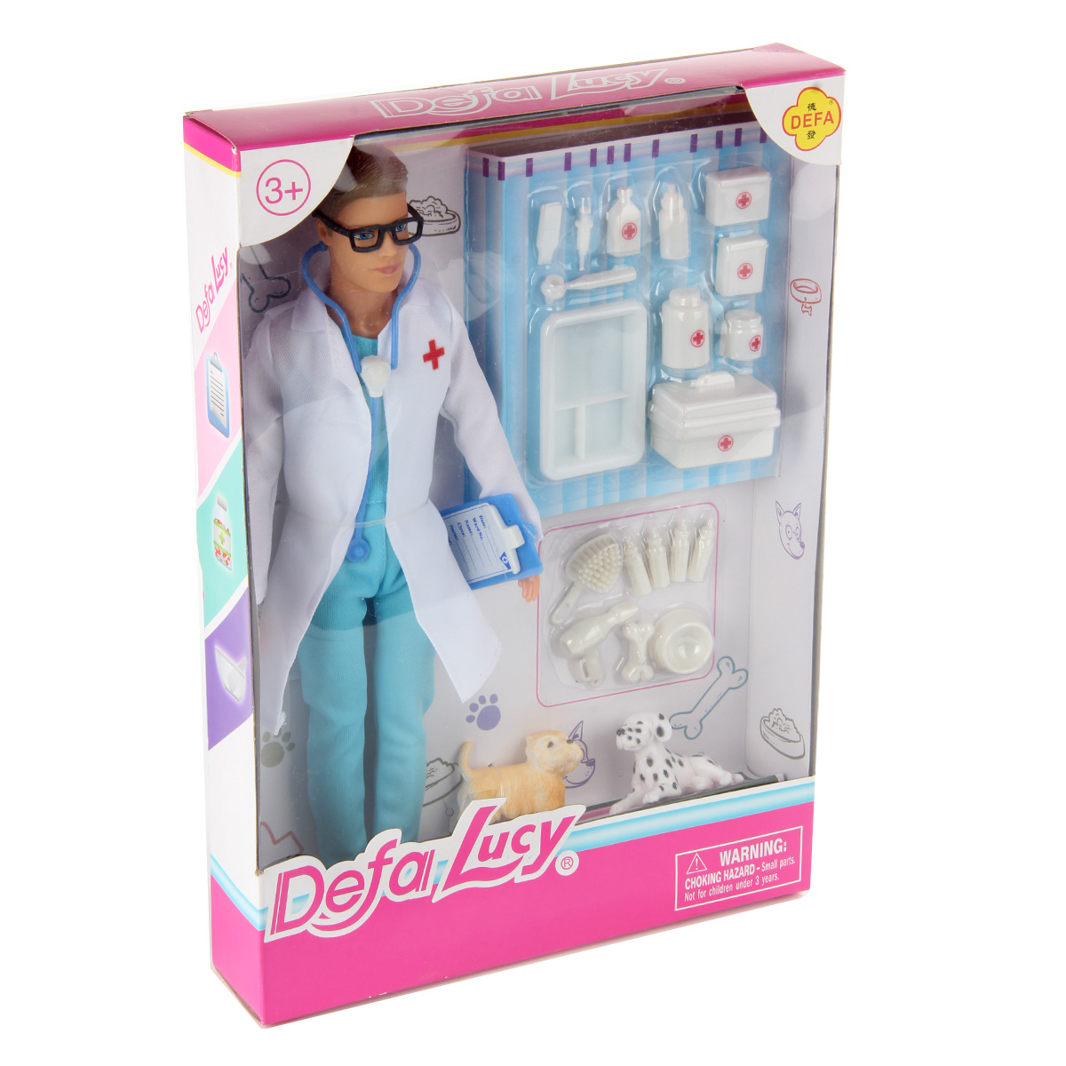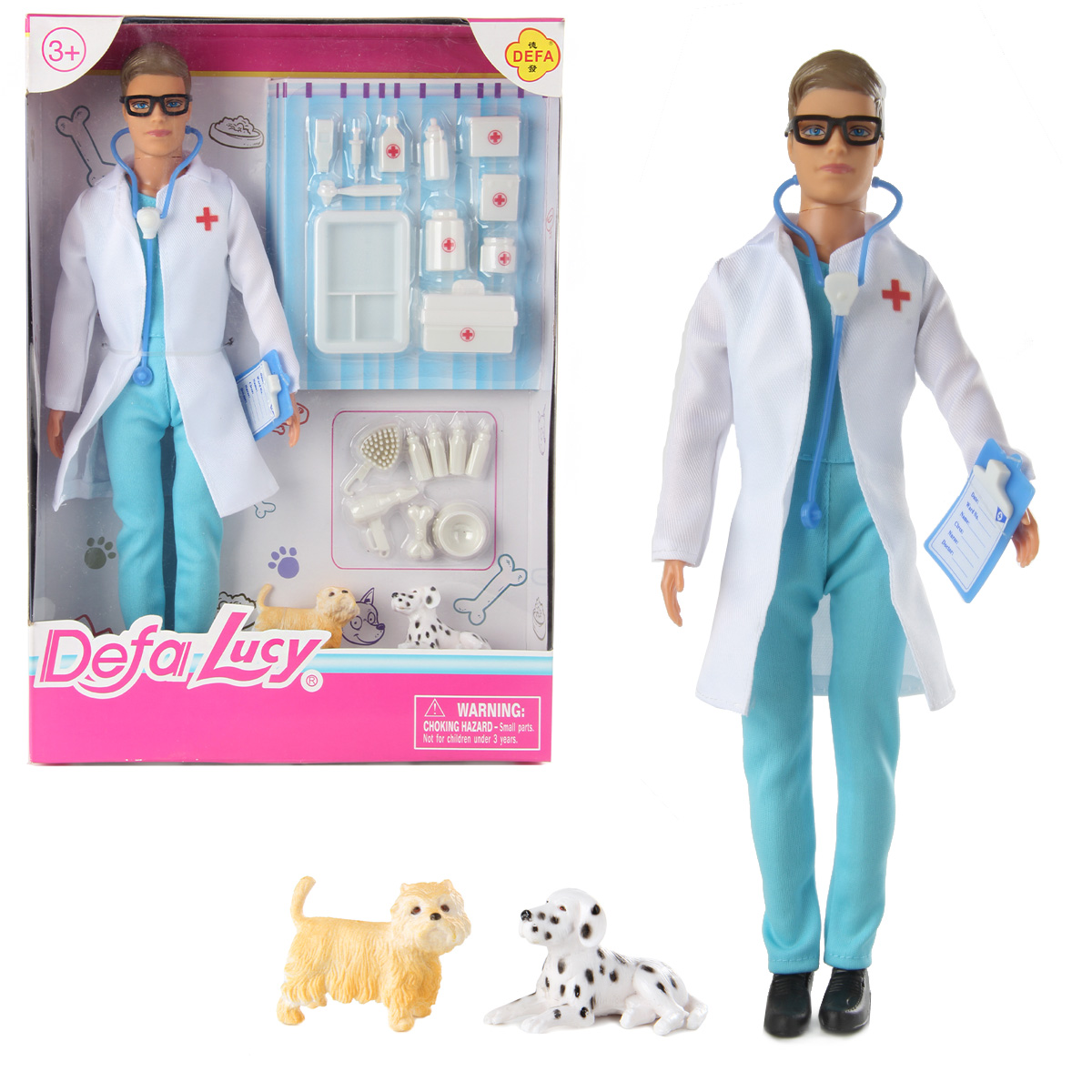 В наборе кукла, 2 питомца, планшет, фен, косточка, миска, расческа, 4 бутылочки для питомцев, лоток, чемоданчик, 2 аптечки, 4 бутылки, 3 врачебных инструмента, стетоскоп.