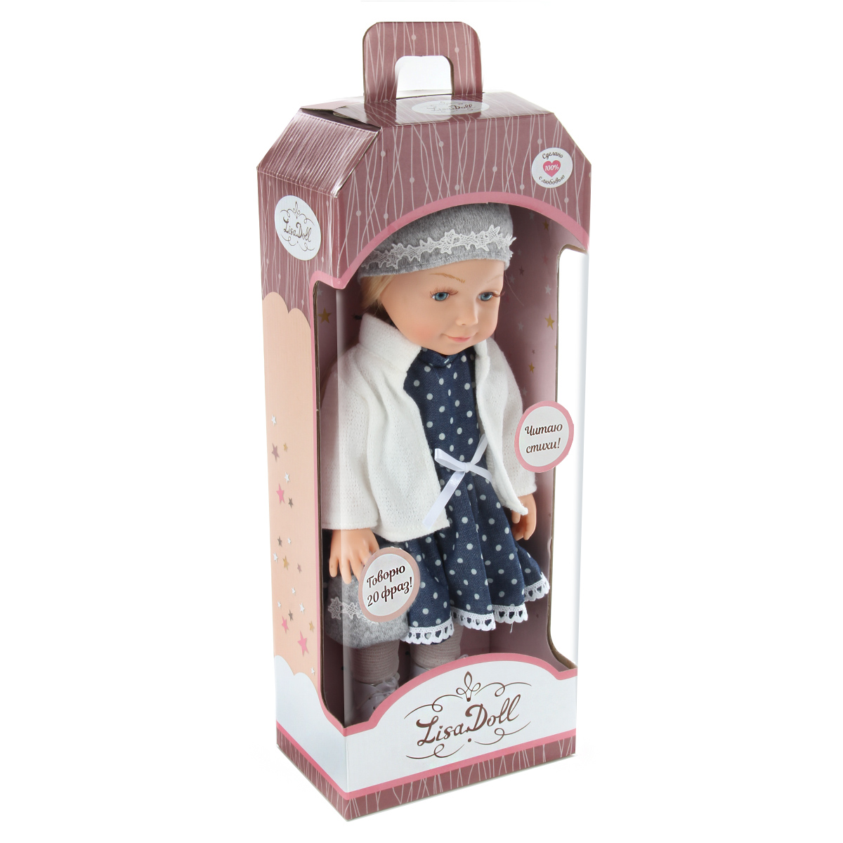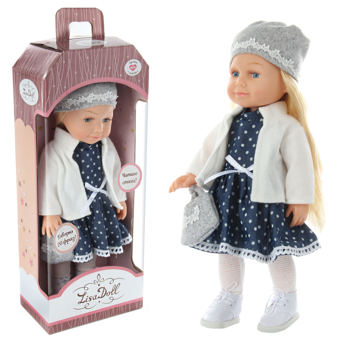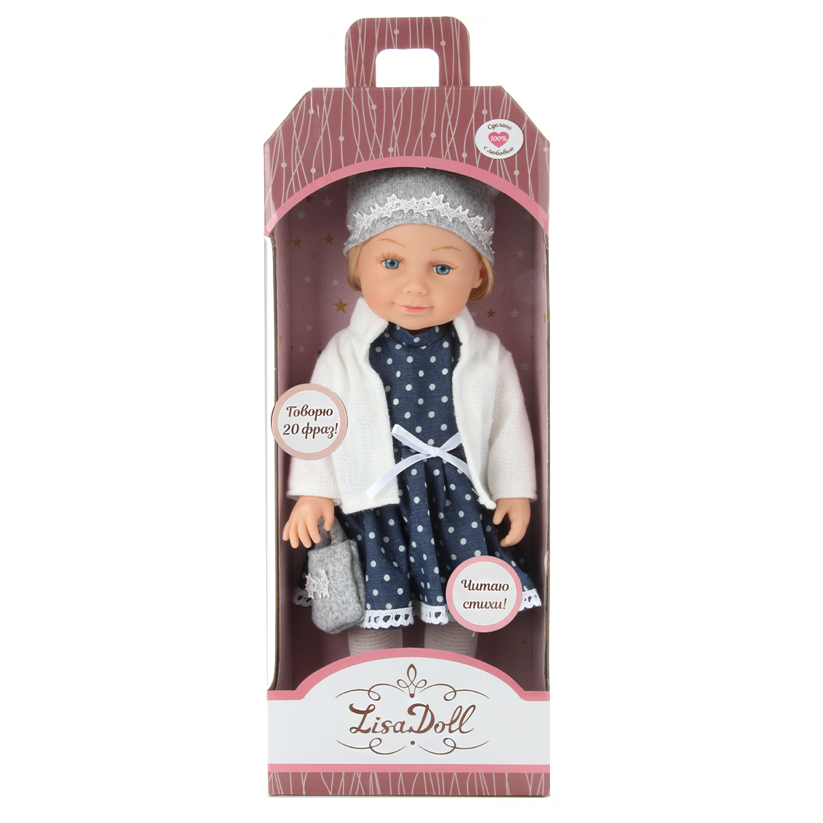 Эта милая и очаровательная куколка покорит сердце любой девочки! Куколка одета в модную одежду, созданную по европейским дизайнам, которая очень ее украшает и создает нежный образ! На голове у куколки шапочка, отделанная красивым узором, на ножках симпатичные ботиночки с колготками, на руке нарядная сумочка. Куколка одета в прелестное платьице, на плечи накинута кофточка.Куколка умеет говорить 20 фраз на русском языке и читать забавные стихи, достаточно нажать на центр корпуса тела. У игрушки длинные красивые волосы, которые можно заплетать в роскошные косички и делать разнообразные прически! Ручки, ножки и голова куклы двигаются, все части тела мягкие на ощупь, глазки не закрываются. Бровки нарисованы, есть реснички. Голова прошита волосами полностью.У коробки есть удобная ручка, которая позволяет комфортно переносить игрушку.Забота о такой куколке научит ребенка ответственности, улучшит коммуникативные и социальные навыки, позволит придумать множество интересных сюжетно-ролевых игр, развивая фантазию!Эта куколка - великолепный подарок для девочки, с которым она проведет немало веселых и занимательных часов игры!Игрушка работает от 3 батареек LR44, входят в комплект.Изготовлена из безопасного и высококачественного винила, аксессуары сшиты из ткани.Размеры куколки: 17*9,5*37 см.Размеры коробки: 17,5*11*44,5 см.