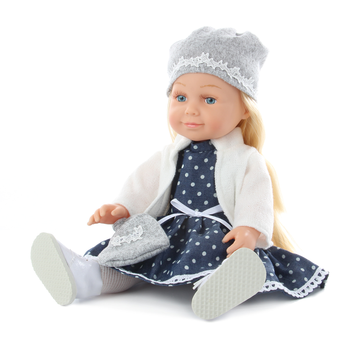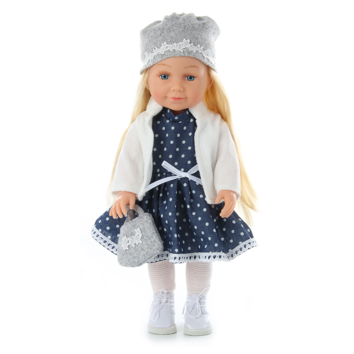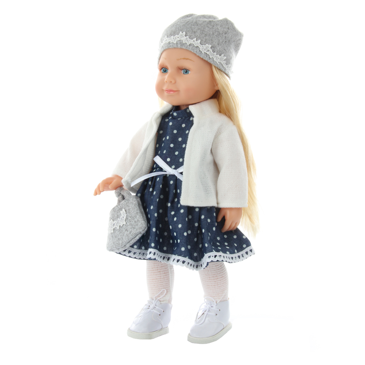 Эта милая и очаровательная куколка покорит сердце любой девочки! Куколка одета в модную одежду, созданную по европейским дизайнам, которая очень ее украшает и создает нежный образ! На голове у куколки шапочка, отделанная красивым узором, на ножках симпатичные ботиночки с колготками, на руке нарядная сумочка. Куколка одета в прелестное платьице, на плечи накинута кофточка.Куколка умеет говорить 20 фраз на русском языке и читать забавные стихи, достаточно нажать на центр корпуса тела. У игрушки длинные красивые волосы, которые можно заплетать в роскошные косички и делать разнообразные прически! Ручки, ножки и голова куклы двигаются, все части тела мягкие на ощупь, глазки не закрываются. Бровки нарисованы, есть реснички. Голова прошита волосами полностью.У коробки есть удобная ручка, которая позволяет комфортно переносить игрушку.Забота о такой куколке научит ребенка ответственности, улучшит коммуникативные и социальные навыки, позволит придумать множество интересных сюжетно-ролевых игр, развивая фантазию!Эта куколка - великолепный подарок для девочки, с которым она проведет немало веселых и занимательных часов игры!Игрушка работает от 3 батареек LR44, входят в комплект.Изготовлена из безопасного и высококачественного винила, аксессуары сшиты из ткани.Размеры куколки: 17*9,5*37 см.Размеры коробки: 17,5*11*44,5 см.