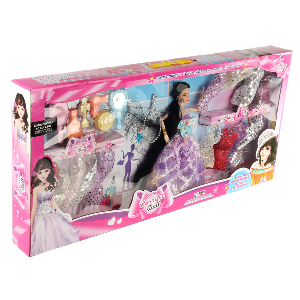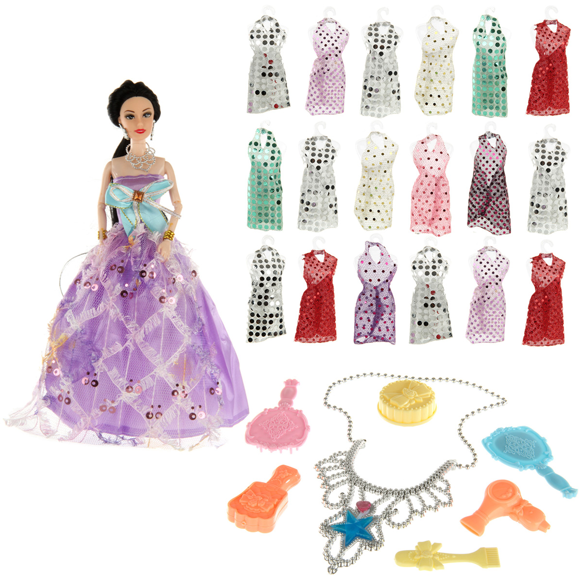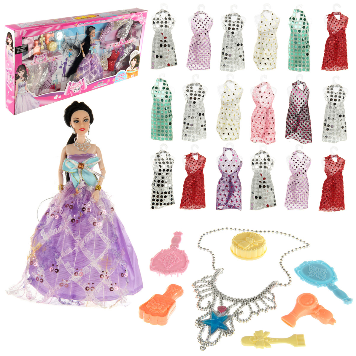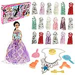 Игрушка кукла с аксессуарами приведет в восторг каждую девочку: - множество нарядов и аксессуаров; - анатомическое строение куклы, позволяющее сгибать руки; - красивая подарочная упаковка. В комплекте 18 нарядов, куколка, игрушка фен, шкатулка, 2 расчески, зеркальце, колье, футляр. Веревочка отделяется от колье. Круглая шкатулка открывается, фен разбирается, футляр разбирается. Функционал куклы: - двигаются руки и ноги, руки можно отвести в стороны, крутится голова; - голова прошита волосами частично, волосы длинные и красивые, можно делать разные прически; - кукла шарнирная, руки сгибаются в локтях и запястьях; - голова, руки мягкие, остальные части тела жесткие. Материал: полимер, текстиль. Размеры куклы: 6*4*29 см. Размеры колье без учета веревочки: 10*2*13 см. Длина веревочки: 34 см. Размеры массажной расчески: 5*2*9 см. Размеры круглой шкатулки: 4*2 см. Размеры зеркала: 5*0,5*9 см. Размеры коробки: 72*7*34 см.