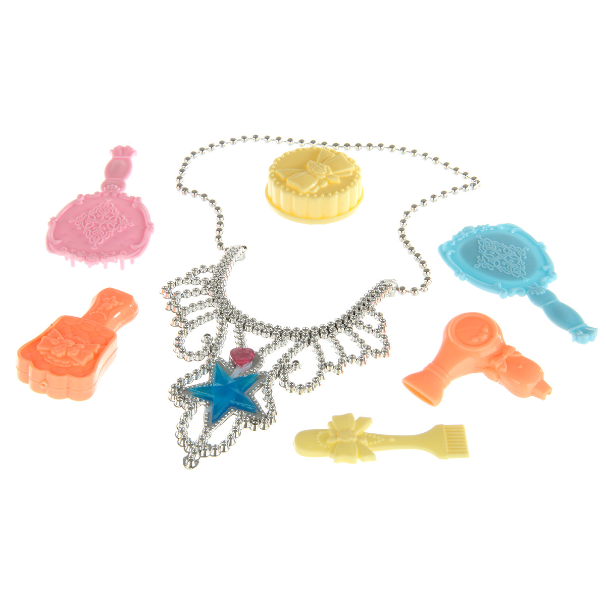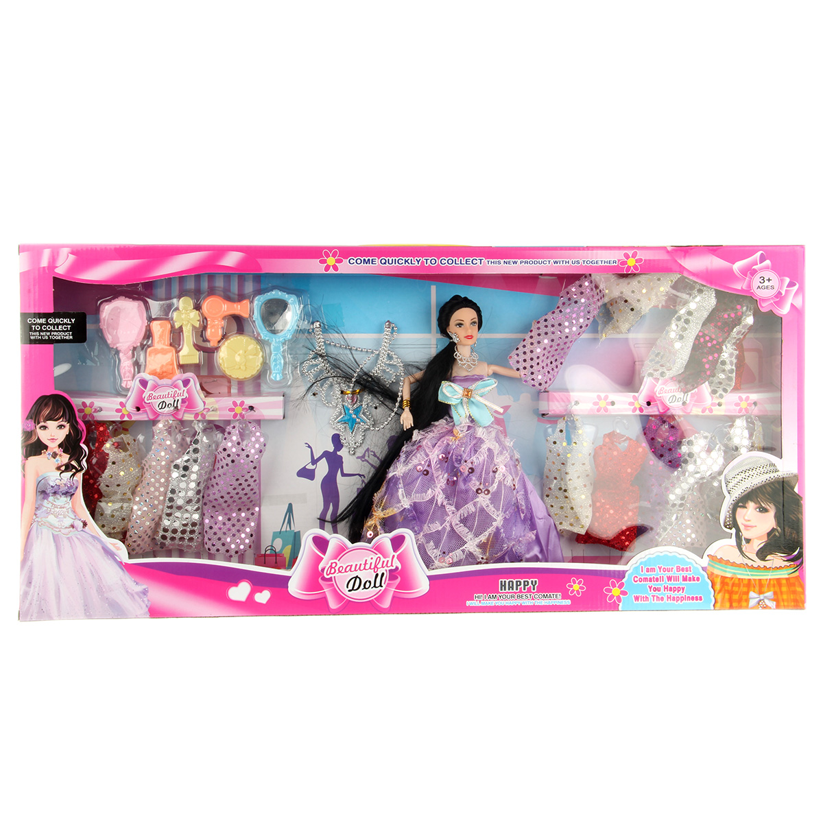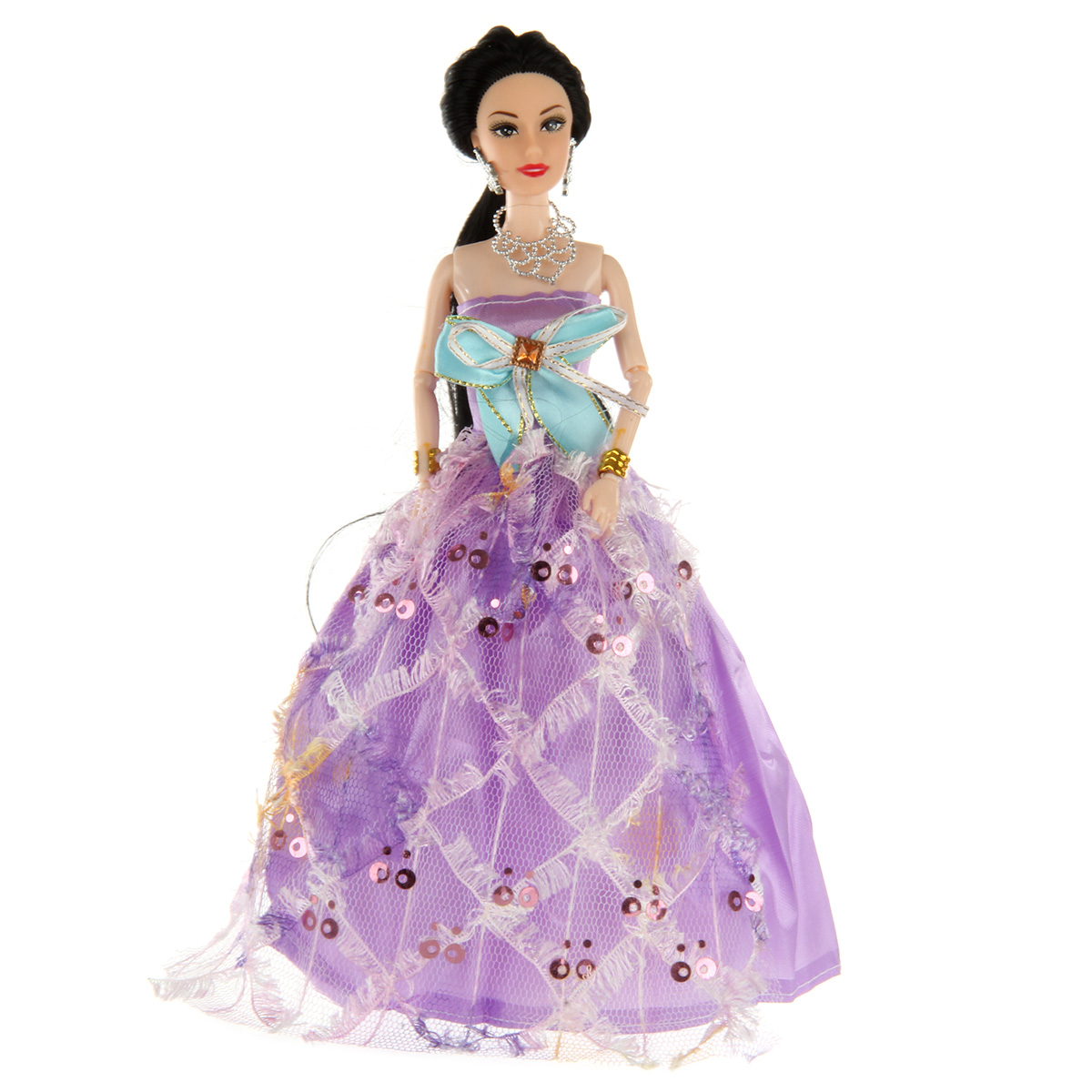 Игрушка кукла с аксессуарами приведет в восторг каждую девочку: - множество нарядов и аксессуаров; - анатомическое строение куклы, позволяющее сгибать руки; - красивая подарочная упаковка. В комплекте 18 нарядов, куколка, игрушка фен, шкатулка, 2 расчески, зеркальце, колье, футляр. Веревочка отделяется от колье. Круглая шкатулка открывается, фен разбирается, футляр разбирается. Функционал куклы: - двигаются руки и ноги, руки можно отвести в стороны, крутится голова; - голова прошита волосами частично, волосы длинные и красивые, можно делать разные прически; - кукла шарнирная, руки сгибаются в локтях и запястьях; - голова, руки мягкие, остальные части тела жесткие. Материал: полимер, текстиль. Размеры куклы: 6*4*29 см. Размеры колье без учета веревочки: 10*2*13 см. Длина веревочки: 34 см. Размеры массажной расчески: 5*2*9 см. Размеры круглой шкатулки: 4*2 см. Размеры зеркала: 5*0,5*9 см. Размеры коробки: 72*7*34 см.