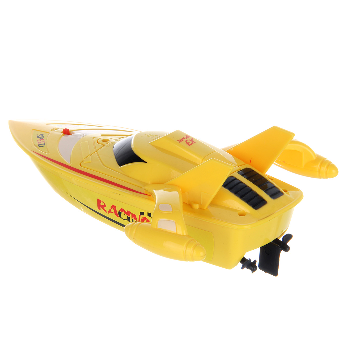 Катер плавает во все стороны, работает без соприкосновения с водой, руль направления двигается вручную.