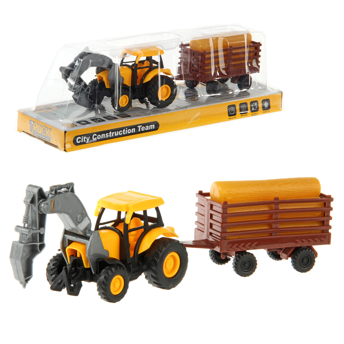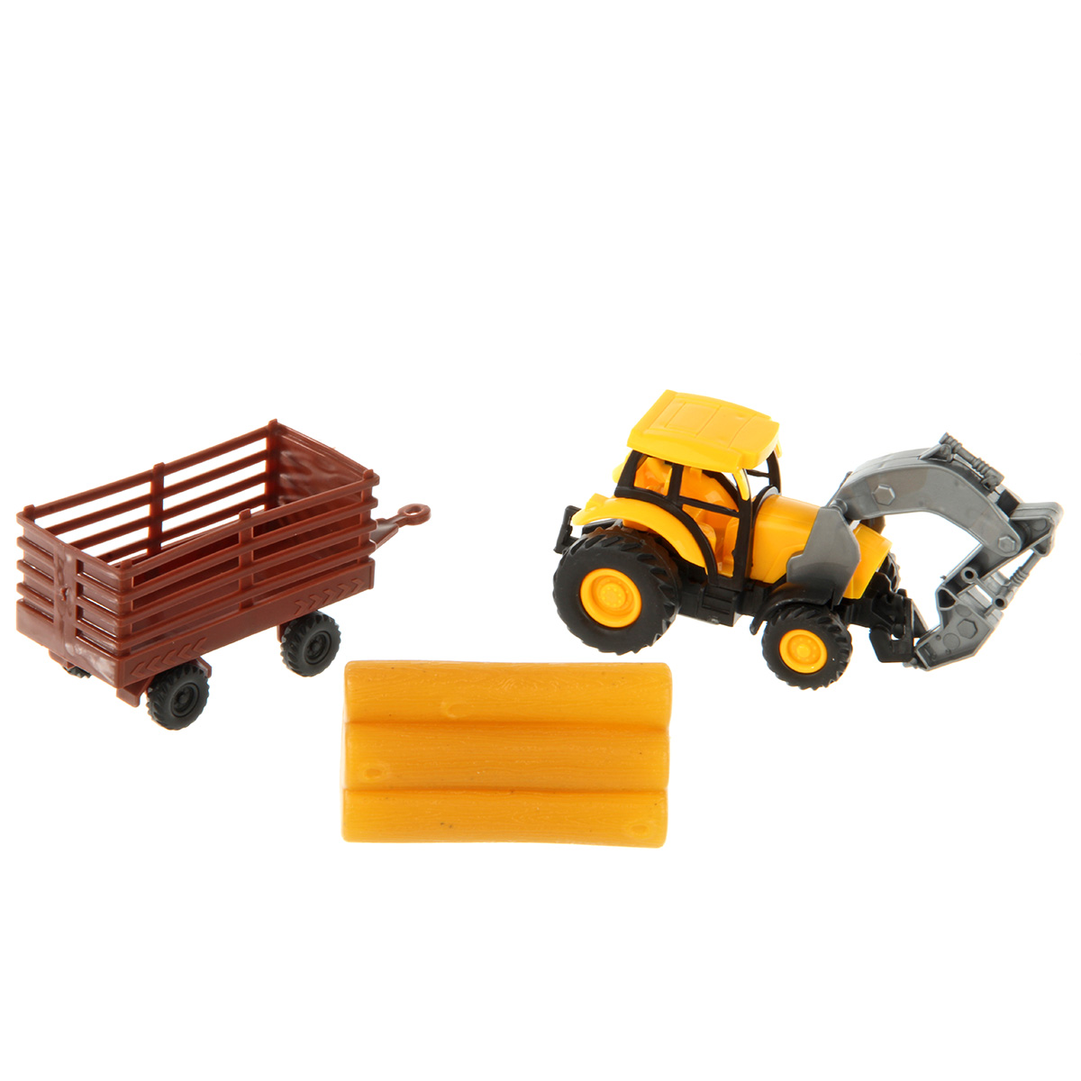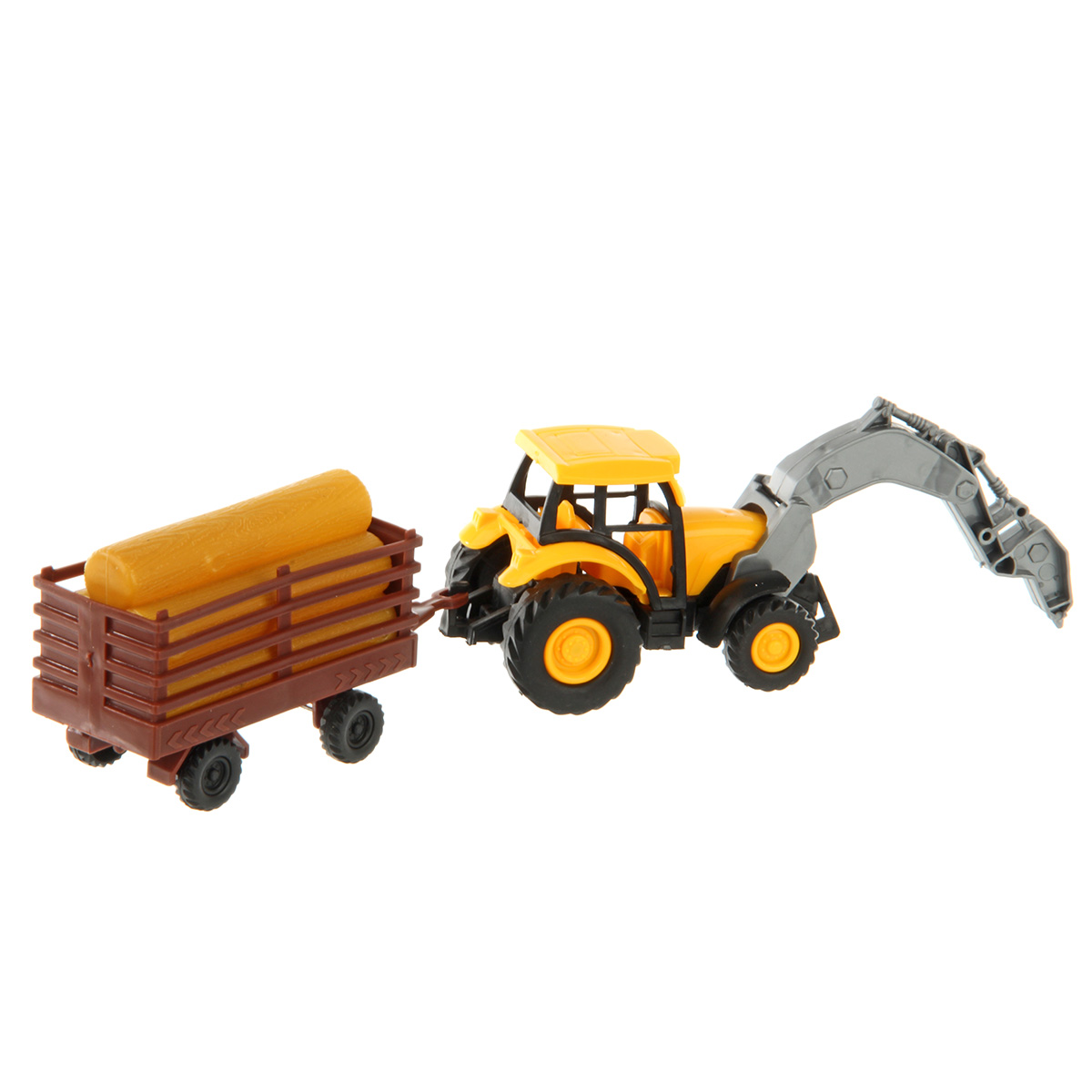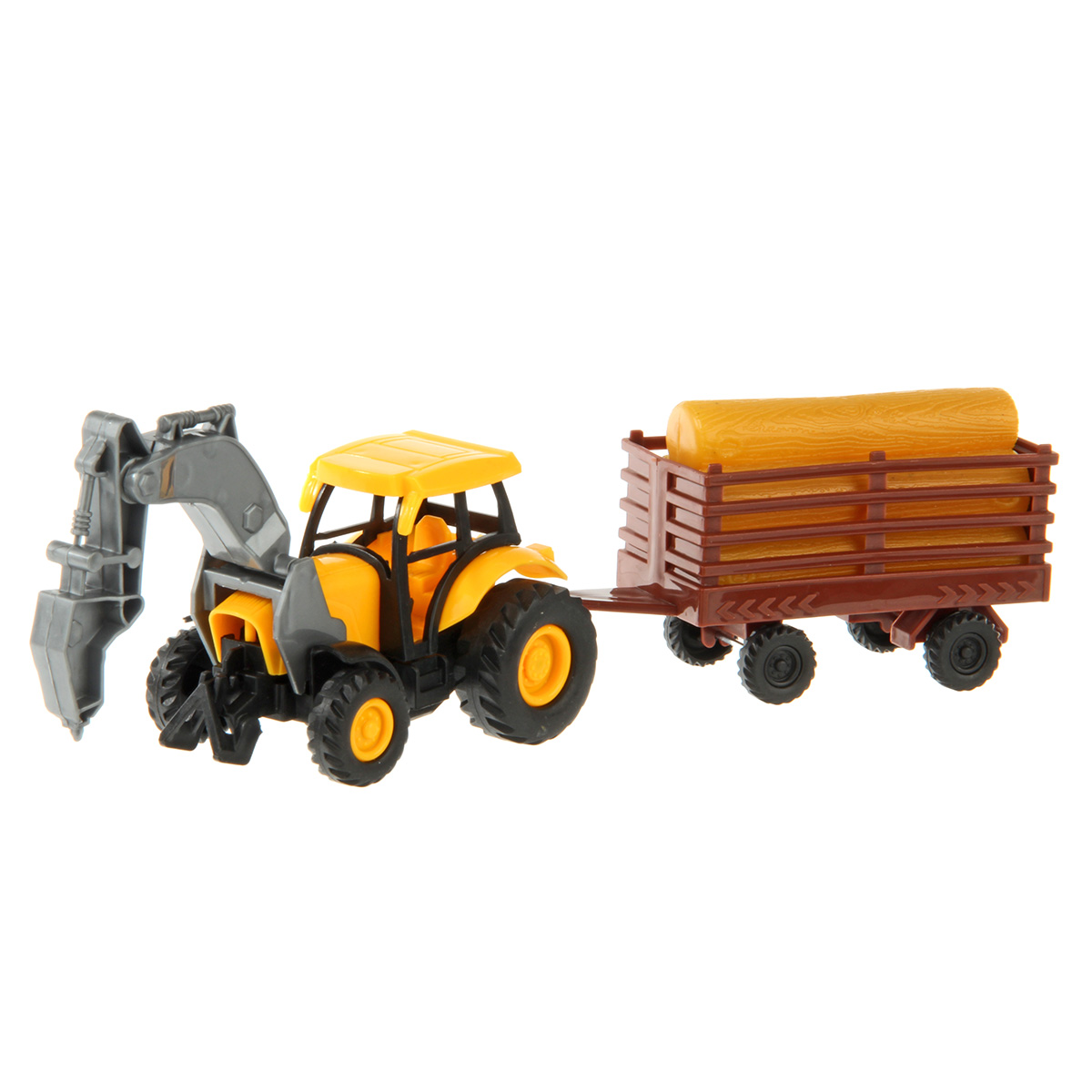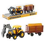 Спецтехника в уменьшенном размере для увлекательных сюжетно-ролевых игр. В комплекте игрушка трактор, прицеп с бревнами. Транспорт катается вперед и назад. Прицеп отсоединяется от трактора. Бревна вынимаются. У трактора поднимается стрела, стрела складывается. Инерционный механизм трактора. Полимер. Размеры трактора с прицепом 25х5х5 см. Размеры прицепа с учетом сцепки 11х4х5 см. Размеры трактора 14х5х5 см. Размеры бревен 7х3х4 см. Размеры в упаковке 27х8х9 см.