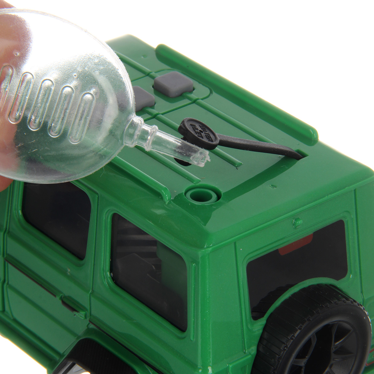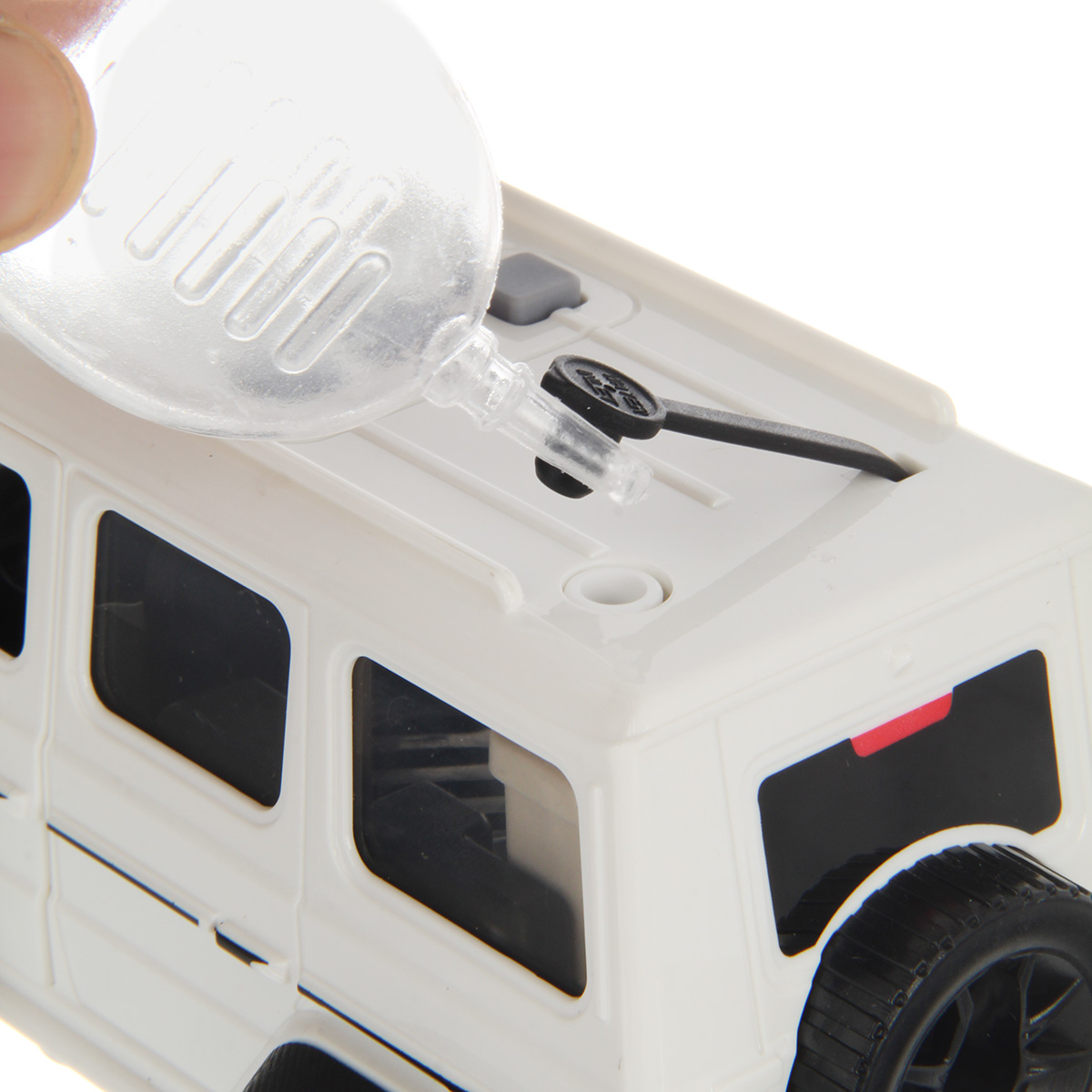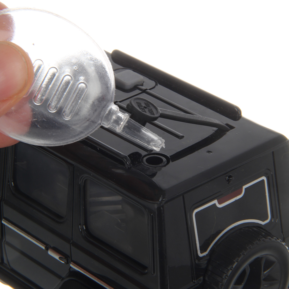 3. При нажатии на кнопки на крыше издает звуки сирены, заводящегося двигателя, проигрывает 2 мелодии, подсветка передних фар и лампочки в районе запасного колеса, из отверстия в районе запасного колеса идет пар. Вода наливается в отсек на крыше, выньте заглушку.