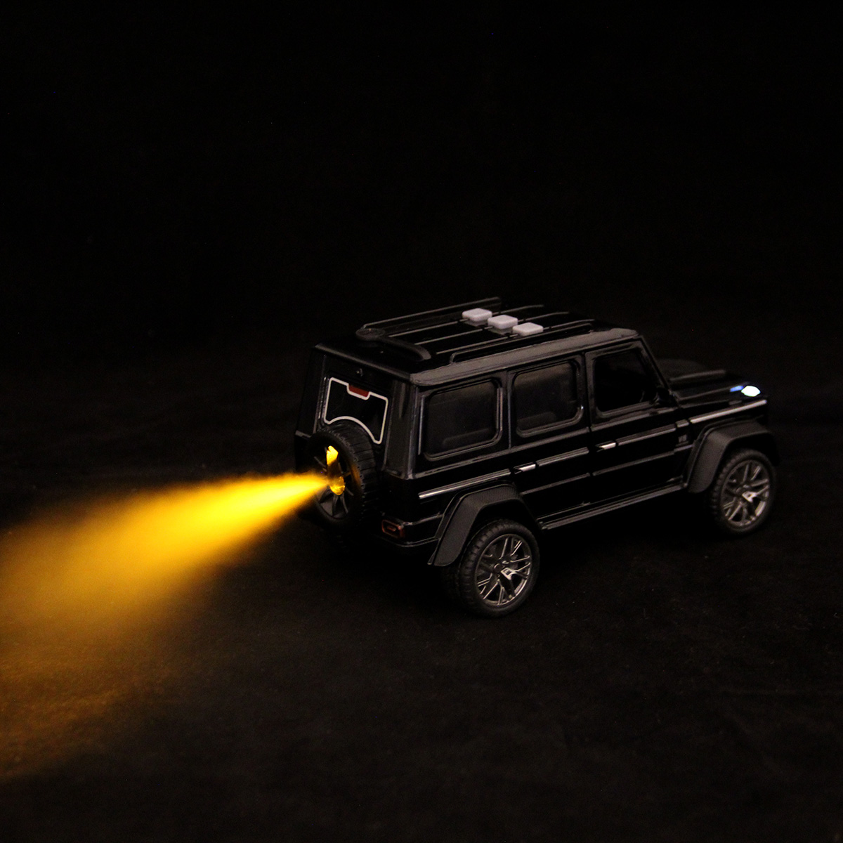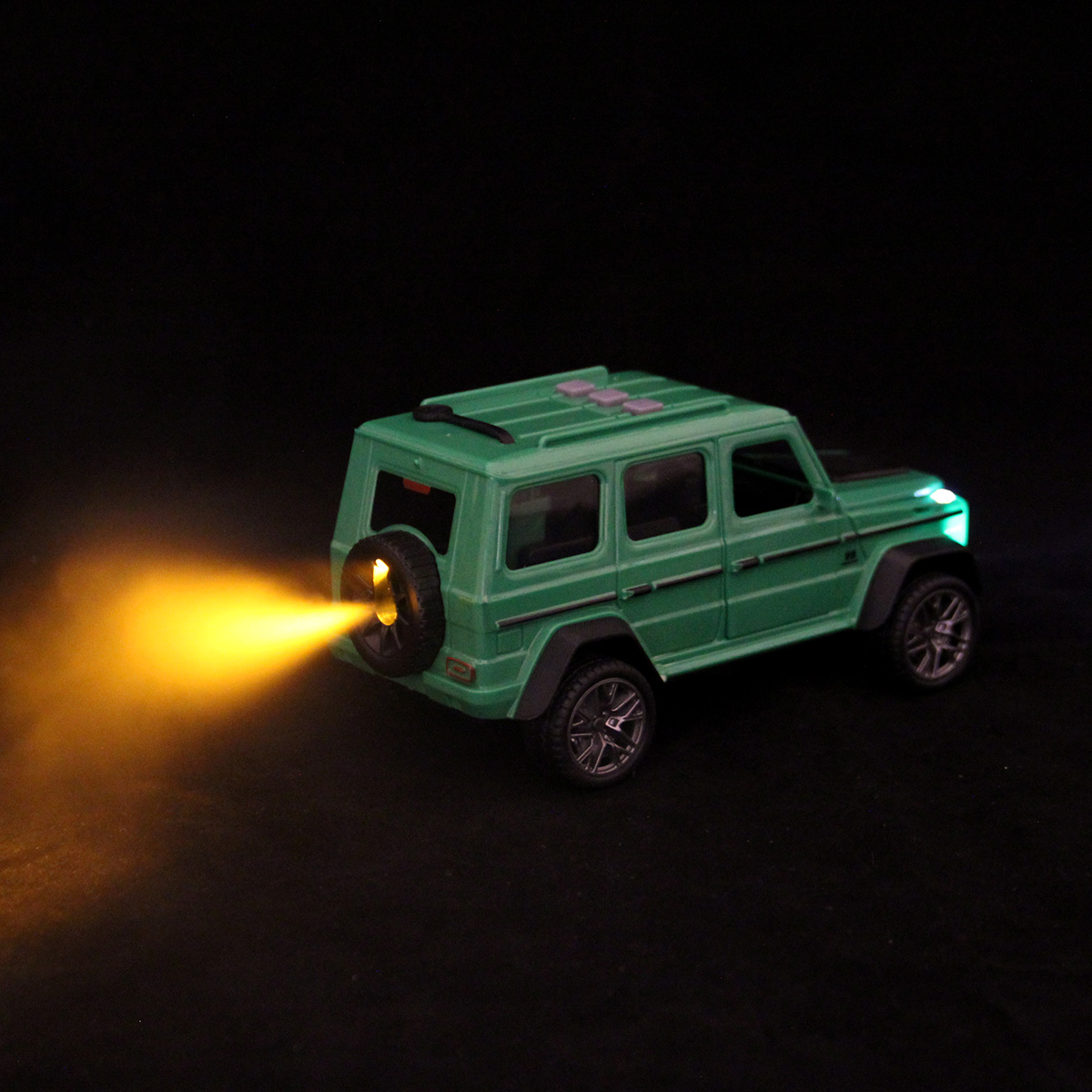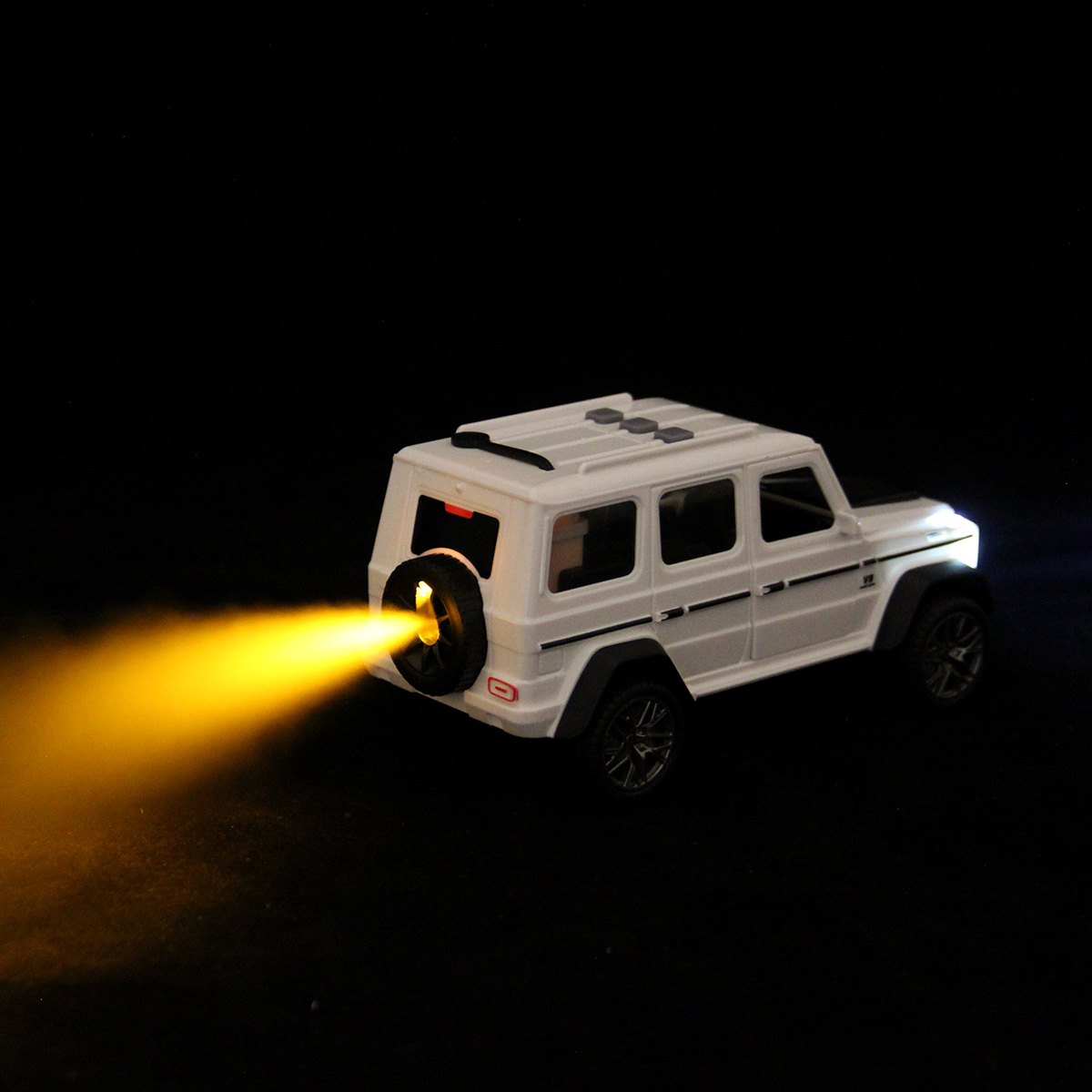 3. При нажатии на кнопки на крыше издает звуки сирены, заводящегося двигателя, проигрывает 2 мелодии, подсветка передних фар и лампочки в районе запасного колеса, из отверстия в районе запасного колеса идет пар. Вода наливается в отсек на крыше, выньте заглушку.