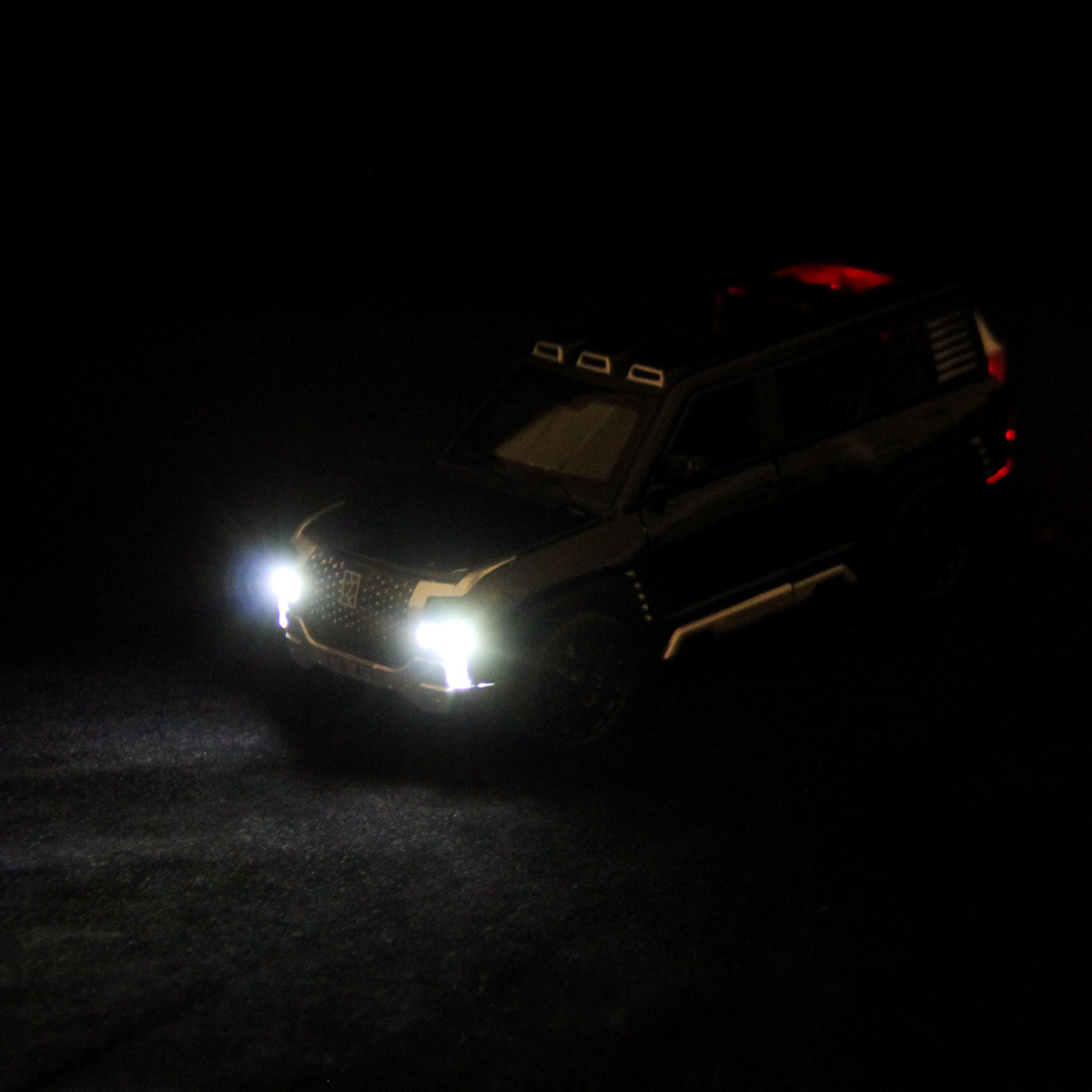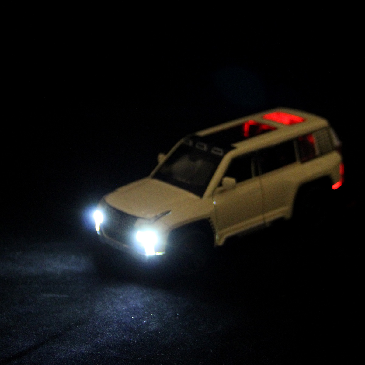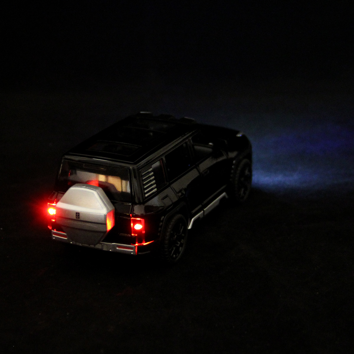 2. При нажатии на передние колеса издает звуки заводящегося двигателя, едущего транспорта и аварийного торможения, подсветка передних и задних фар.