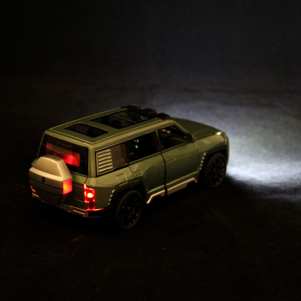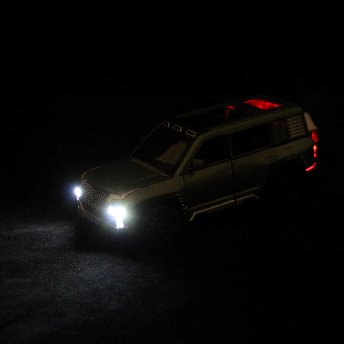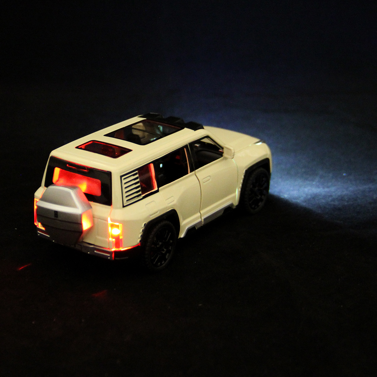 2. При нажатии на передние колеса издает звуки заводящегося двигателя, едущего транспорта и аварийного торможения, подсветка передних и задних фар.