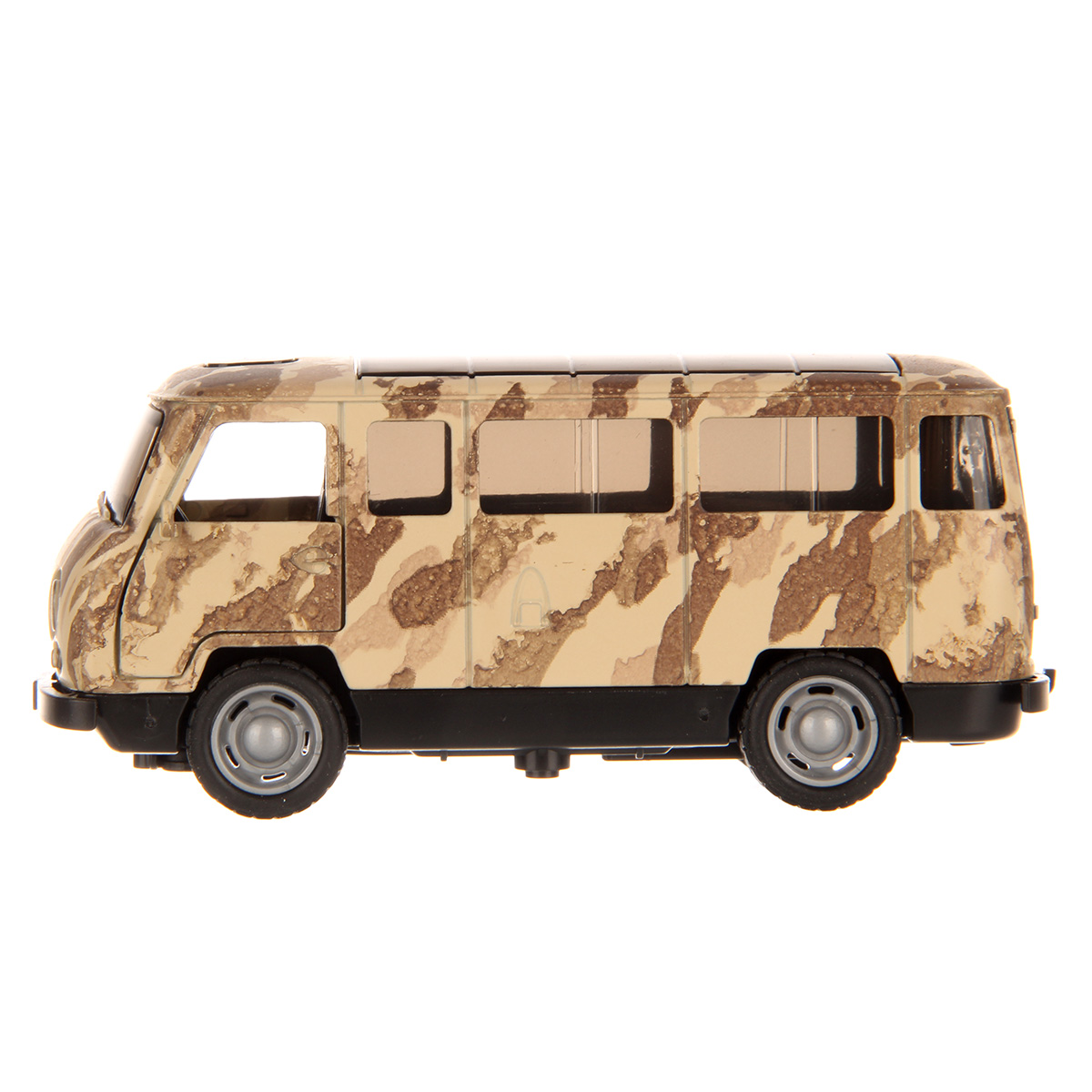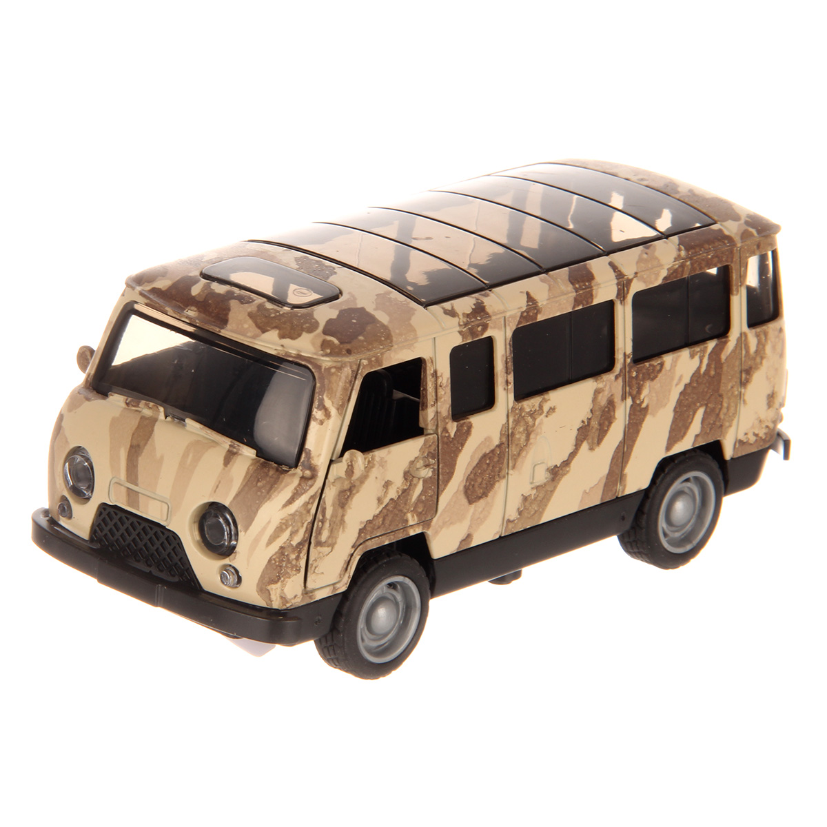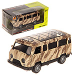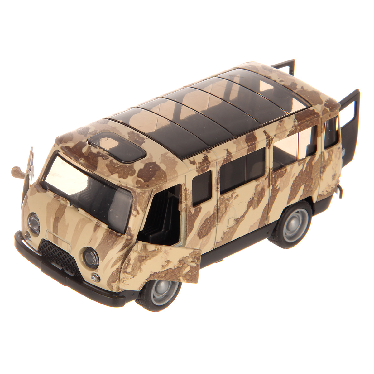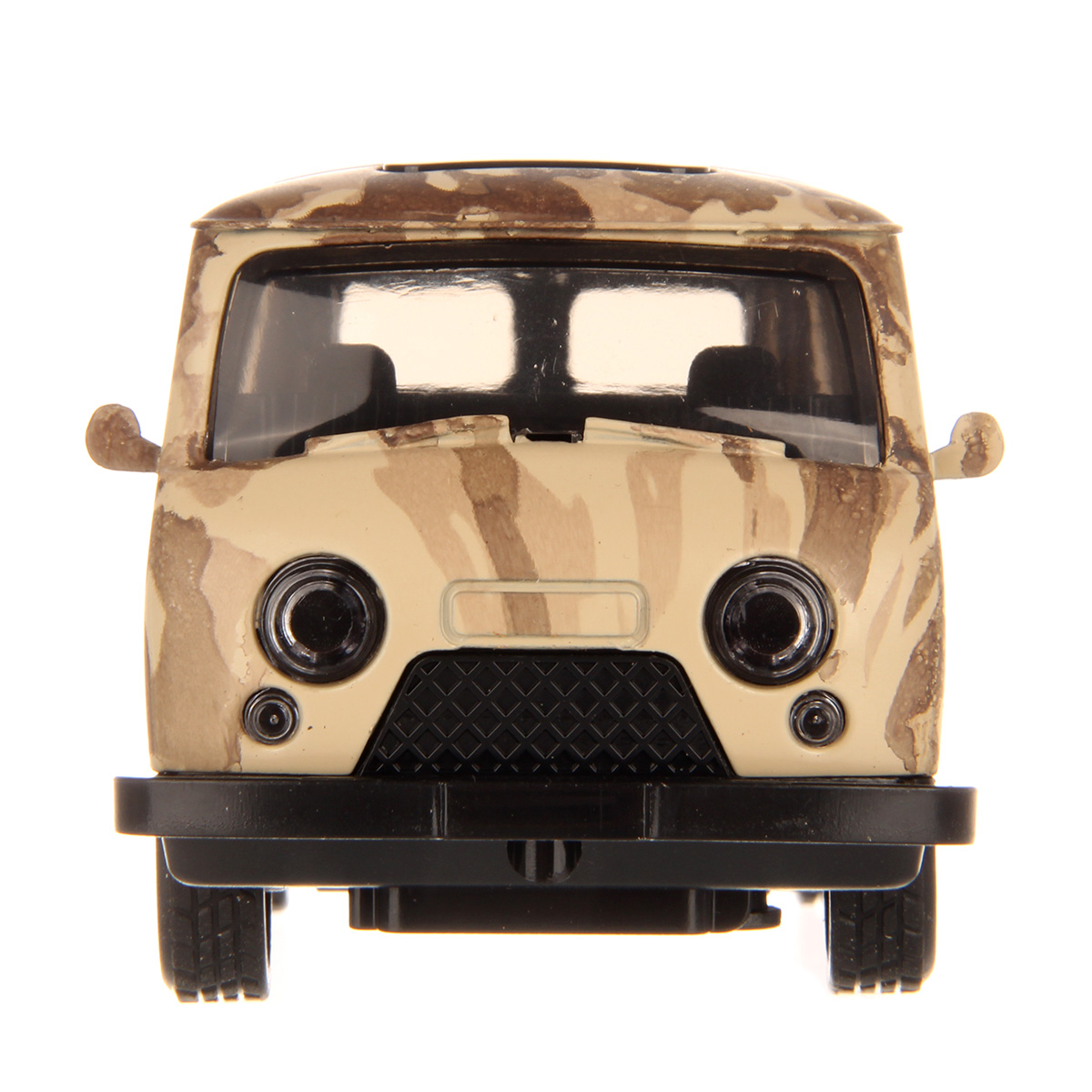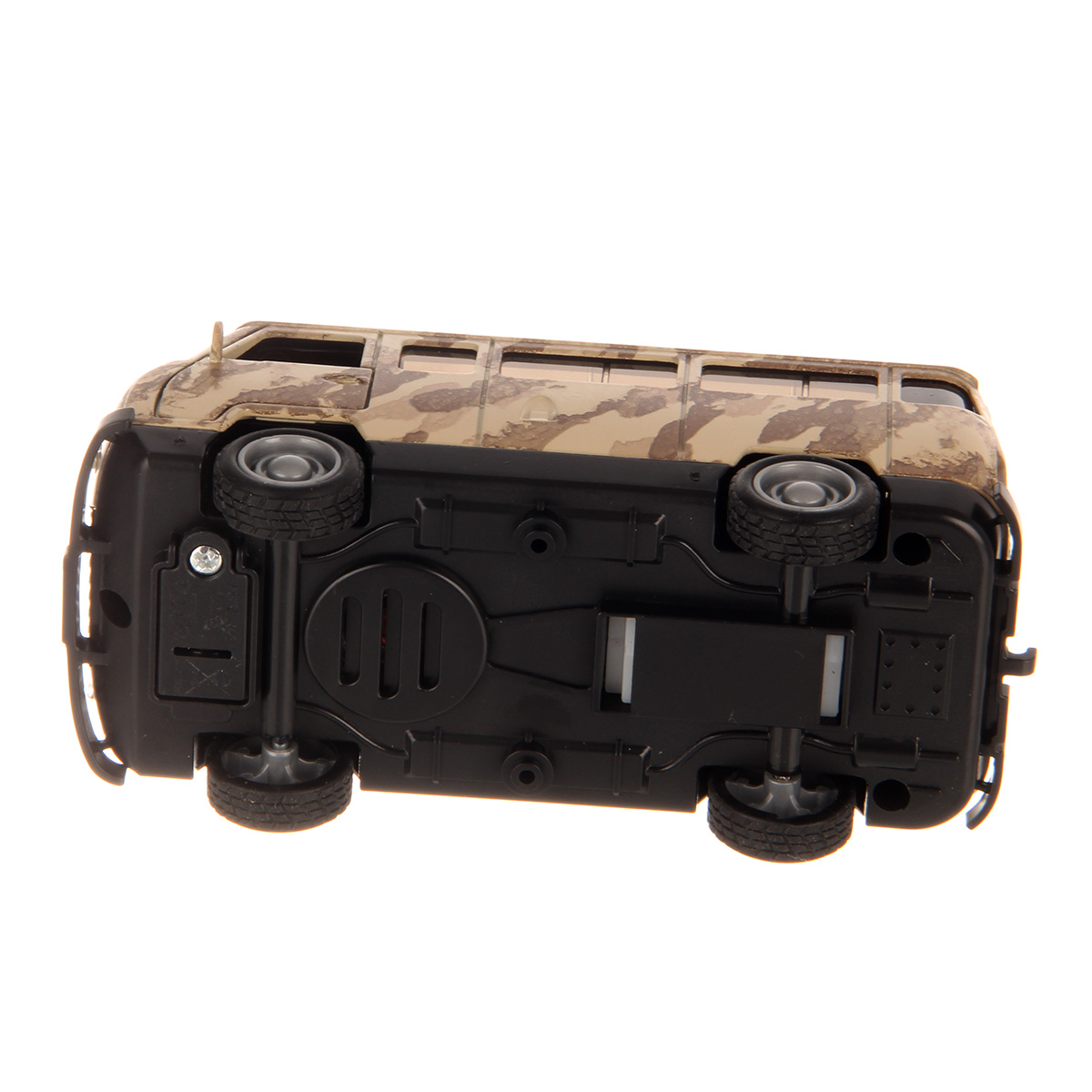 Металлический корпус, катается вперед и назад, оснащена инерционным механизмом, открываются дверки салона и дверки фургона, колеса прорезинены. При нажатии на передние колеса издает звуки заводящегося двигателя и едущего транспорта, подсветка передних фар.