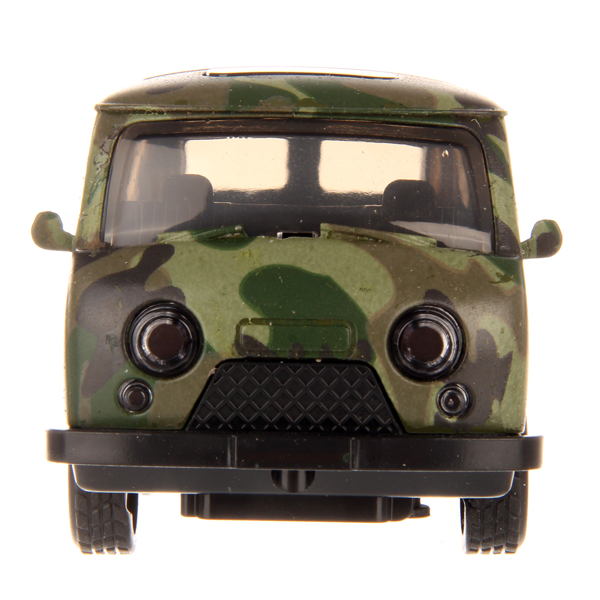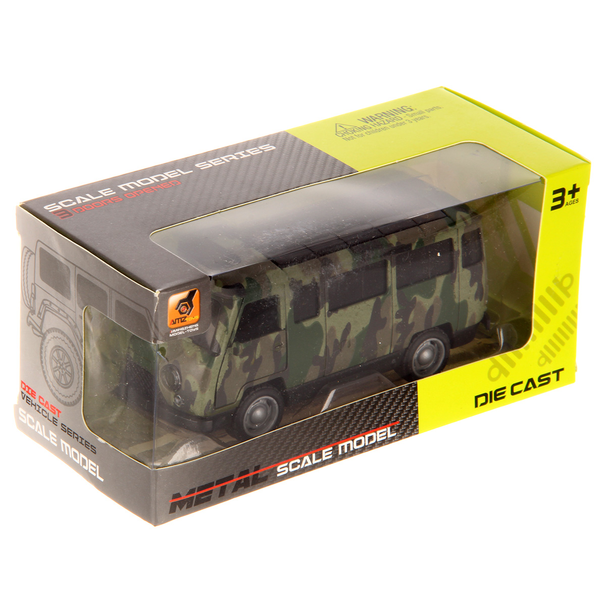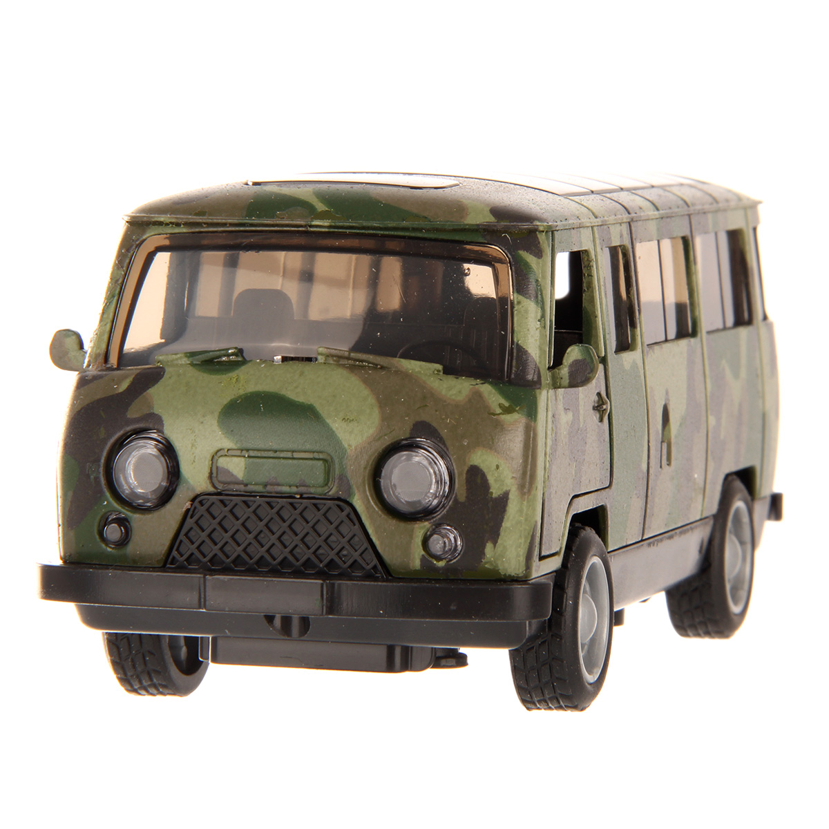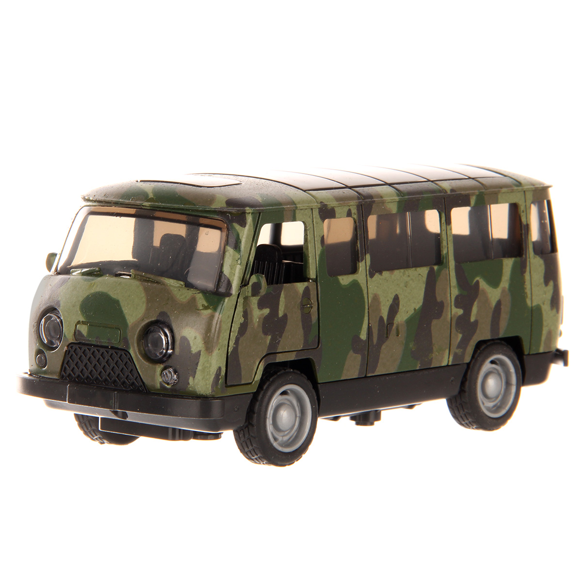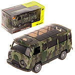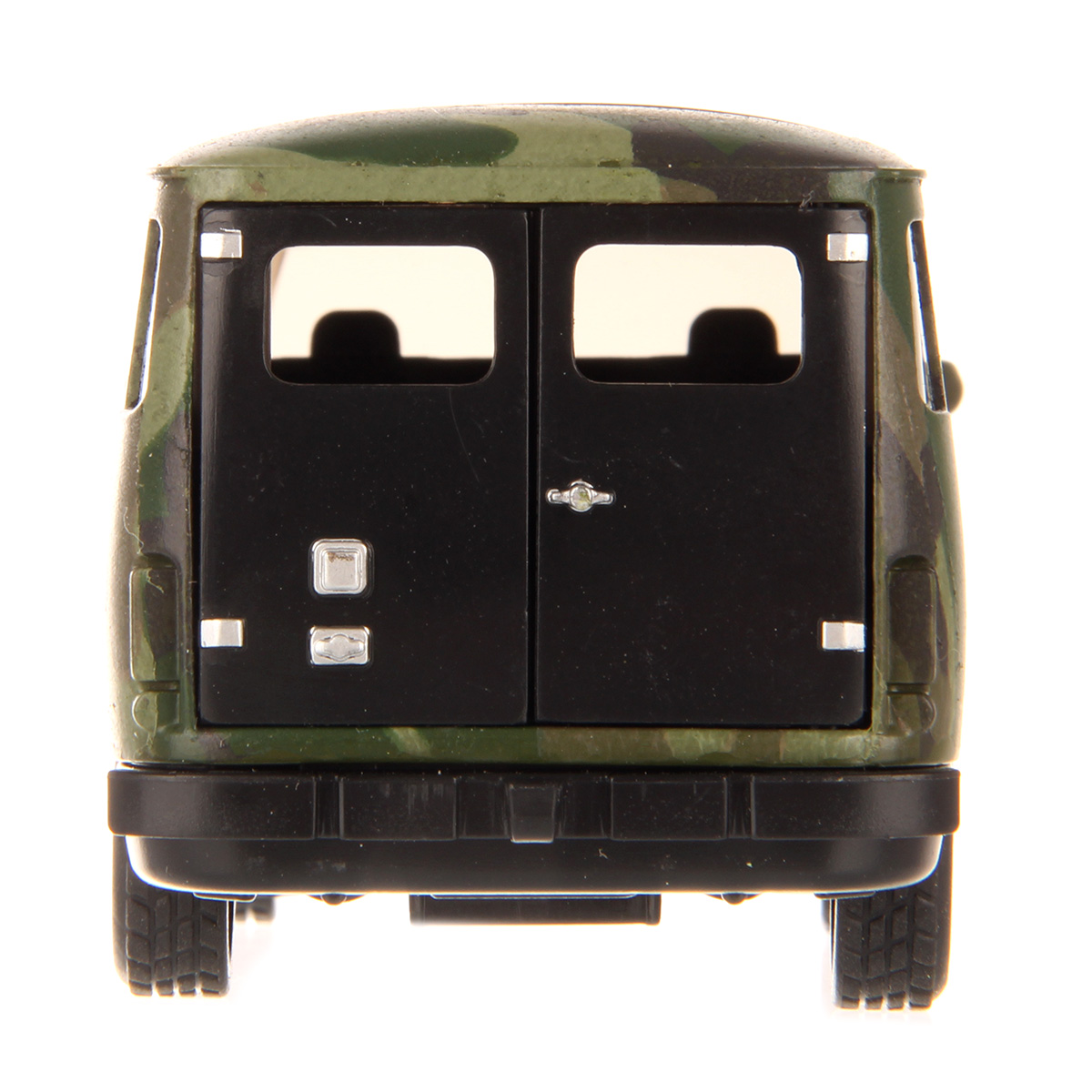 Металлический корпус, катается вперед и назад, оснащена инерционным механизмом, открываются дверки салона и дверки фургона, колеса прорезинены. При нажатии на передние колеса издает звуки заводящегося двигателя и едущего транспорта, подсветка передних фар.