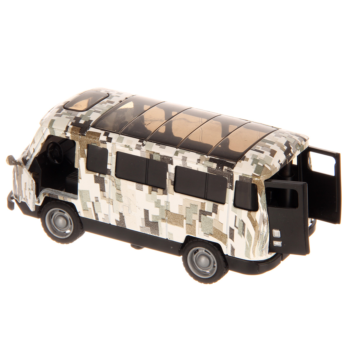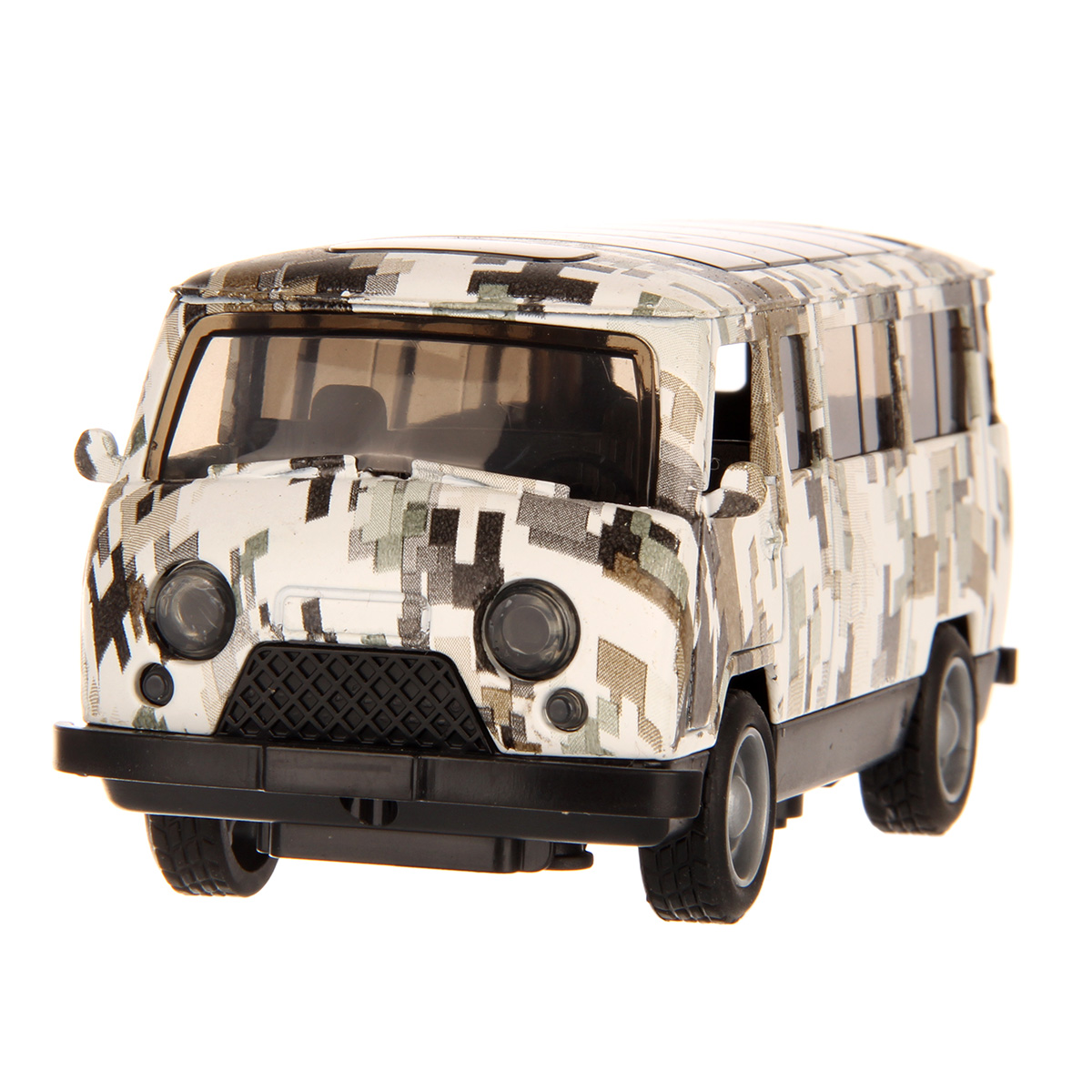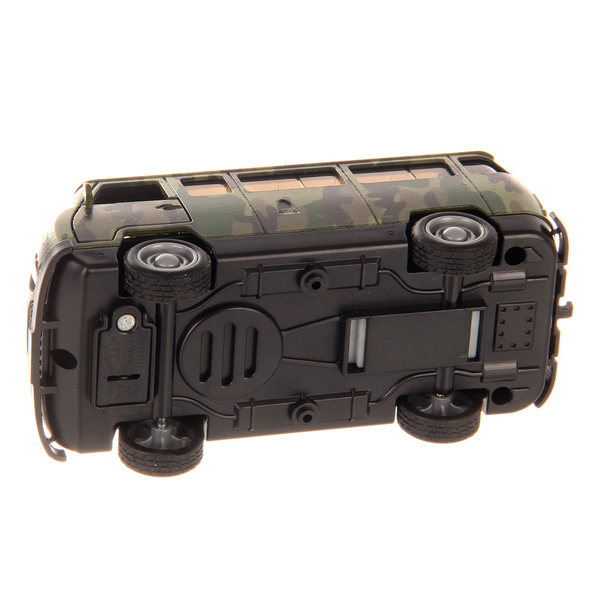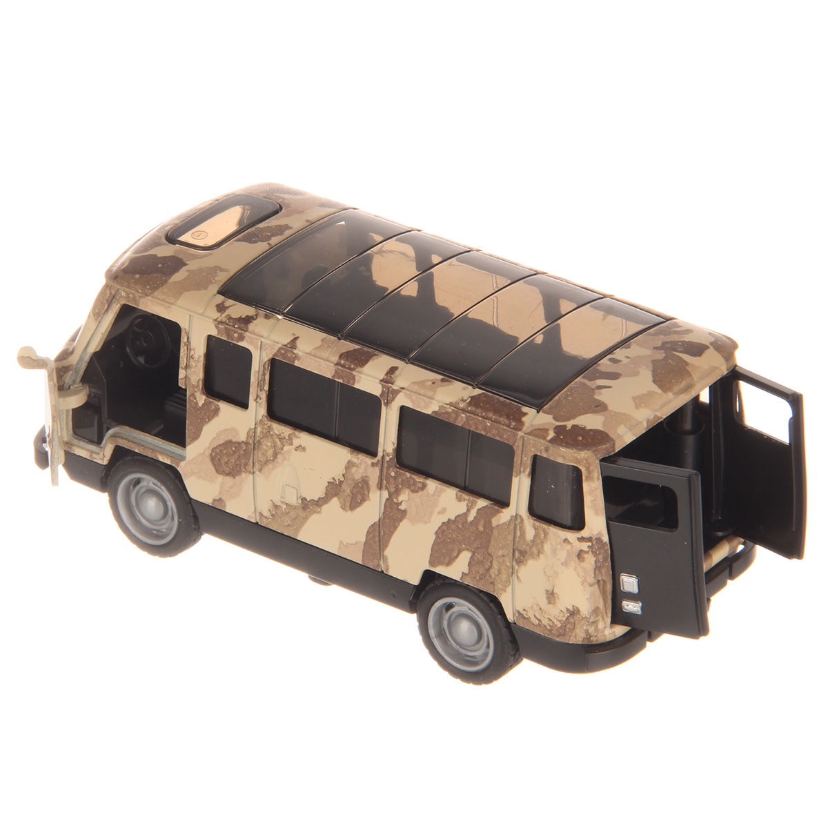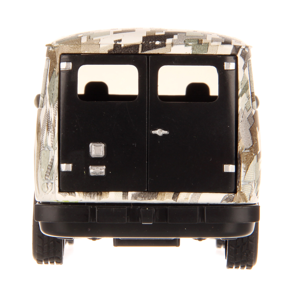 Металлический корпус, катается вперед и назад, оснащена инерционным механизмом, открываются дверки салона и дверки фургона, колеса прорезинены. При нажатии на передние колеса издает звуки заводящегося двигателя и едущего транспорта, подсветка передних фар.