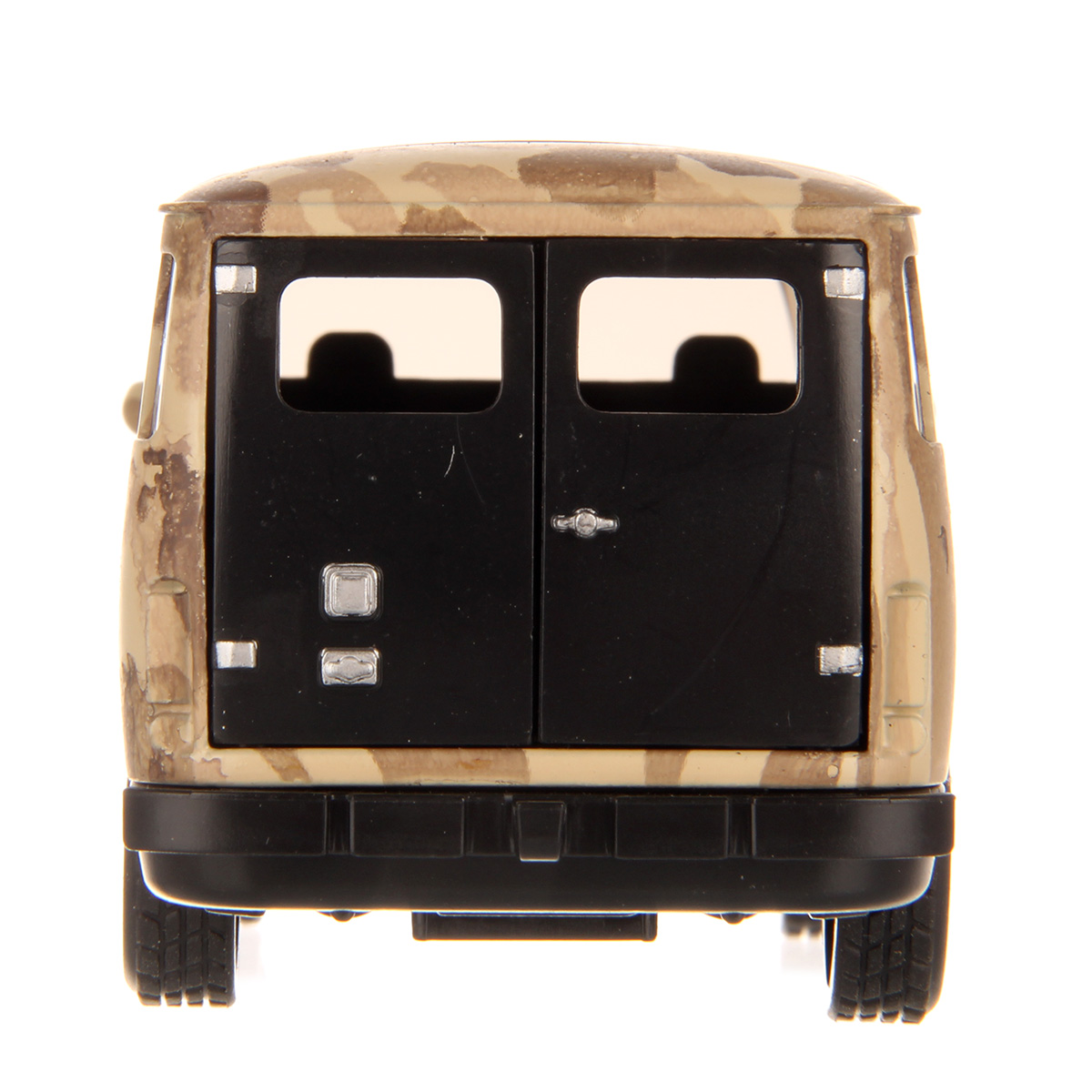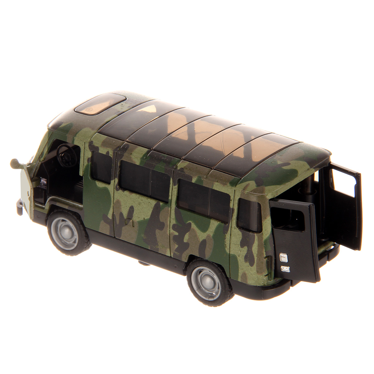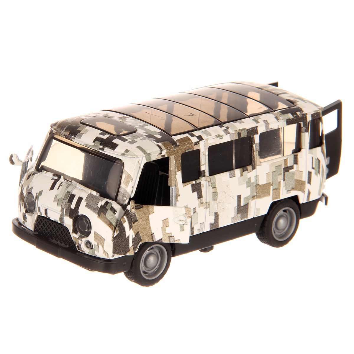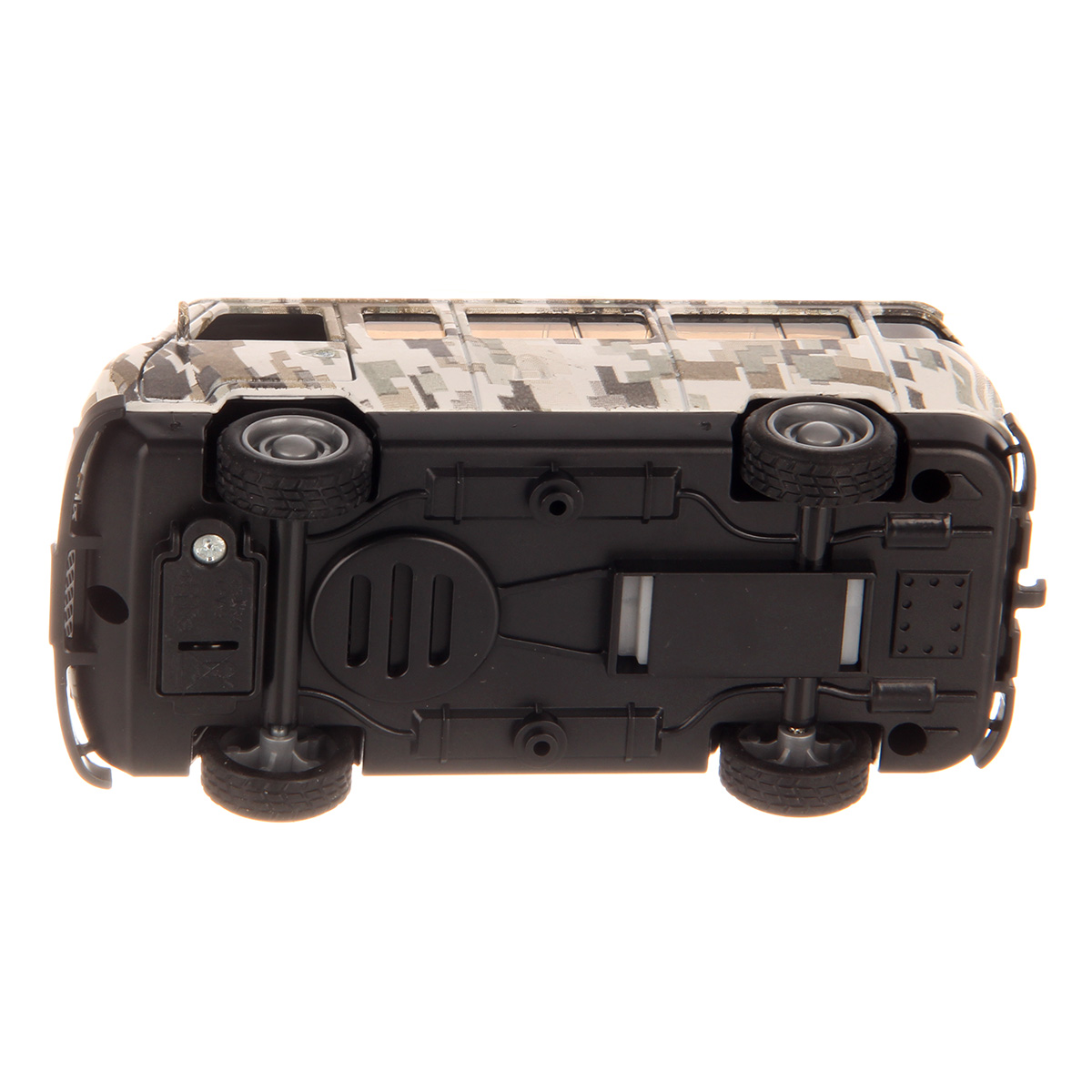 Металлический корпус, катается вперед и назад, оснащена инерционным механизмом, открываются дверки салона и дверки фургона, колеса прорезинены. При нажатии на передние колеса издает звуки заводящегося двигателя и едущего транспорта, подсветка передних фар.