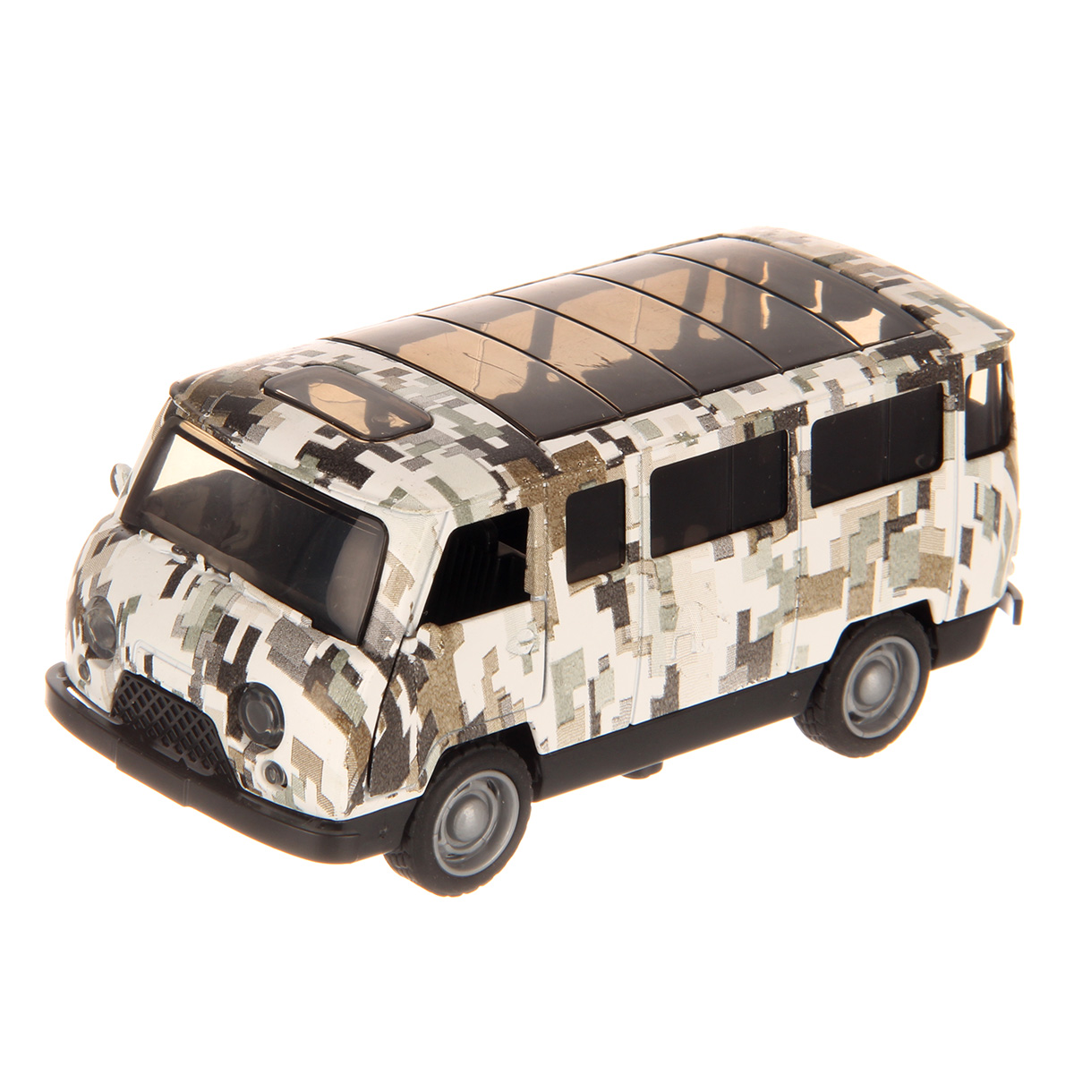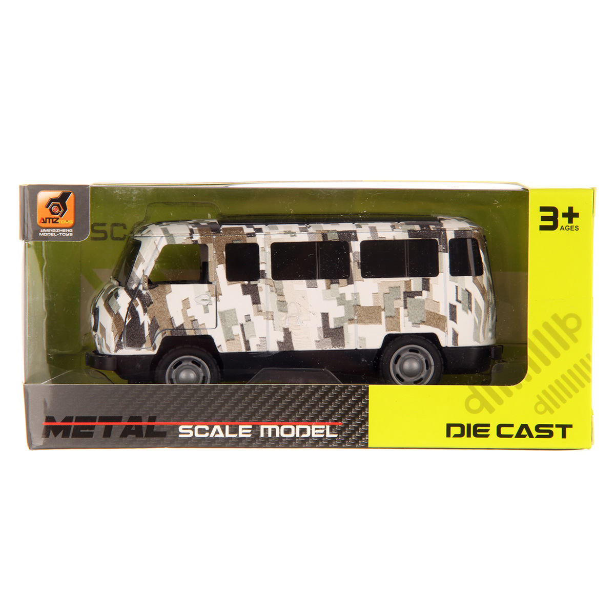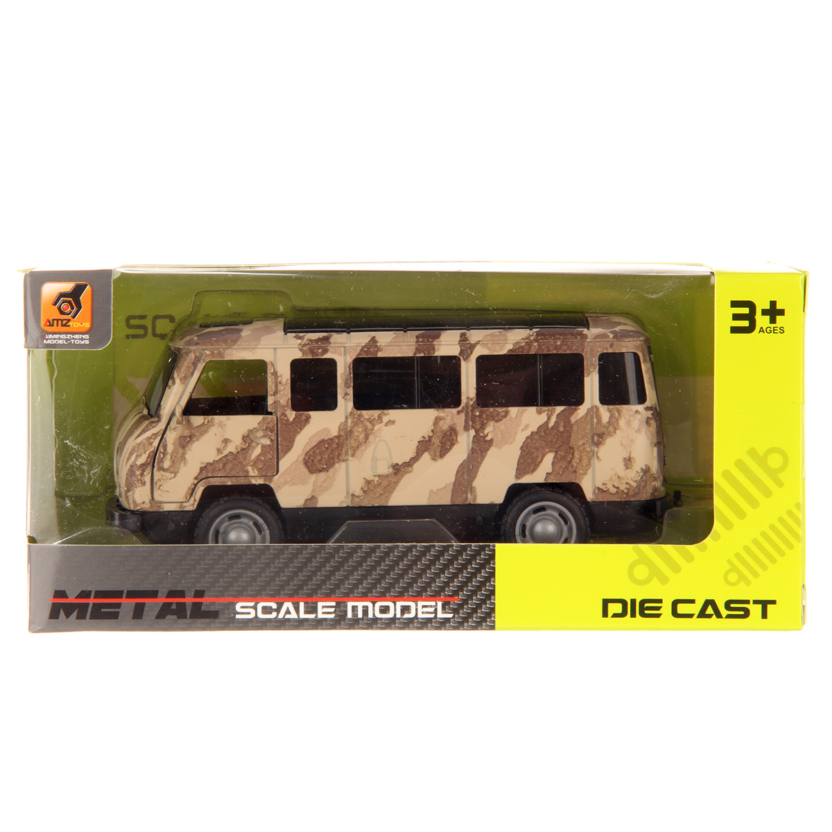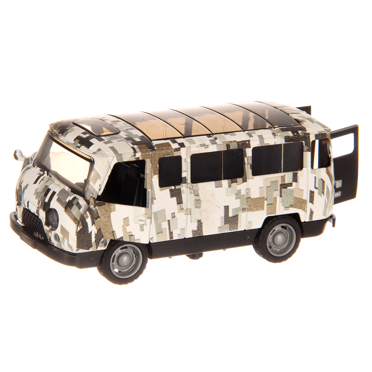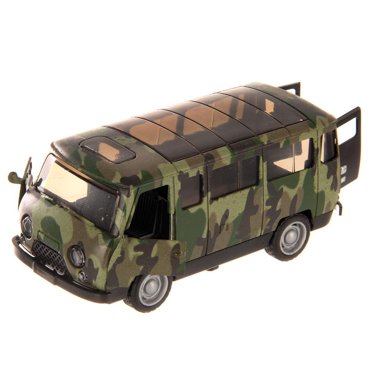 Металлический корпус, катается вперед и назад, оснащена инерционным механизмом, открываются дверки салона и дверки фургона, колеса прорезинены. При нажатии на передние колеса издает звуки заводящегося двигателя и едущего транспорта, подсветка передних фар.