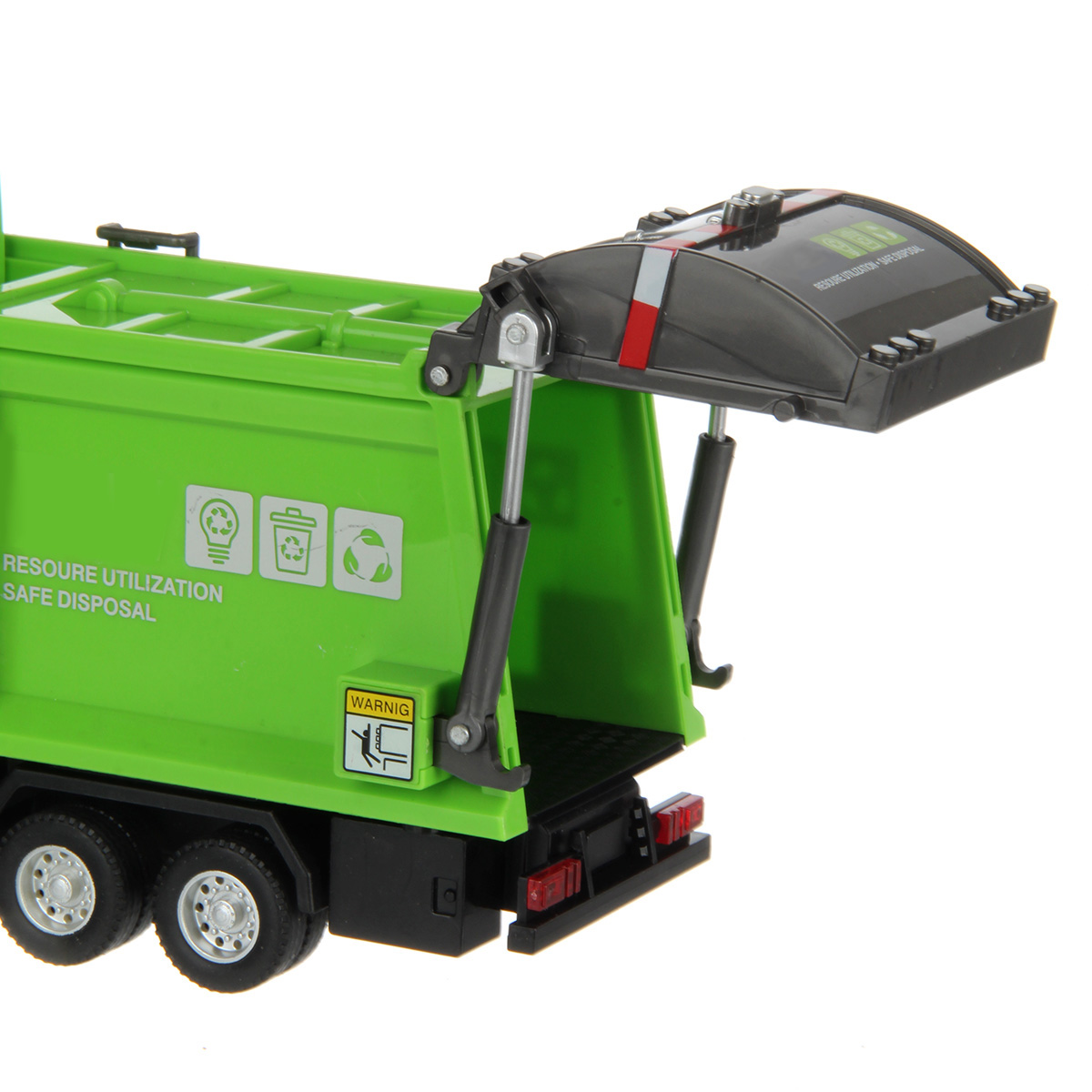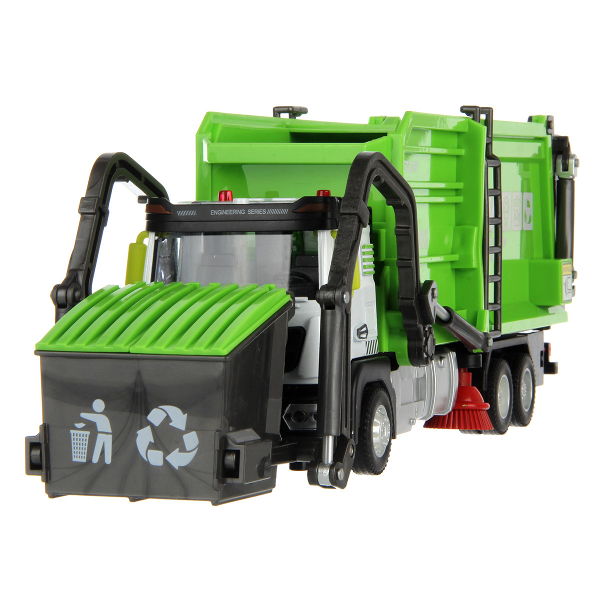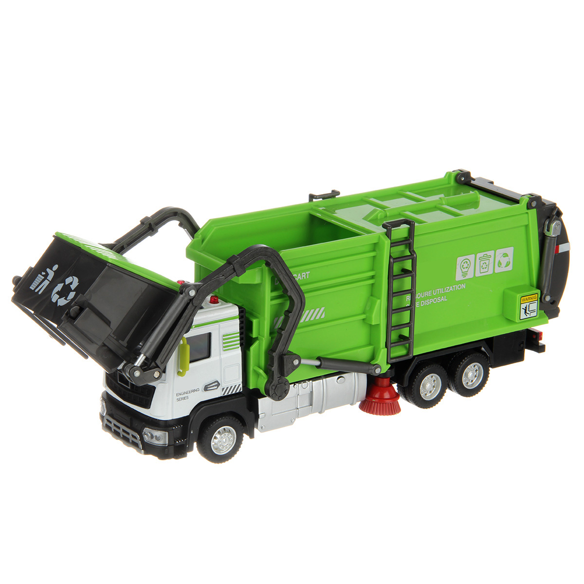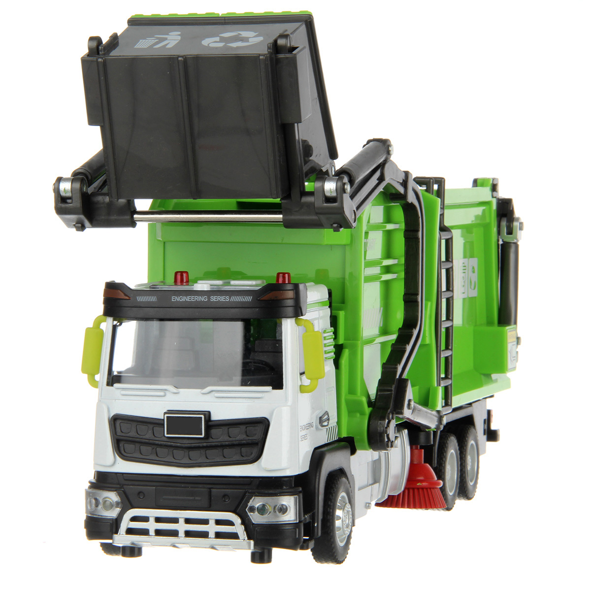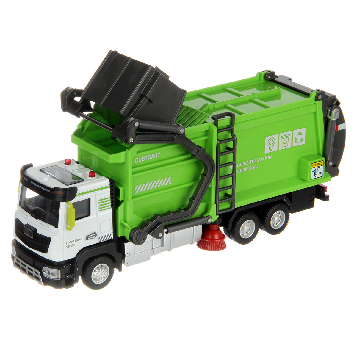 Игрушечный мусоровоз с металлической кабиной, светом, звуком и подвижными элементами замечательно дополнит детский автопарк. Изготовлен из прочных и долговечных материалов в качественном исполнении. Игрушка машинка оформлена в классическом дизайне и яркой расцветке. Обладает прорезиненными колесами и боковыми зеркалами. Прозрачные окна в кабине, видно салон. На днище игрушечного грузовика есть 2 боковые уборочные щетки. Подсветка передних фар и лампочек на крыше включается нажатием на передние колёса. Издаёт звуки бибиканья, заводящегося мотора, сигнала парковки. Всего 3 разных звука, переключаются повторным нажатием на передние колёса. Игрушечная спецтехника катается вперёд и назад, оснащена инерционным механизмом. Мусорный бак можно закрепить в подъемном механизме. Подъемный механизм можно поднимать и опускать вручную. У мусорного бака поднимается и опускается крышка, состоящая из двух половинок. Задняя крышка кузова вручную поднимается вверх. Такая машинка мусоровоз станет замечательным подарком мальчику на новый год, день рождения, 23 февраля и на любой другой повод. С таким игрушечным транспортом ребёнок будет с удовольствием развивать своё воображение, мелкую моторику и придумывать сюжетные игры Работает от 3 батареек AG 13, входят в комплект. Масштаб 1к40. Изготовлено из высококачественного полимера и металла. Размер игрушечной машинки с опущенным подъемным механизмом 31х8х10 см, размер с поднятым механизмом 26х8х15 см. Размер мусорного бака 5х5х5 см. Размер коробки 37х9х16 см.