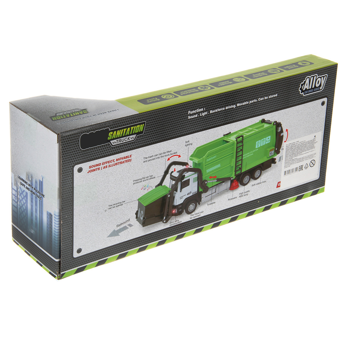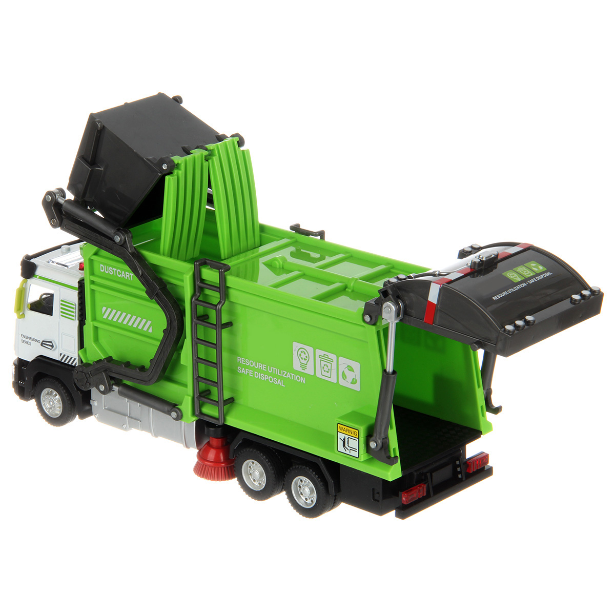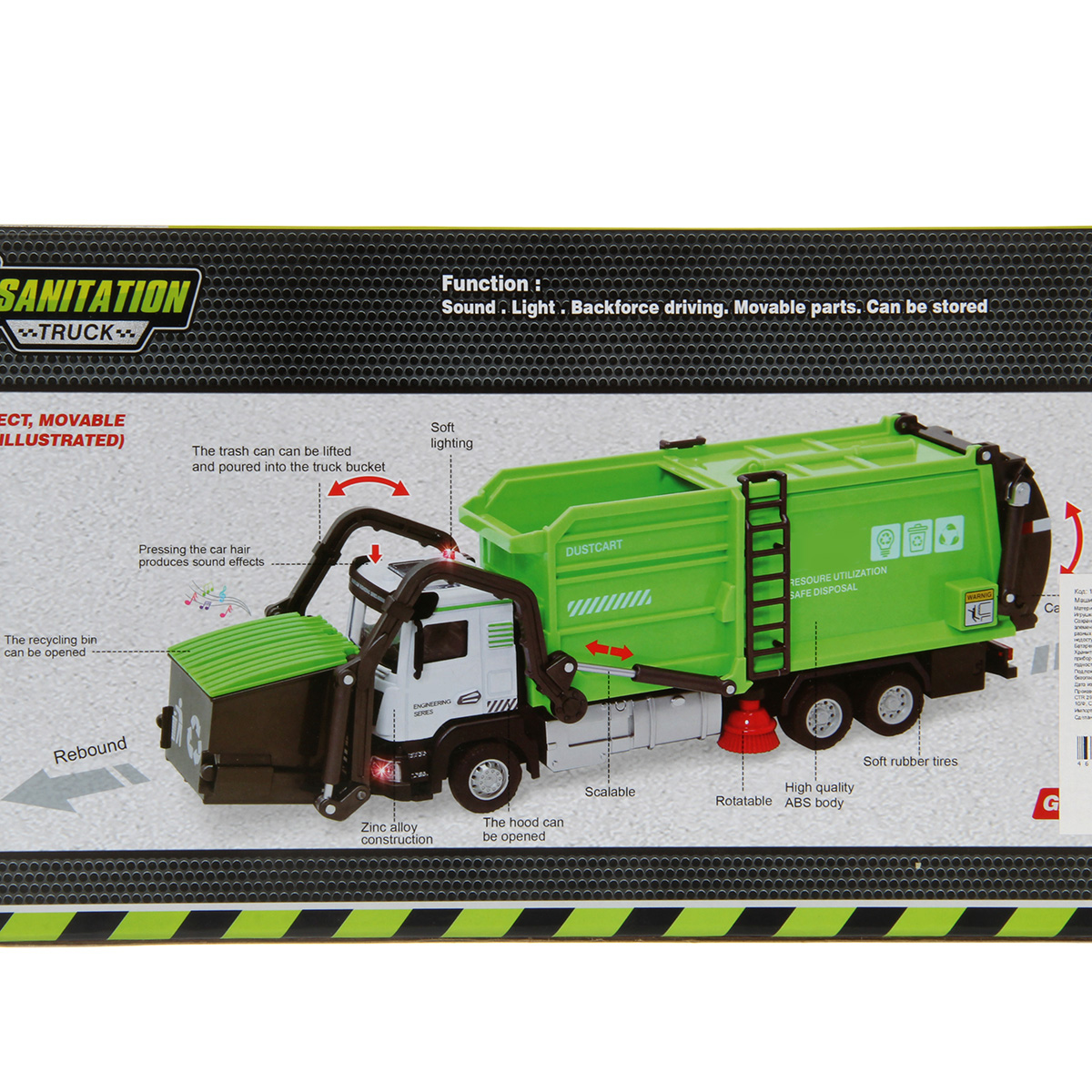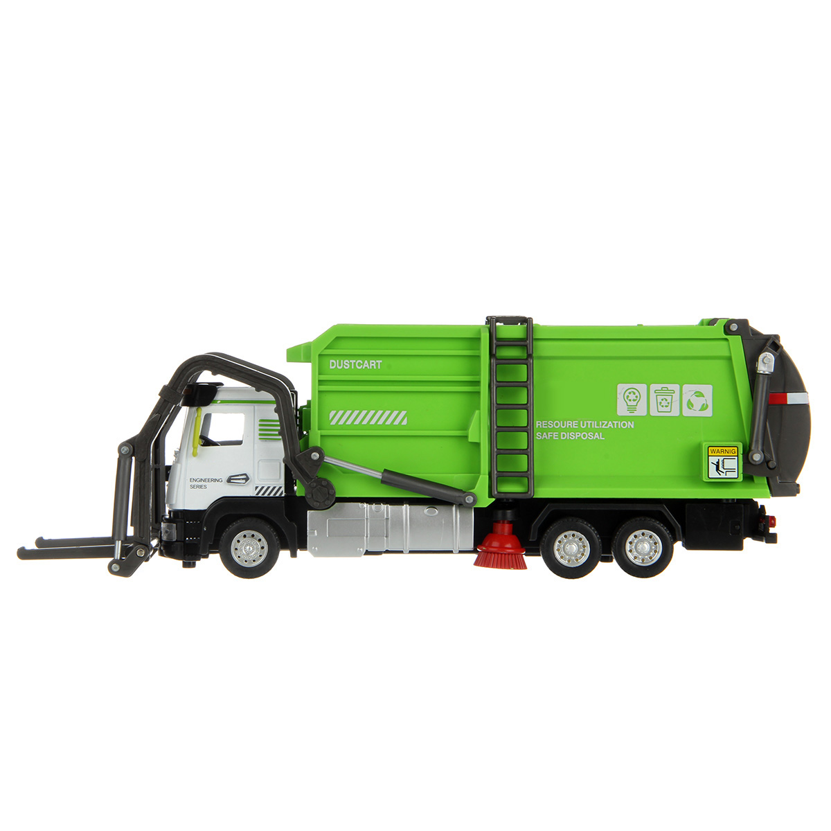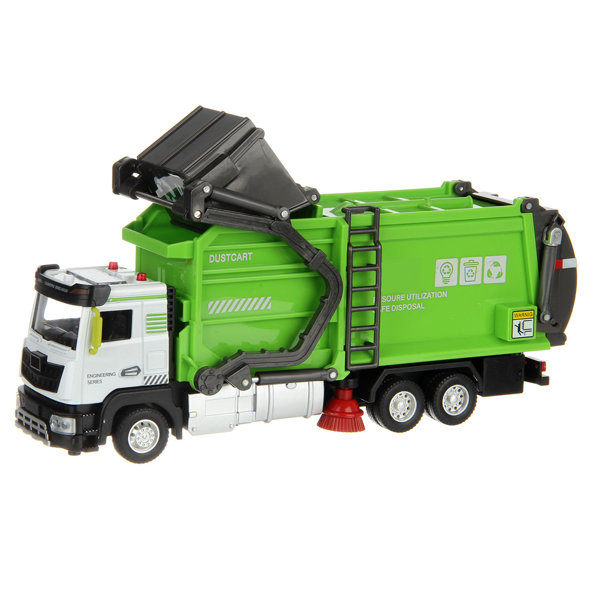 Игрушечный мусоровоз с металлической кабиной, светом, звуком и подвижными элементами замечательно дополнит детский автопарк. Изготовлен из прочных и долговечных материалов в качественном исполнении. Игрушка машинка оформлена в классическом дизайне и яркой расцветке. Обладает прорезиненными колесами и боковыми зеркалами. Прозрачные окна в кабине, видно салон. На днище игрушечного грузовика есть 2 боковые уборочные щетки. Подсветка передних фар и лампочек на крыше включается нажатием на передние колёса. Издаёт звуки бибиканья, заводящегося мотора, сигнала парковки. Всего 3 разных звука, переключаются повторным нажатием на передние колёса. Игрушечная спецтехника катается вперёд и назад, оснащена инерционным механизмом. Мусорный бак можно закрепить в подъемном механизме. Подъемный механизм можно поднимать и опускать вручную. У мусорного бака поднимается и опускается крышка, состоящая из двух половинок. Задняя крышка кузова вручную поднимается вверх. Такая машинка мусоровоз станет замечательным подарком мальчику на новый год, день рождения, 23 февраля и на любой другой повод. С таким игрушечным транспортом ребёнок будет с удовольствием развивать своё воображение, мелкую моторику и придумывать сюжетные игры Работает от 3 батареек AG 13, входят в комплект. Масштаб 1к40. Изготовлено из высококачественного полимера и металла. Размер игрушечной машинки с опущенным подъемным механизмом 31х8х10 см, размер с поднятым механизмом 26х8х15 см. Размер мусорного бака 5х5х5 см. Размер коробки 37х9х16 см.