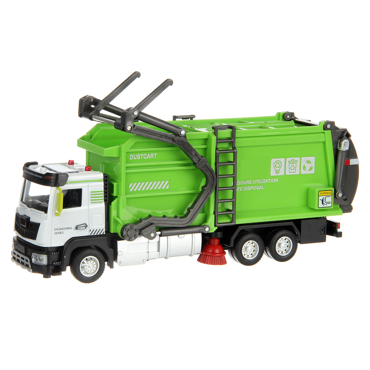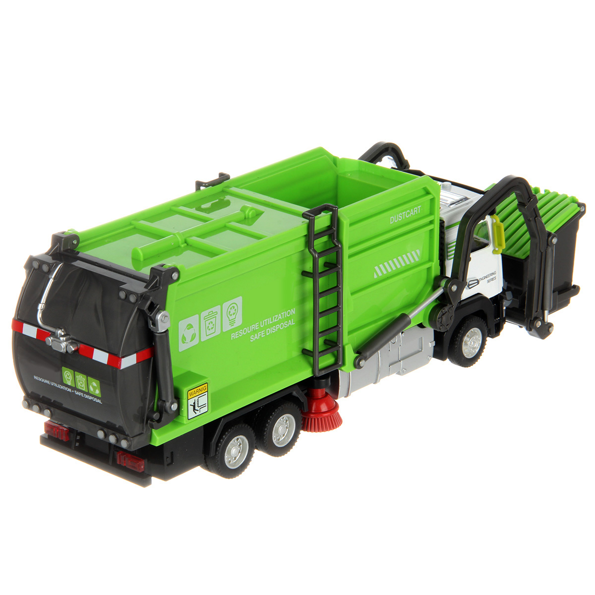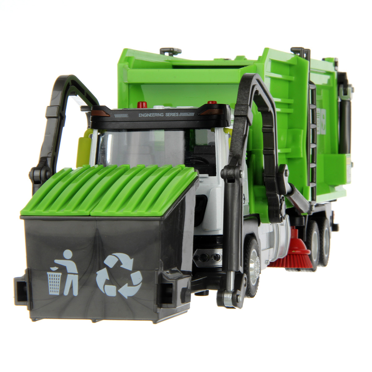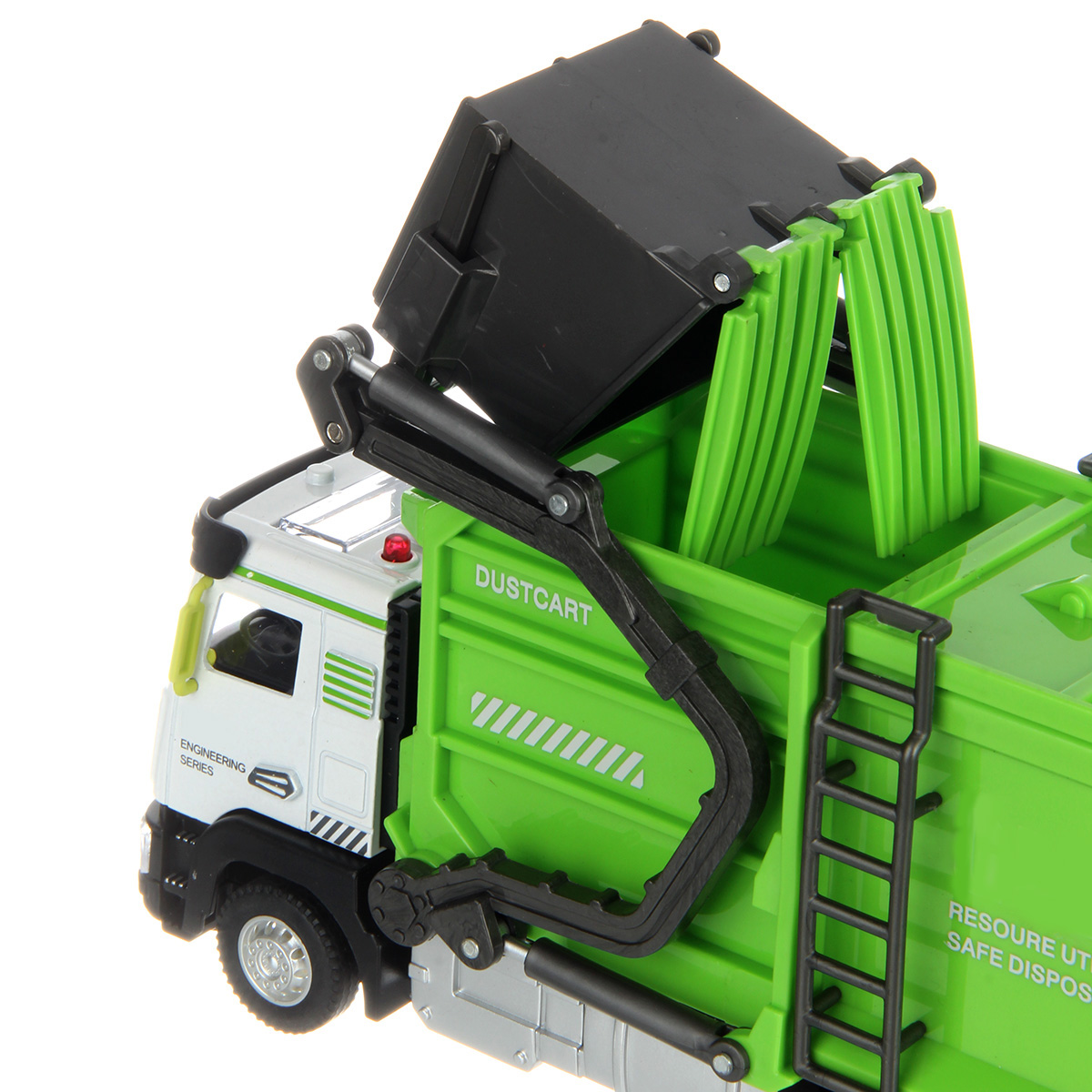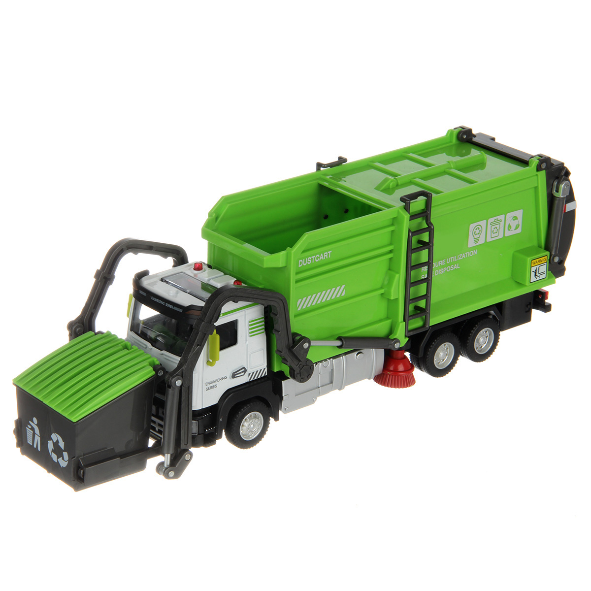 Игрушечный мусоровоз с металлической кабиной, светом, звуком и подвижными элементами замечательно дополнит детский автопарк. Изготовлен из прочных и долговечных материалов в качественном исполнении. Игрушка машинка оформлена в классическом дизайне и яркой расцветке. Обладает прорезиненными колесами и боковыми зеркалами. Прозрачные окна в кабине, видно салон. На днище игрушечного грузовика есть 2 боковые уборочные щетки. Подсветка передних фар и лампочек на крыше включается нажатием на передние колёса. Издаёт звуки бибиканья, заводящегося мотора, сигнала парковки. Всего 3 разных звука, переключаются повторным нажатием на передние колёса. Игрушечная спецтехника катается вперёд и назад, оснащена инерционным механизмом. Мусорный бак можно закрепить в подъемном механизме. Подъемный механизм можно поднимать и опускать вручную. У мусорного бака поднимается и опускается крышка, состоящая из двух половинок. Задняя крышка кузова вручную поднимается вверх. Такая машинка мусоровоз станет замечательным подарком мальчику на новый год, день рождения, 23 февраля и на любой другой повод. С таким игрушечным транспортом ребёнок будет с удовольствием развивать своё воображение, мелкую моторику и придумывать сюжетные игры Работает от 3 батареек AG 13, входят в комплект. Масштаб 1к40. Изготовлено из высококачественного полимера и металла. Размер игрушечной машинки с опущенным подъемным механизмом 31х8х10 см, размер с поднятым механизмом 26х8х15 см. Размер мусорного бака 5х5х5 см. Размер коробки 37х9х16 см.