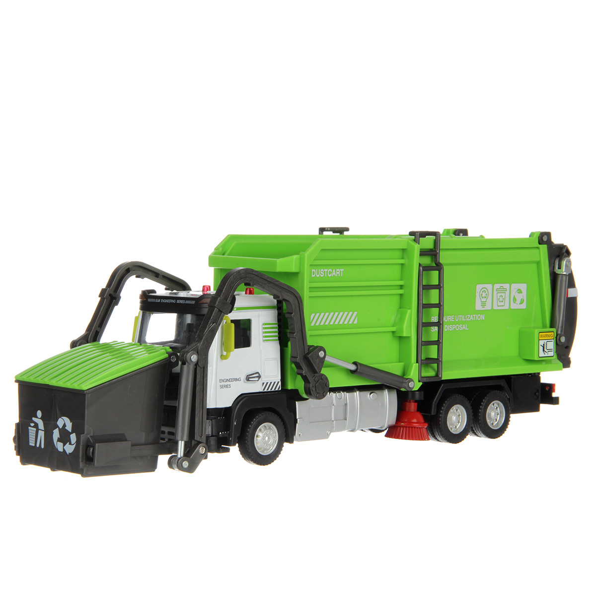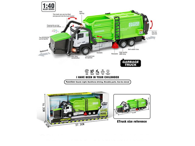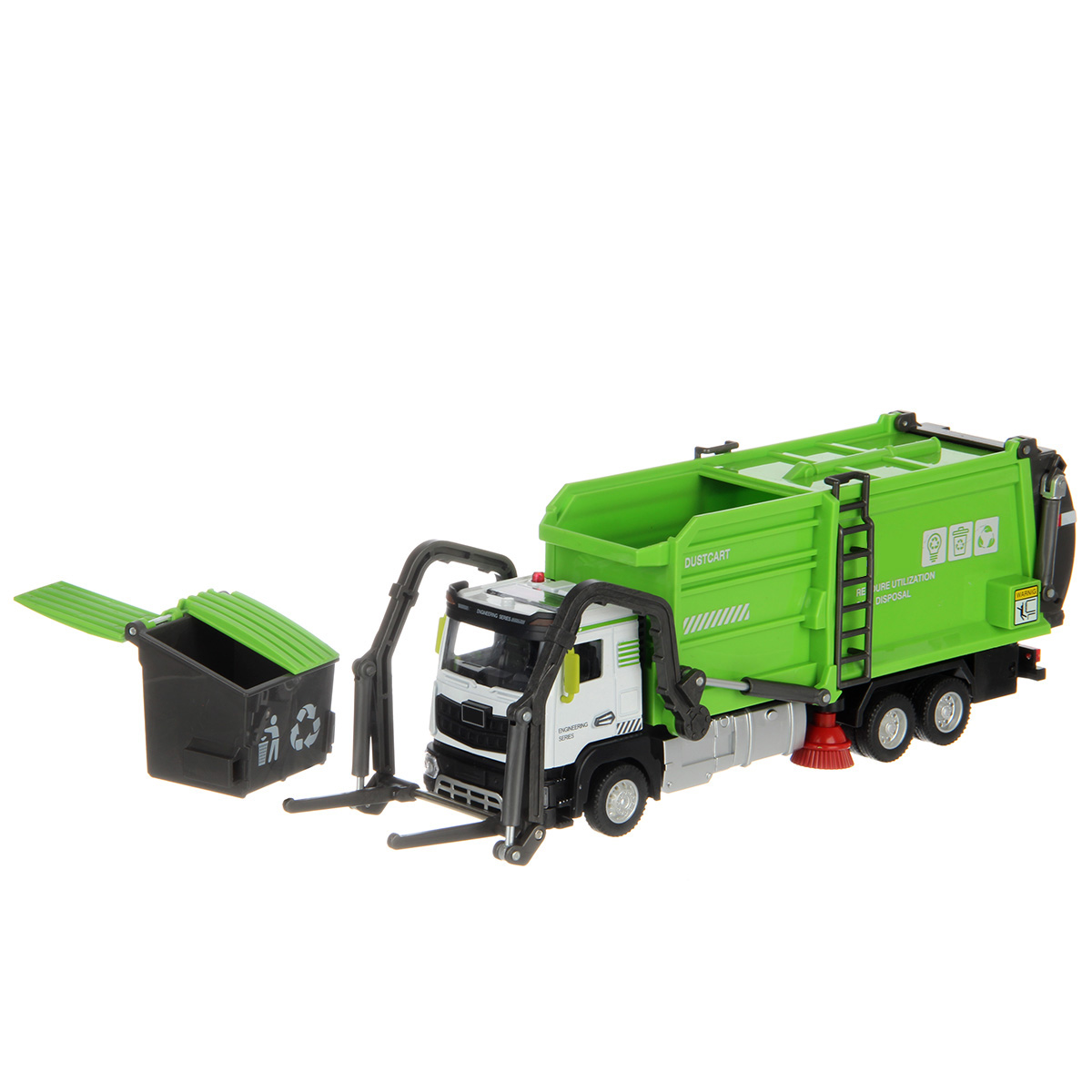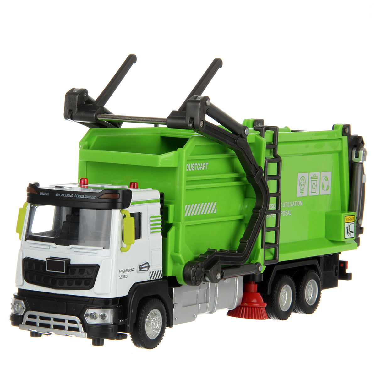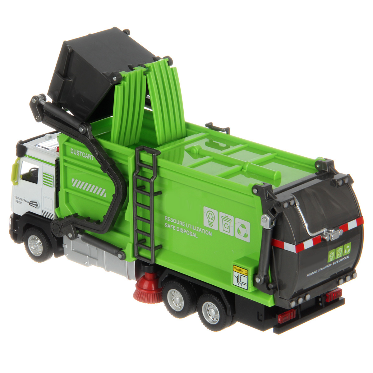 Игрушечный мусоровоз с металлической кабиной, светом, звуком и подвижными элементами замечательно дополнит детский автопарк. Изготовлен из прочных и долговечных материалов в качественном исполнении. Игрушка машинка оформлена в классическом дизайне и яркой расцветке. Обладает прорезиненными колесами и боковыми зеркалами. Прозрачные окна в кабине, видно салон. На днище игрушечного грузовика есть 2 боковые уборочные щетки. Подсветка передних фар и лампочек на крыше включается нажатием на передние колёса. Издаёт звуки бибиканья, заводящегося мотора, сигнала парковки. Всего 3 разных звука, переключаются повторным нажатием на передние колёса. Игрушечная спецтехника катается вперёд и назад, оснащена инерционным механизмом. Мусорный бак можно закрепить в подъемном механизме. Подъемный механизм можно поднимать и опускать вручную. У мусорного бака поднимается и опускается крышка, состоящая из двух половинок. Задняя крышка кузова вручную поднимается вверх. Такая машинка мусоровоз станет замечательным подарком мальчику на новый год, день рождения, 23 февраля и на любой другой повод. С таким игрушечным транспортом ребёнок будет с удовольствием развивать своё воображение, мелкую моторику и придумывать сюжетные игры Работает от 3 батареек AG 13, входят в комплект. Масштаб 1к40. Изготовлено из высококачественного полимера и металла. Размер игрушечной машинки с опущенным подъемным механизмом 31х8х10 см, размер с поднятым механизмом 26х8х15 см. Размер мусорного бака 5х5х5 см. Размер коробки 37х9х16 см.