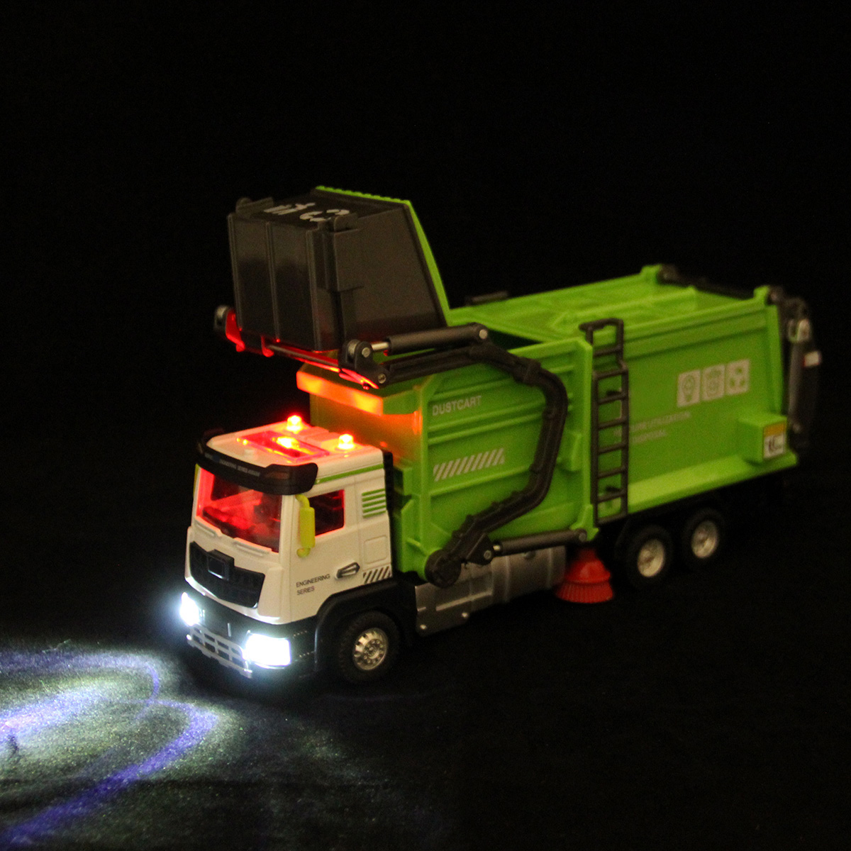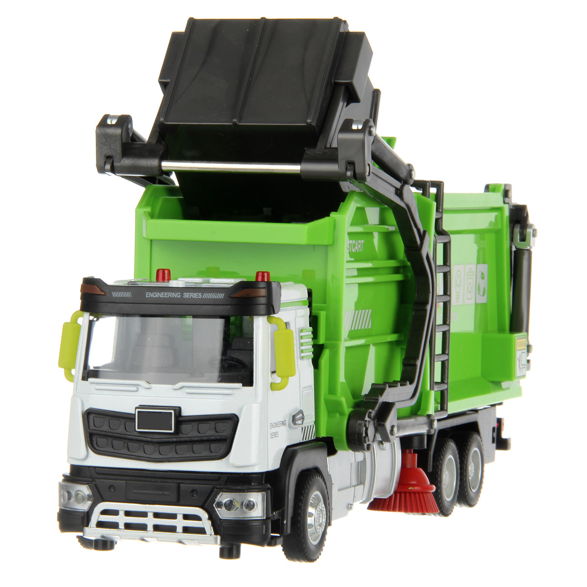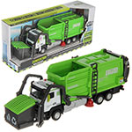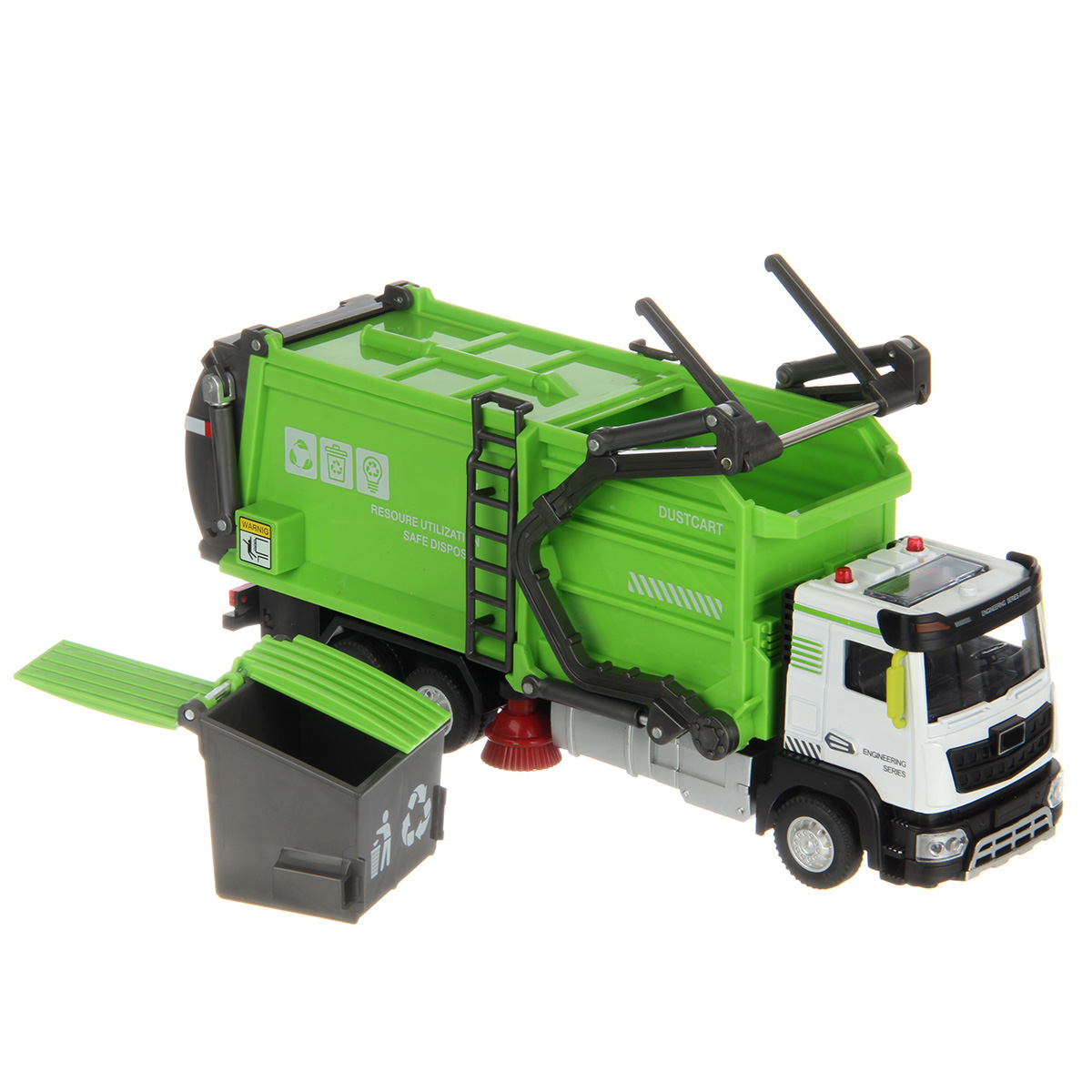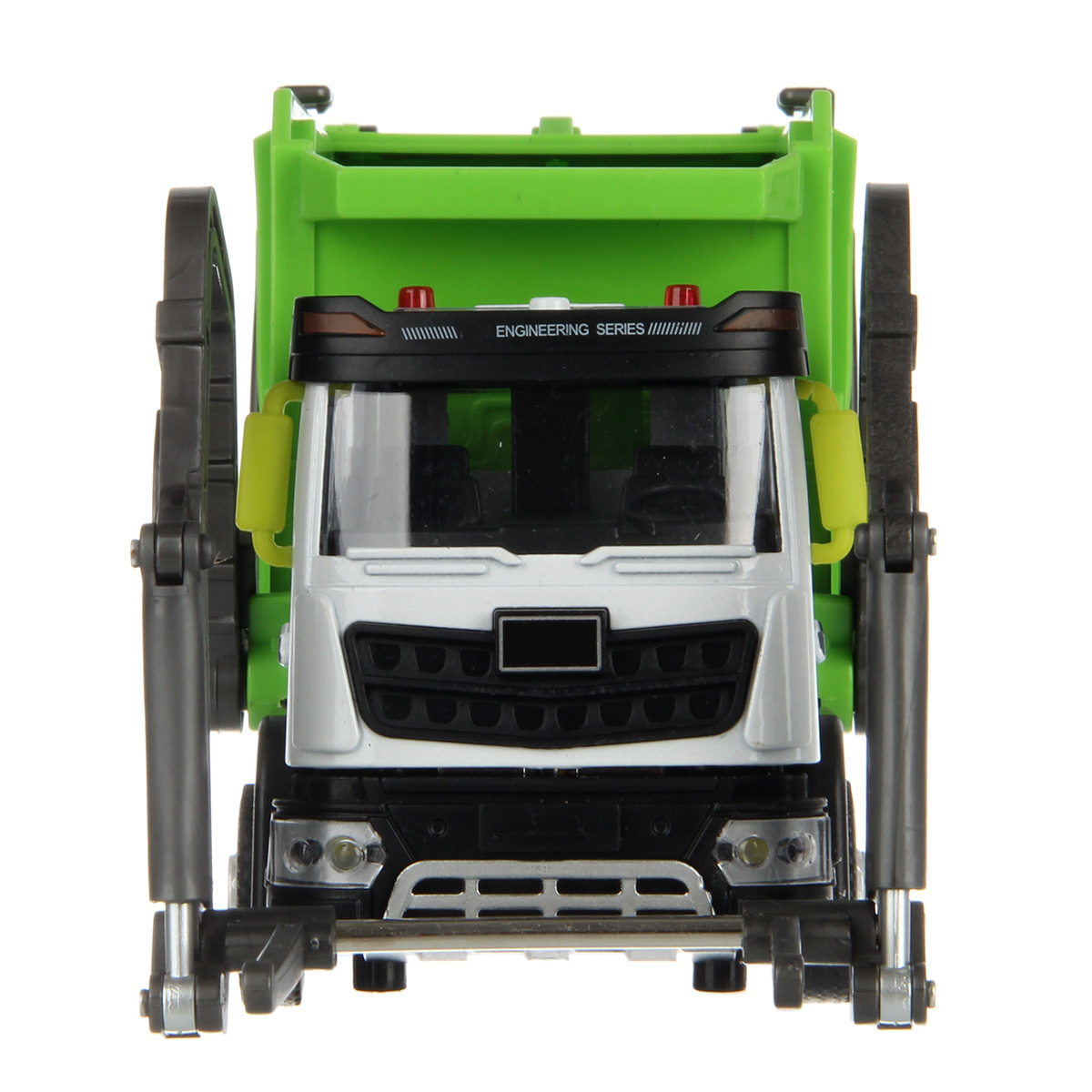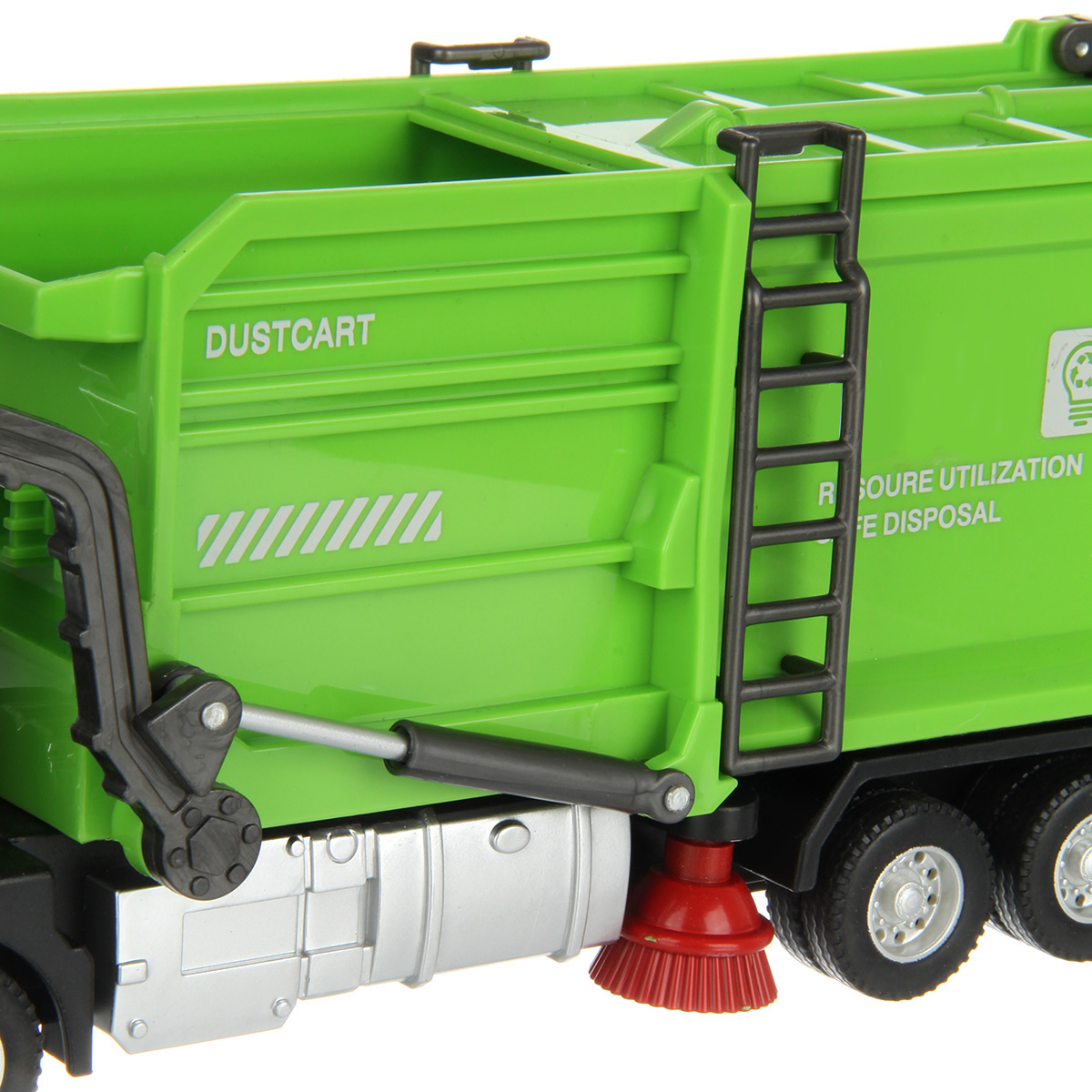 Игрушечный мусоровоз с металлической кабиной, светом, звуком и подвижными элементами замечательно дополнит детский автопарк. Изготовлен из прочных и долговечных материалов в качественном исполнении. Игрушка машинка оформлена в классическом дизайне и яркой расцветке. Обладает прорезиненными колесами и боковыми зеркалами. Прозрачные окна в кабине, видно салон. На днище игрушечного грузовика есть 2 боковые уборочные щетки. Подсветка передних фар и лампочек на крыше включается нажатием на передние колёса. Издаёт звуки бибиканья, заводящегося мотора, сигнала парковки. Всего 3 разных звука, переключаются повторным нажатием на передние колёса. Игрушечная спецтехника катается вперёд и назад, оснащена инерционным механизмом. Мусорный бак можно закрепить в подъемном механизме. Подъемный механизм можно поднимать и опускать вручную. У мусорного бака поднимается и опускается крышка, состоящая из двух половинок. Задняя крышка кузова вручную поднимается вверх. Такая машинка мусоровоз станет замечательным подарком мальчику на новый год, день рождения, 23 февраля и на любой другой повод. С таким игрушечным транспортом ребёнок будет с удовольствием развивать своё воображение, мелкую моторику и придумывать сюжетные игры Работает от 3 батареек AG 13, входят в комплект. Масштаб 1к40. Изготовлено из высококачественного полимера и металла. Размер игрушечной машинки с опущенным подъемным механизмом 31х8х10 см, размер с поднятым механизмом 26х8х15 см. Размер мусорного бака 5х5х5 см. Размер коробки 37х9х16 см.