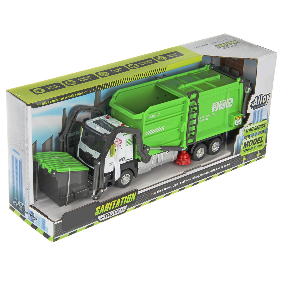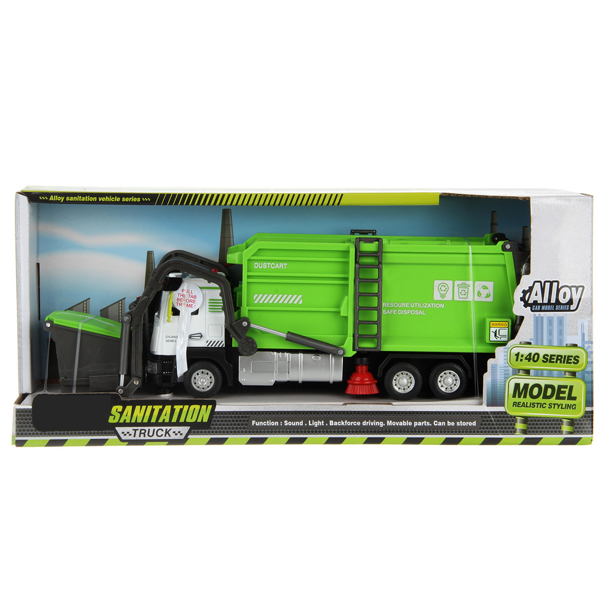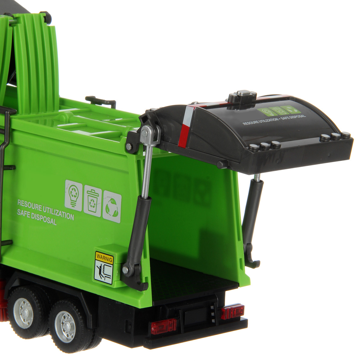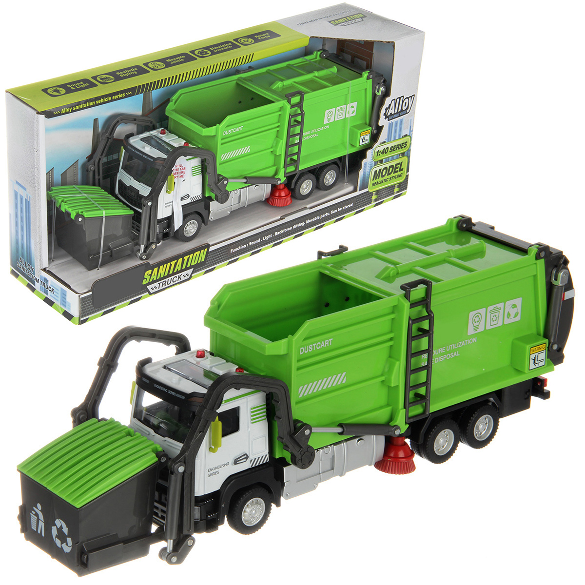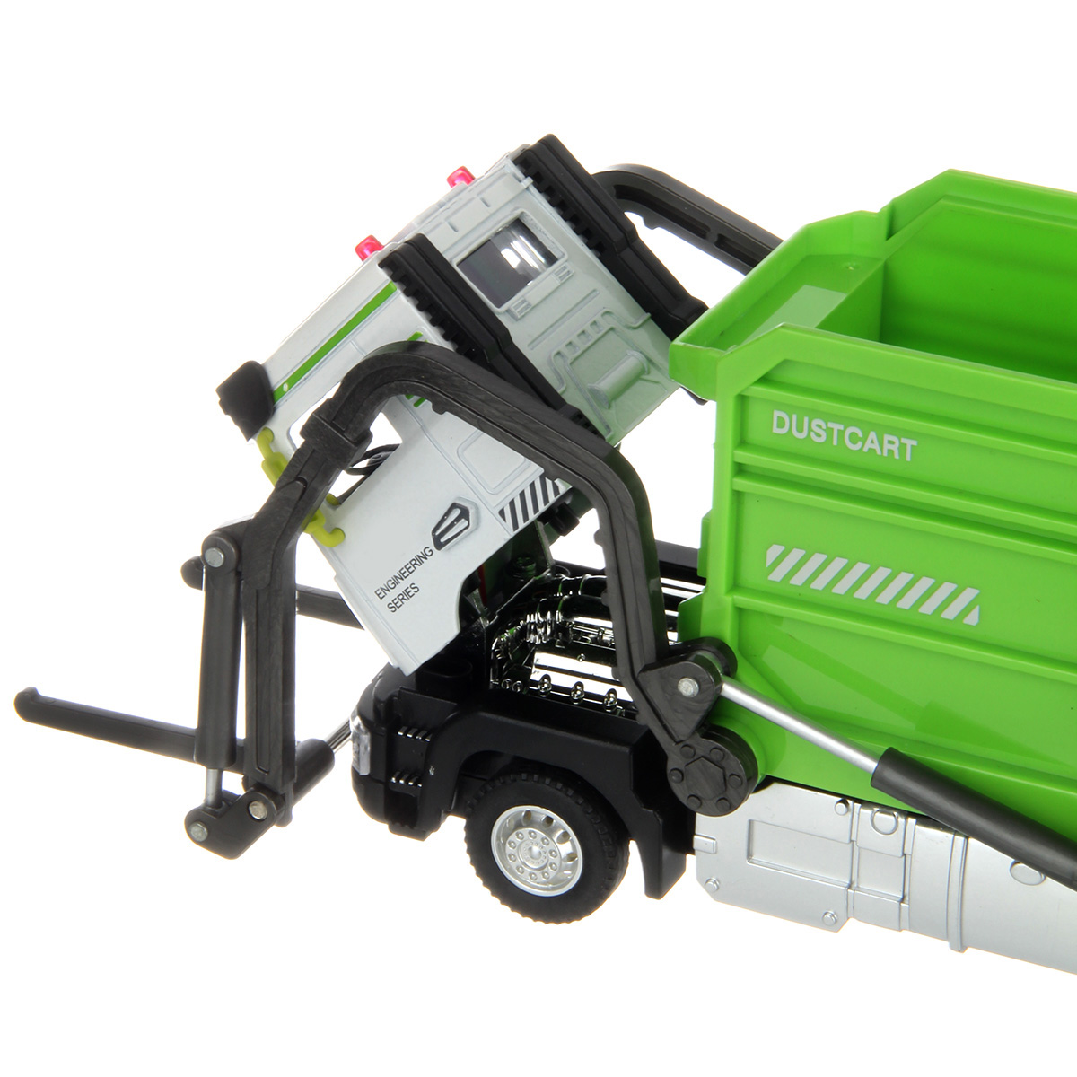Игрушечный мусоровоз с металлической кабиной, светом, звуком и подвижными элементами замечательно дополнит детский автопарк. Изготовлен из прочных и долговечных материалов в качественном исполнении. Игрушка машинка оформлена в классическом дизайне и яркой расцветке. Обладает прорезиненными колесами и боковыми зеркалами. Прозрачные окна в кабине, видно салон. На днище игрушечного грузовика есть 2 боковые уборочные щетки. Подсветка передних фар и лампочек на крыше включается нажатием на передние колёса. Издаёт звуки бибиканья, заводящегося мотора, сигнала парковки. Всего 3 разных звука, переключаются повторным нажатием на передние колёса. Игрушечная спецтехника катается вперёд и назад, оснащена инерционным механизмом. Мусорный бак можно закрепить в подъемном механизме. Подъемный механизм можно поднимать и опускать вручную. У мусорного бака поднимается и опускается крышка, состоящая из двух половинок. Задняя крышка кузова вручную поднимается вверх. Такая машинка мусоровоз станет замечательным подарком мальчику на новый год, день рождения, 23 февраля и на любой другой повод. С таким игрушечным транспортом ребёнок будет с удовольствием развивать своё воображение, мелкую моторику и придумывать сюжетные игры Работает от 3 батареек AG 13, входят в комплект. Масштаб 1к40. Изготовлено из высококачественного полимера и металла. Размер игрушечной машинки с опущенным подъемным механизмом 31х8х10 см, размер с поднятым механизмом 26х8х15 см. Размер мусорного бака 5х5х5 см. Размер коробки 37х9х16 см.