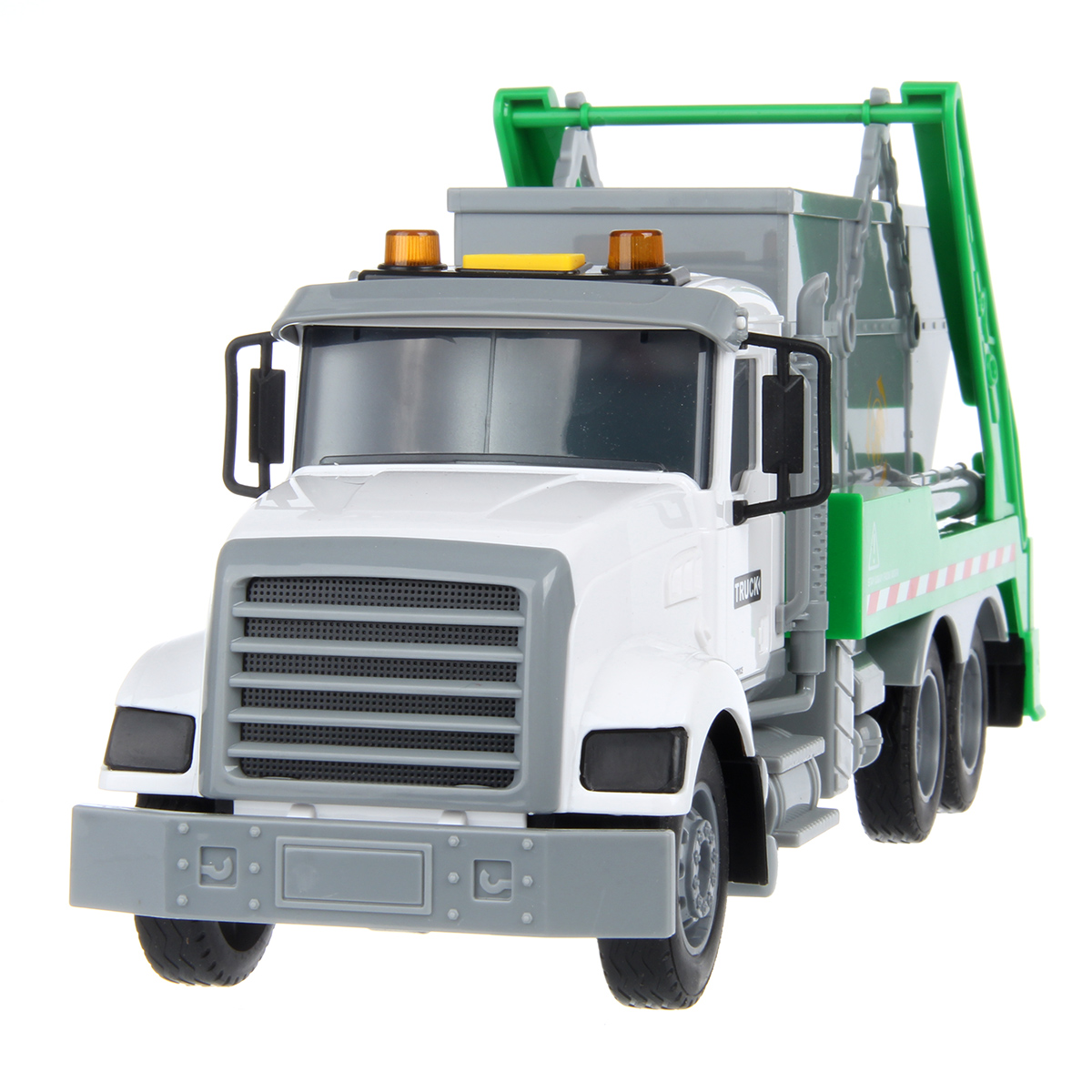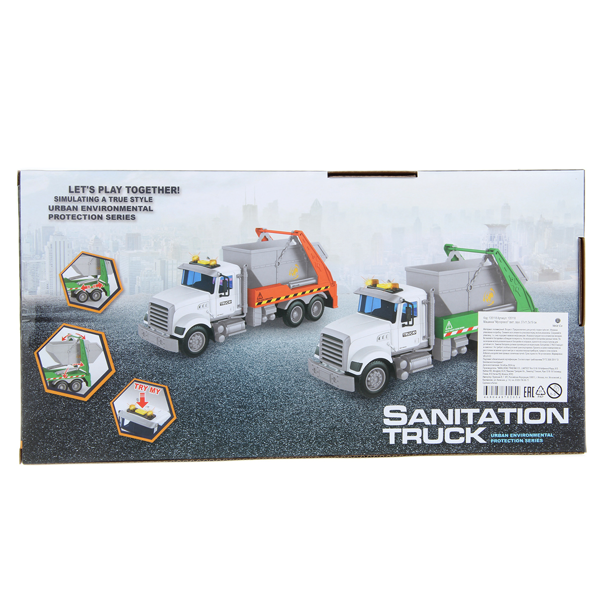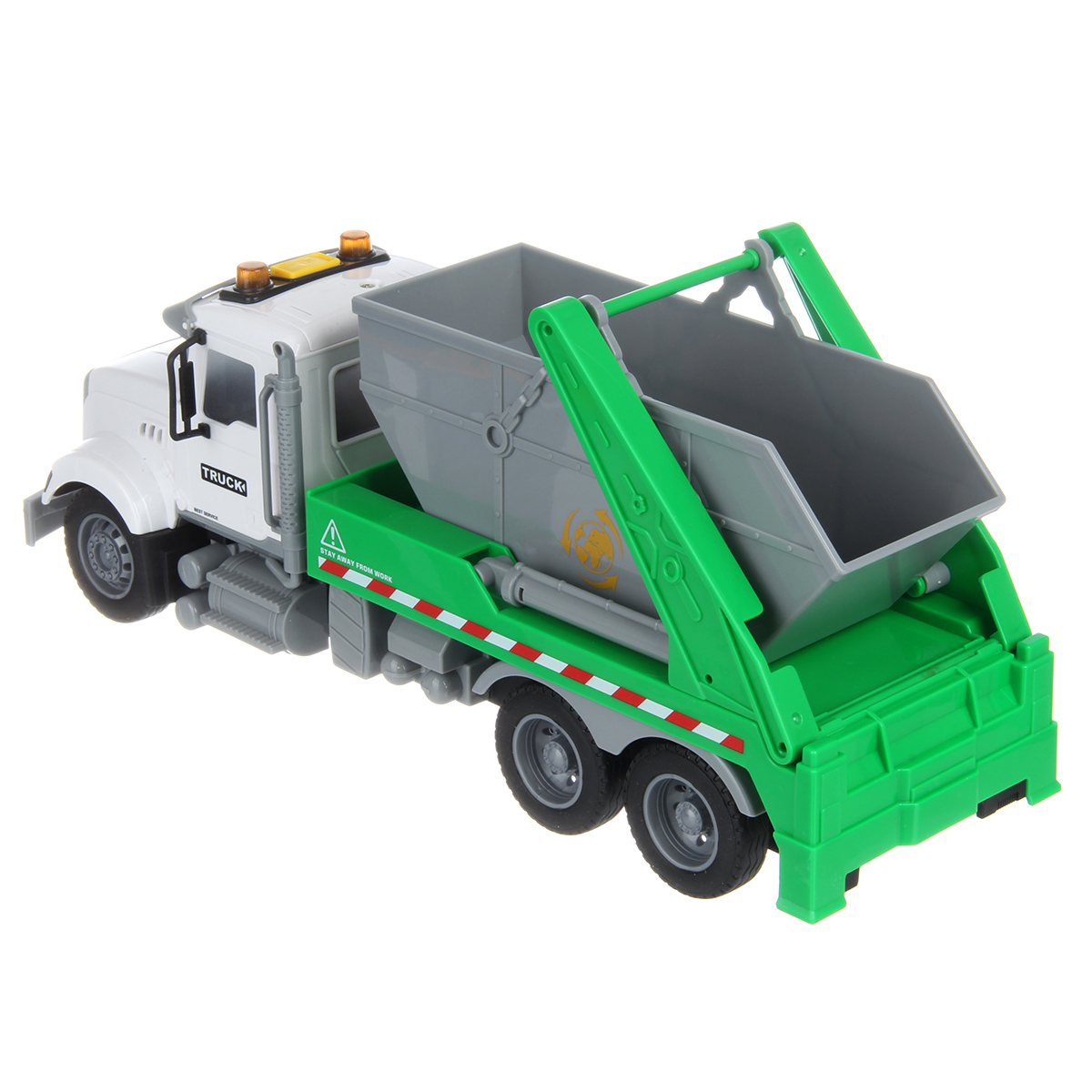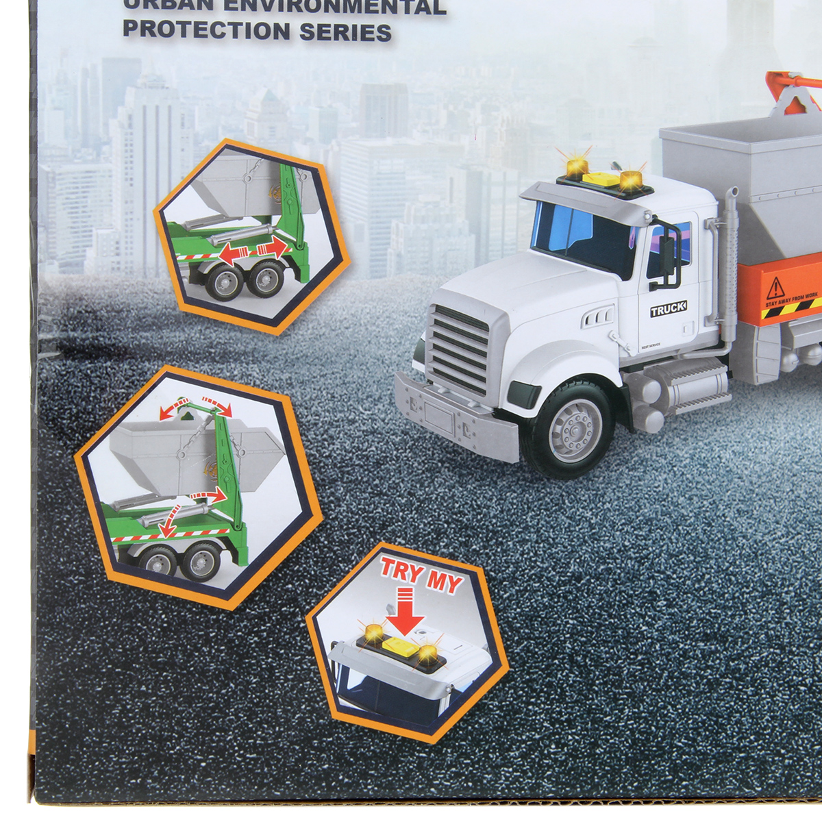 Большая машинка мусоровоз с подвижными деталями, звуковыми и световыми эффектами. Игрушка мусоровоз издает звуки заднего хода и гудка, имеет подсветку лампочек на кабине, можно играть в темное время суток.
