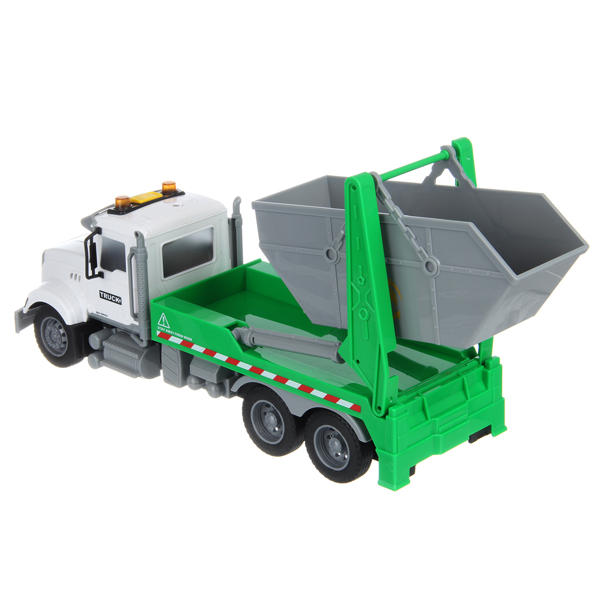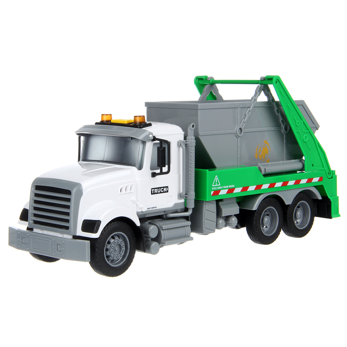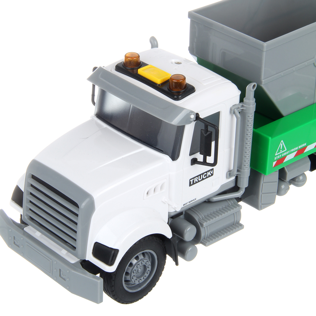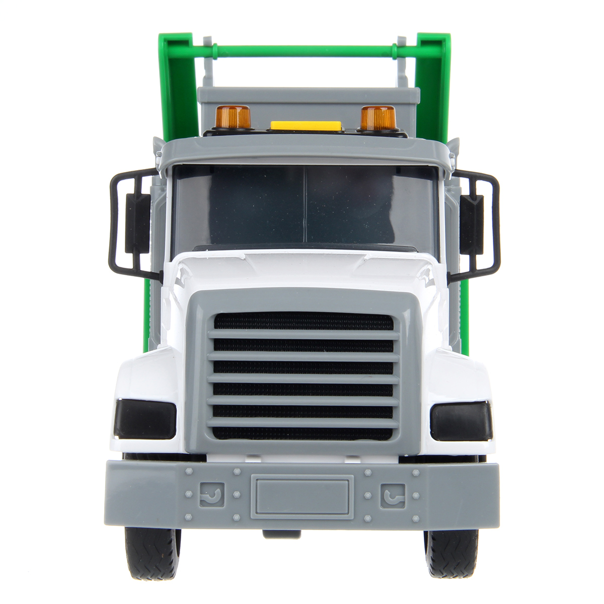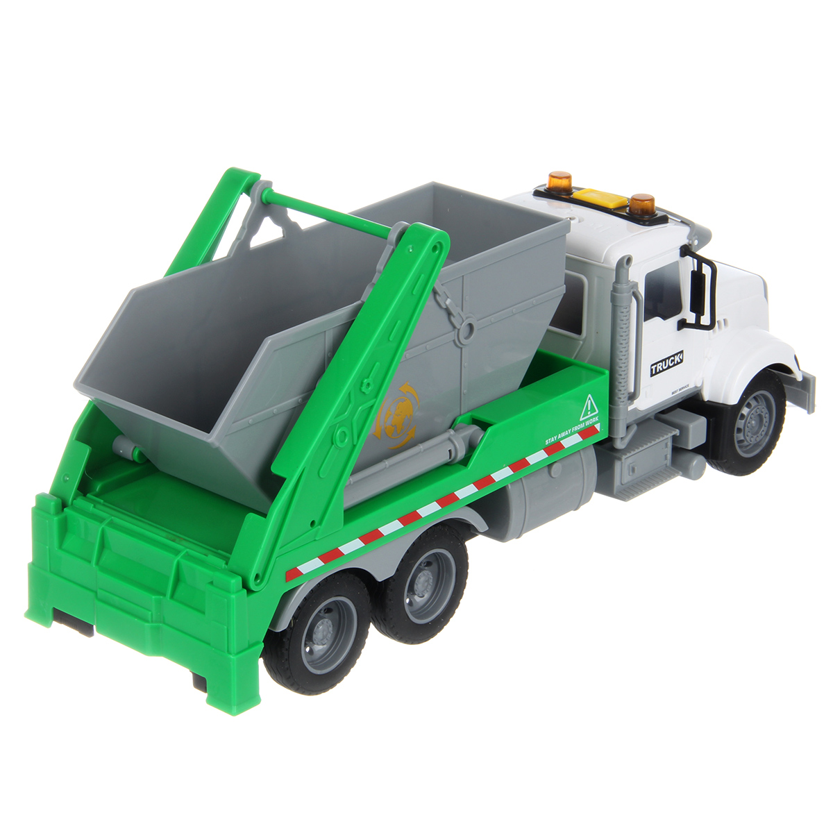 Большая машинка мусоровоз с подвижными деталями, звуковыми и световыми эффектами. Игрушка мусоровоз издает звуки заднего хода и гудка, имеет подсветку лампочек на кабине, можно играть в темное время суток.