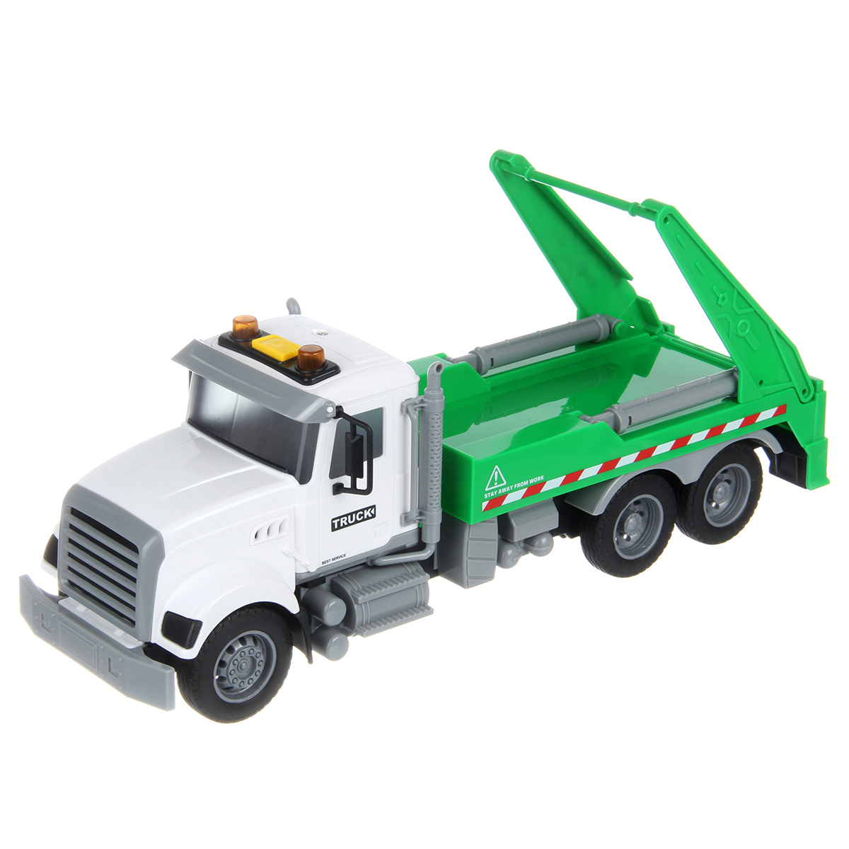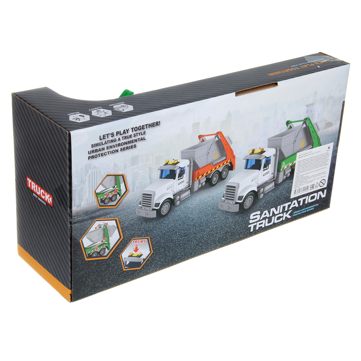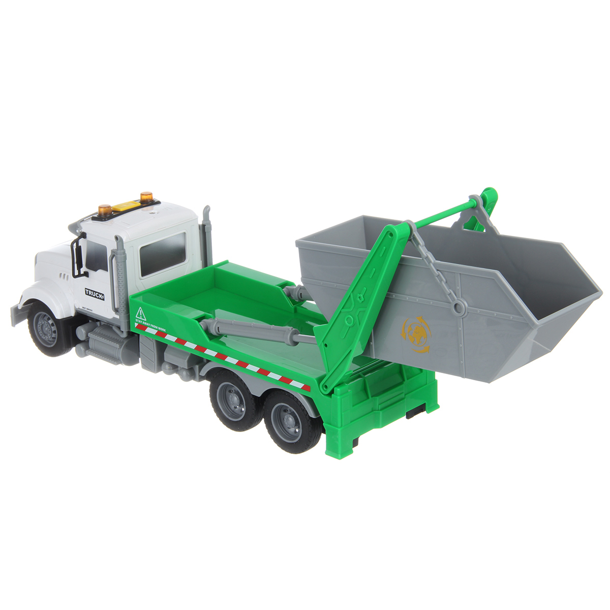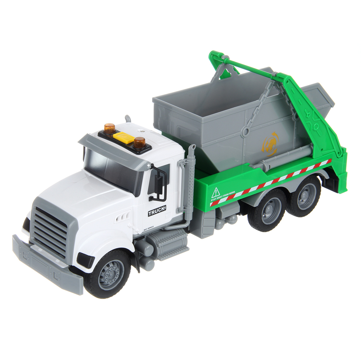 Большая машинка мусоровоз с подвижными деталями, звуковыми и световыми эффектами. Игрушка мусоровоз издает звуки заднего хода и гудка, имеет подсветку лампочек на кабине, можно играть в темное время суток.