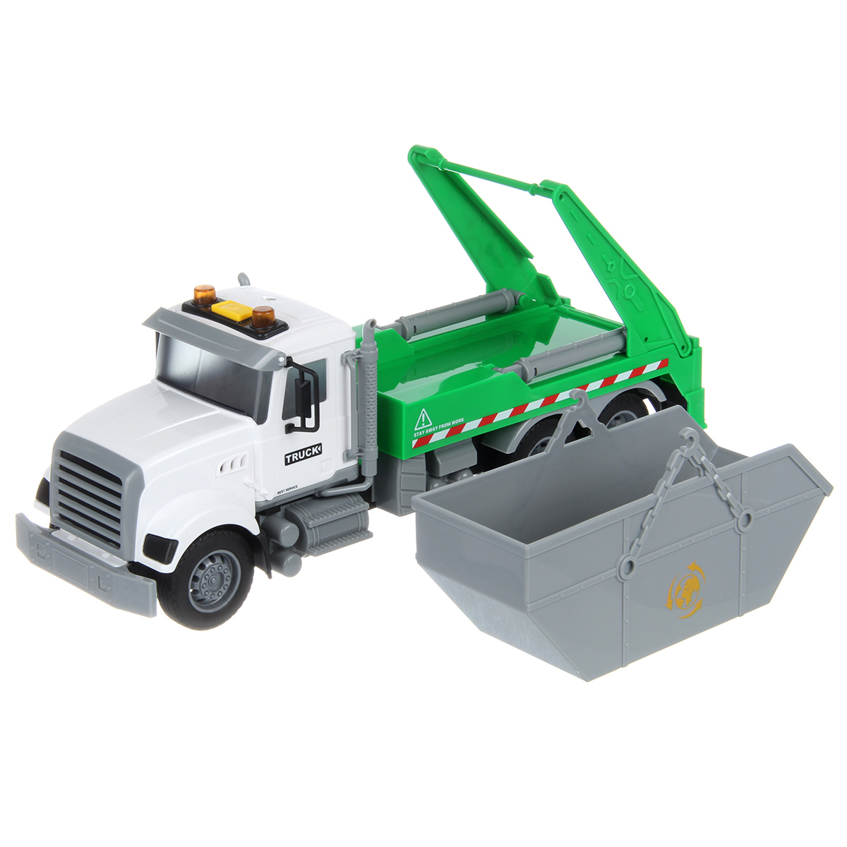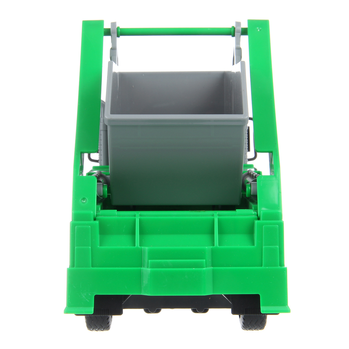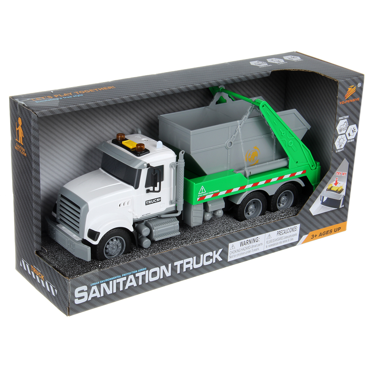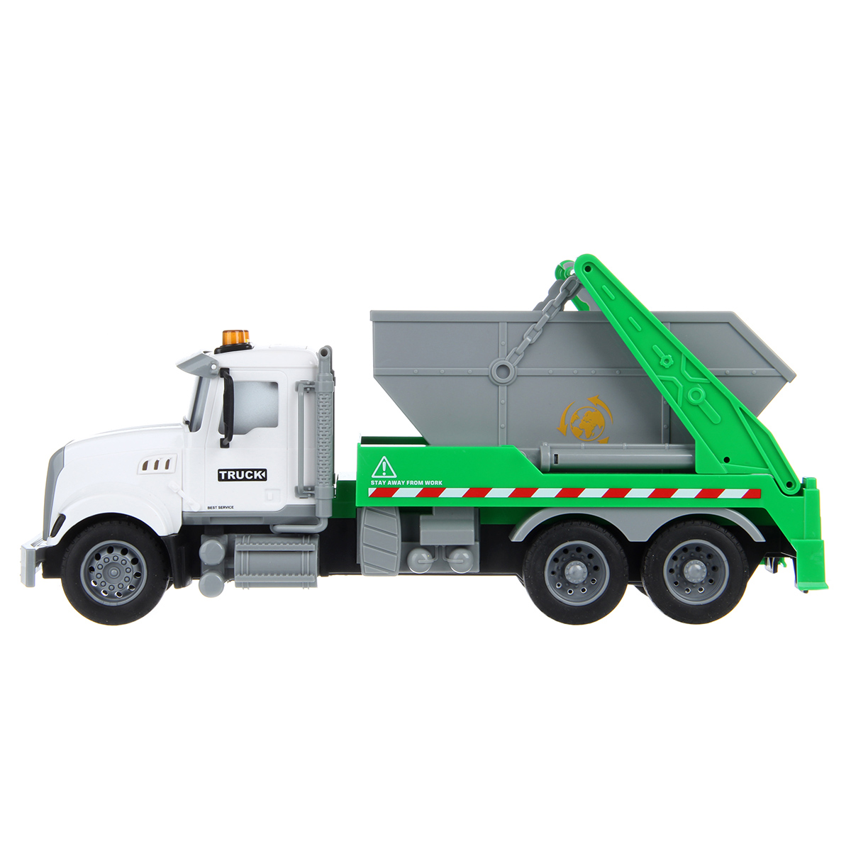 Большая машинка мусоровоз с подвижными деталями, звуковыми и световыми эффектами. Игрушка мусоровоз издает звуки заднего хода и гудка, имеет подсветку лампочек на кабине, можно играть в темное время суток.